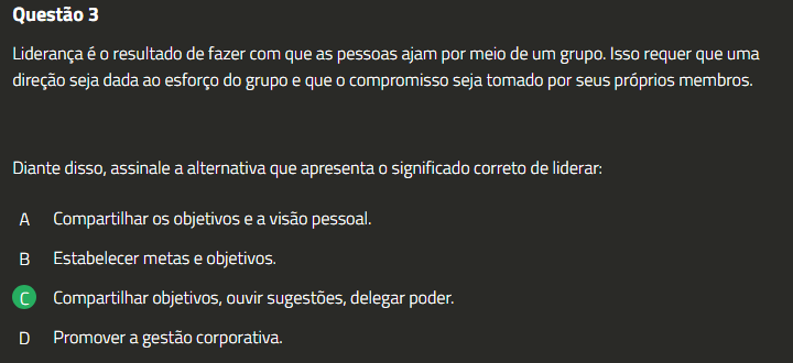 Questão 3 Liderança é resultado de fazer com que as pessoas ajam por meio de um grupo. Isso requer que uma direção seja dada ao esforço do grupo e que compromisso seja tomado por seus próprios membros. Diante disso, assinale a alternativa que apresenta significado correto de liderar: A Compartilhar os objetivos e a visão pessoal. B Estabelecer metas e objetivos. C Compartilhar objetivos, ouvir sugestões, delegar poder. D Promover a gestão corporativa.