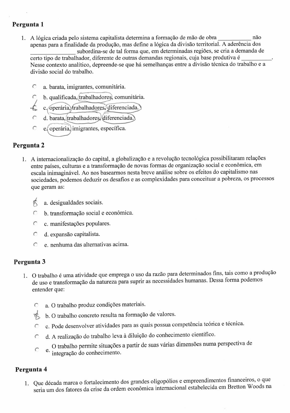 Pergunta 1 1. A lógica criada pelo sistema capitalista determina a formação de mão de obra não apenas para a finalidade da produção, mas define a lógica da divisão territorial. A aderência dos subordina-se de tal forma que, em determinadas regiões, se cria a demanda de certo tipo de trabalhador, diferente de outras demandas regionais, cuja base produtiva é Nesse contexto analítico, depreende-se que há semelhanças entre a divisão técnica do trabalho e a divisão social do trabalho. a. barata, imigrantes, comunitária. b. qualificada, trabalhadores. comunitária. diferenciada. d. barata, trabalhadores diferenciada. e. operária, imigrantes, específica. Pergunta 2 1. A internacionalização do capital, a globalização e a revolução tecnológica possibilitaram relações entre países, culturas e a transformação de novas formas de organização social e econômica, em escala inimaginável. Ao nos basearmos nesta breve análise sobre os efeitos do capitalismo nas sociedades, podemos deduzir os desafios e as complexidades para conceituar a pobreza, os processos que geram as: a. desigualdades sociais. b. transformação social e econômica. manifestações populares. d. expansão capitalista. e. nenhuma das alternativas acima. Pergunta 3 1. O trabalho é uma atividade que emprega o uso da razão para determinados fins, tais como a produção de uso e transformação da natureza para suprir as necessidades humanas. Dessa forma podemos entender que: a. trabalho produz condições materiais. b. trabalho concreto resulta na formação de valores. Pode desenvolver atividades para as quais possua competência teórica e técnica. d. A realização do trabalho leva à diluição do conhecimento científico. trabalho permite situações a partir de suas várias dimensões numa perspectiva de e. integração do conhecimento. Pergunta 4 1. Que década marca o fortalecimento dos grandes oligopólios e empreendimentos financeiros, o que seria um dos fatores da crise da ordem econômica internacional estabelecida em Bretton Woods nadécada de 1970 e a retomada do processo de internacionalização do capital, com forte expansão das empresas multinacionais em regiões de periferia: a. década de 1950. b. década de 1920. década de 1980. d. década de 1930. e. nenhuma das alternativas. Pergunta 5 1. Pode-se claramente visualizar que o processo de desenvolvimento gerou profundas transformações , evidenciando a configuração da relação capital X trabalho e uma consequente divisão de classes sociais entre capitalistas (burgueses) e trabalhadores assalariados (proletários). a. culturais e sociais. b. sociais, culturais e econômicas. c. culturais, profissional e social. d. econômicas e culturais. e. nenhuma das alternativas anteriores. Pergunta 6 1. O capitalismo promove modificações estruturais, assim acaba criando a figura do trabalhador: a. prestativo. b. primário. coletivo. d. qualificado. e. todas as alternativas estão corretas. Pergunta 7 1. A autonomia nacional passava a depender de como os projetos de desenvolvimento das nações se apropriavam de modo dependente desse capital estrangeiro. No Brasil esse era o caso de Getúlio Vargas, que esperava industrializar o Brasil e garantir sua: a. homogeneidade. b. autonomia. c. independência. d. transparência. e.Pergunta 8 1. A institucionalização da assistência social enquanto política pública é resultado de muitas lutas dos: a. Movimentos sociais, das ONGs e profissionais da área. b. Movimentos populares, organização de trabalhadores, debates de intelectuais e profissionais. Intelectuais e profissionais. d. Organizações de trabalhadores e movimentos populares. e. Nenhuma das alternativas. Pergunta 9 1. No contexto da esfera pública da assistência social, dá-se maior destaque ao controle social como a representação legítima e efetiva dos interesses e das necessidades de um coletivo, para concretizar direitos e inibir ações individuais, interesses particulares que expressem clientelismo e favoritismos de qualquer espécie. A proposta de controle social é no sentido de tornar legítimas as ações de uma dada sociedade perante: a. O Estado. b. A iniciativa privada. Os trabalhadores rurais. d. O profissional de Serviço Social. e. Nenhuma das alternativas anteriores. Pergunta 10 1. Quando se busca analisar a situação da desigualdade social na cena contemporânea convém considerar: a. Análise ampla da questão social. b. Igualdade da sociedade. Os aspectos multidimensional e histórico. d. Expansão capitalista. e. Convivência social.