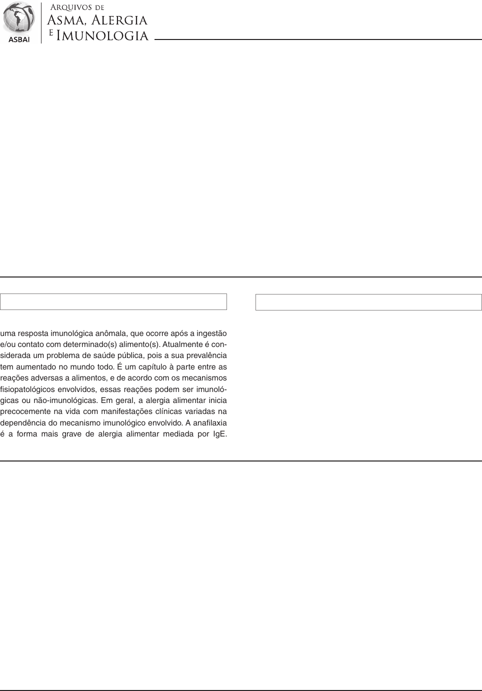 1. Universidade Federal de São Paulo, Disciplina de Alergia, Imunologia Clínica e Reumatologia - São Paulo, SP, Brasil. 2. Universidade Federal da Bahia, Departamento de Pediatria - Salvador, BA, Brasil. 3. Universidade Federal de Ciências da Saúde de Porto Alegre, Departamento de Pediatria - Porto Alegre, RS, Brasil. 4. Faculdade de Medicina do ABC, Departamento de Pediatria - Santo André, SP, Brasil. 5. Universidade de São Paulo, Instituto da Criança - São Paulo, SP, Brasil. 6. Universidade Federal do Triângulo Mineiro, Departamento de Pediatria - Uberaba, MG, Brasil. 7. Universidade Federal de São Paulo, Departamento de Pediatria - São Paulo, SP, Brasil. 8. Universidade do Estado do Pará, Departamento de Pediatria - Belém, PA, Brasil. 9. Universidade Federal da Bahia, Departamento de Alergia e Imunologia - Salvador, BA, Brasil. 10. Universidade Federal de Sergipe, Departamento de Pediatria - Aracaju, SE, Brasil. 11. Universidade Federal do Paraná, Departamento de Pediatria - Curitiba, PR, Brasil. 12. Universidade Federal do Rio de Janeiro, Departamento de Medicina - Rio de Janeiro, RJ, Brasil. 13. Universidade Federal de Pernambuco, Departamento de Pediatria - Recife, PE, Brasil. 14. Faculdade de Medicina da Universidade São Paulo, Disciplina de Imunologia e Alergia - São Paulo, SP, Brasil. 15. Universidade Federal do Rio Grande do Norte, Departamento de Pediatria - Natal, RN, Brasil. 16. Faculdade de Ciências Médicas da Santa Casa de São Paulo, Departamento de Pediatria - São Paulo, SP, Brasil. 17. Faculdade de Medicina da Pontifícia Universidade Católica, Departamento de Pediatria - Porto Alegre, RS, Brasil. 18. Universidade Federal do Estado do Rio de Janeiro, Disciplina de Alergia e Imunologia Clínica - Rio de Janeiro, RJ, Brasil. 7 A alergia alimentar é definida como uma doença consequente a uma resposta imunológica anômala, que ocorre após a ingestão e/ou contato com determinado(s) alimento(s). Atualmente é con- siderada um problema de saúde pública, pois a sua prevalência tem aumentado no mundo todo. É um capítulo à parte entre as reações adversas a alimentos, e de acordo com os mecanismos fisiopatológicos envolvidos, essas reações podem ser imunoló- gicas ou não-imunológicas. Em geral, a alergia alimentar inicia precocemente na vida com manifestações clínicas variadas na dependência do mecanismo imunológico envolvido. A anafilaxia é a forma mais grave de alergia alimentar mediada por IgE. Food allergy is defined as a disease resulting from an anomalous immune response that occurs after ingestion of and/or contact with certain foods. It is currently considered a public health problem because of its increased prevalence worldwide. Food allergy is a major entity among adverse reactions to foods; depending on the pathophysiological mechanisms involved, these reactions may be immunological or non-immunological. In general, food allergy starts early in life with varied clinical manifestations depending on the immune mechanism involved. Anaphylaxis is the most severe form of IgE-mediated food allergy. Recent knowledge has allowed to better characterize food protein-induced enterocolitis syndrome Submetido em: 23/02/2018, aceito em 28/02/2018. Consenso Brasileiro sobre Alergia Alimentar: 2018 - Parte 1 - Etiopatogenia, clínica e diagnóstico. Documento conjunto elaborado pela Sociedade Brasileira de Pediatria e Associação Brasileira de Alergia e Imunologia Arq Asma Alerg Imunol. 2018;2(1):7-38. Brazilian Consensus on Food Allergy: 2018 - Part 1 - Etiopathogenesis, clinical features, and diagnosis. Joint position paper of the Brazilian Society of Pediatrics and the Brazilian Association of Allergy and Immunology Artigo Especial © 2018 ASBAI http://dx.doi.org/10.5935/2526-5393.20180004 Dirceu Solé1, Luciana Rodrigues Silva2, Renata Rodrigues Cocco1, Cristina Targa Ferreira3, Roseli Oselka Sarni4, Lucila Camargo Oliveira1, Antonio Carlos Pastorino5, Virgínia Weffort6, Mauro Batista Morais7, Bruno Paes Barreto8, José Carlison Oliveira9, Ana Paula Moschione Castro5, Jackeline Motta Franco10, Herberto José Chong Neto11, Nelson Augusto Rosário11, Maria Luisa Oliva Alonso12, Emanuel Cavalcanti Sarinho13, Ariana Yang14, Hélcio Maranhão15, Mauro Sérgio Toporovski16, Matias Epifanio17, Neusa Falbo Wandalsen4, Norma Motta Rubini18 ABSTRACTRESUMO http://dx.doi.org/10.5935/2526-5393.20180004 Erica da Silva Rodrigues Coelho 8 Arq Asma Alerg Imunol – Vol. 2. N° 1, 2018 Introdução Definição Considerada atualmente um problema de saúde pública, a alergia alimentar é definida como uma doença consequente a uma resposta imunológica anômala, que ocorre após a ingestão e/ou contato com determinado(s) alimento(s). A alergia alimentar representa um capítulo à parte entre as reações ad- versas a alimentos. De acordo com os mecanismos fisiopatológicos envolvidos, as reações adversas a alimentos podem ser classificadas em imunológicas ou não-imunológicas. As reações não-imunológicas dependem prin- cipalmente da substância ingerida (p. ex: toxinas bacterianas presentes em alimentos contaminados) ou das propriedades farmacológicas de determi- nadas substâncias presentes em alimentos (p. ex: cafeína no café, tiramina em queijos maturados)1. As reações adversas não munológicas podem ser desencadeadas também pela fermentação e efeito osmótico de carboidratos ingeridos e não absorvi- dos. O exemplo clássico é a intolerância por má absorção de lactose. Mais recentemente vem sendo valorizados também outros carboidratos não comple- tamente absorvidos conhecidos pela sigla em inglês "FODMAPs": F = fermentável, O = oligossacarídeos (frutanos, galactooligosacarídeos), D = dissacarídeos (lactose, sacarose), M = monossacarídeos (frutose), e P = polióis (sorbitol)2. As reações imunológicas dependem de suscepti- bilidade individual e podem ser classificadas segundo o mecanismo imunológico envolvido. “Ale