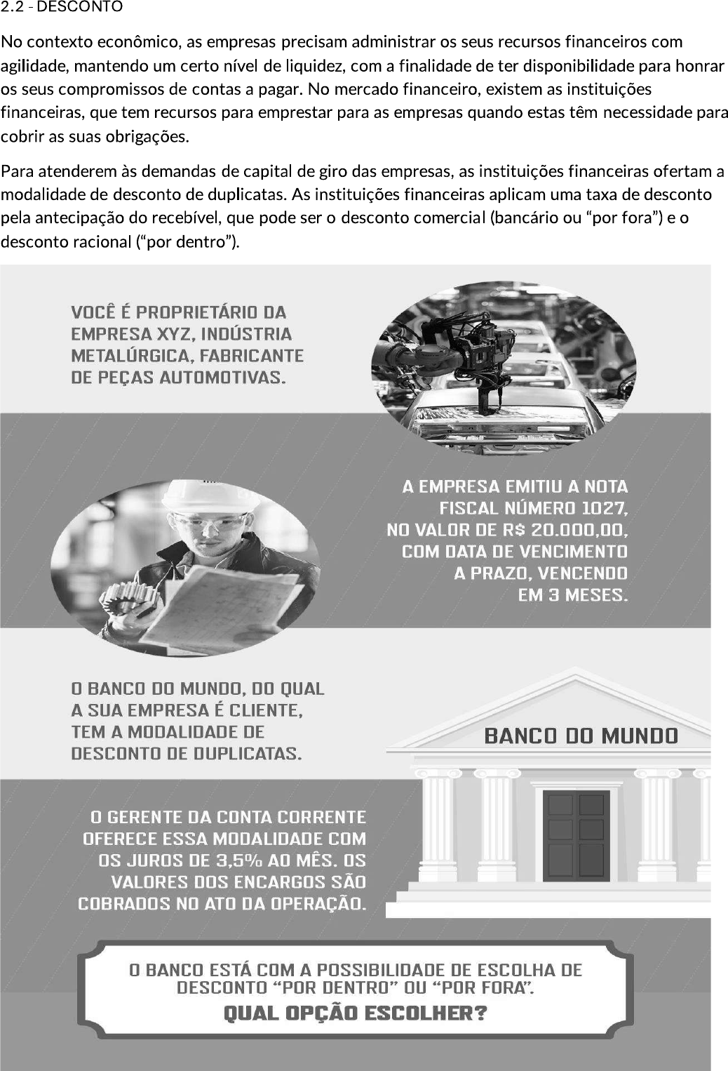 2.2 DESCONTO No contexto econômico, as empresas precisam administrar os seus recursos financeiros com agilidade, mantendo um certo nível de liquidez, com a finalidade de ter disponibilidade para honrar os seus compromissos de contas a pagar. No mercado financeiro, existem as instituições financeiras, que tem recursos para emprestar para as empresas quando estas têm necessidade para cobrir as suas obrigações. Para atenderem às demandas de capital de giro das empresas, as instituições financeiras ofertam a modalidade de desconto de duplicatas. As instituições financeiras aplicam uma taxa de desconto pela antecipação do recebível, que pode ser o desconto comercial (bancário ou "por fora") e o desconto racional ("por dentro"). VOCÊ É PROPRIETÁRIO DA EMPRESA XYZ, INDÚSTRIA FABRICANTE DE PEÇAS AUTOMOTIVAS. A EMPRESA EMITIU A NOTA FISCAL NÚMERO 1027, NO VALOR DE R$ 20.000,00, COM DATA DE VENCIMENTO A PRAZO, VENCENDO EM 3 MESES. BANCO DO MUNDO, DO QUAL A SUA EMPRESA É CLIENTE, TEM A MODALIDADE DE BANCO DO MUNDO DESCONTO DE DUPLICATAS. GERENTE DA CONTA CORRENTE OFERECE ESSA MODALIDADE COM JUROS DE 3,5% AO MÊS. VALORES DOS ENCARGOS SÃO COBRADOS NO ATO DA OPERAÇÃO. BANCO ESTÁ COM A POSSIBILIDADE DE ESCOLHA DE DESCONTO "POR DENTRO" OU "POR FORA". QUAL OPÇÃO ESCOLHER?A antecipação de recebíveis é um dos produtos ofertados pelas instituições financeiras para financiamento de vendas. A empresa contratante da operação recebe um valor correspondente aos títulos em período anterior aos seus vencimentos, fazendo a cessão de seus direitos de recebimento futuro à instituição financeira. No infográfico a seguir, você vai visualizar o fluxograma de antecipação de recebíveis, descrevendo as etapas desse processo, mostrando as atividades de todos os interlocutores envolvidos nessa operação financeira. INSTITUIÇÃO FINANCEIRA FLUXOGRAMA DA ANTECIPAÇÃO DE RECEBÍVEIS EMPRESA fluxograma é um diagrama que descreve um processo e que tem por objetivo comunicar e facilitar a compreensão de processos. Neste fluxograma, você conhecerá as etapas do processo de antecipação de recebíveis, CLIENTE mostrando as atividades de todos OS INÍCIO Efetuar pedido da mercadoria, com quantidades, interlocutores envolvidos nessa especificações do produto operação financeira. e prazo de pagamento. Com o intuito de se manterem competitivas no mercado, as empresas efetuam vendas a prazo por meio da emissão de títulos. Por outro lado, essa venda a prazo pode repercutir em um nível baixo de disponibilidades de recursos em caixa. Para as empresas, as instituições financeiras têm grande importância, principalmente no papel de liberação de recursos financeiros para suprir essas necessidades de fluxo de caixa. As empresas, na condição de tomadora de recursos, captam valores no mercado a uma taxa de desconto ou de juros, que é descontada ou cobrada no momento da liberação dos recursos da operação contratada. Para melhorar a administração de caixa, a empresa necessita ter os recursos necessários para disponibilidade de pagamentos de contas. Em momentos em que o fluxo de caixa não é positivo, deve garantir a busca da melhor opção de recursos financeiros junto às instituições financeiras.ANTECIPAÇÃO DE RECEBÍVEIS: QUE É? Modalidade com a finalidade de suprir as necessidades de capital de giro para as empresas. QUE É NECESSÁRIO PARA ANTECIPAR UM RECEBÍVEL? Efetuar uma venda a prazo. Emitir a nota fiscal da venda. Ter vinculado a essa venda uma duplicata, um cheque ou pagamento em cartão de crédito Ter limite de crédito para a operação junto à instituição financeira ou solicitar análise e abertura de crédito RECEBIMENTO Operação mais rápida do que as outras modalidades de empréstimos disponíveis no mercado. Rápida disponibilidade do valor em conta. A chamada "trava bancária" ocorre quando a empresa deseja antecipar o recebimento do dinheiro de vendas por cartões de crédito e não pode escolher a instituição financeira de seu interesse,tendo que efetuar com exclusividade com uma única instituição financeira. Na Prática, você vai compreender como funciona atualmente a antecipação de recursos por cartões de crédito, com a "trava bancária". TRAVA BANCARIA: QUE E? A chamada "trava bancária" ocorre quando a empresa deseja antecipar recebimento do dinheiro de vendas por cartões de crédito e não pode escolher a instituição financeira de seu interesse, tendo que efetuar com exclusividade com uma única instituição financeira. Conselho Monetário Nacional (CMN) e Banco Central (BC) regulamentaram as condições de registro de recebíveis de cartões de pagamento que, na prática, limitam a chamada "trava bancária" em agosto de 2020. Compreenda como funciona a antecipação de recursos por cartões de crédito com a "trava bancária". REFLEXO DA TRAVA BANCÁRIA A empresa XYZ, indústria metalúrgica, fabricante de peças automotivas, instalada em Porto Alegre/RS, tem como uma das modalidades de recebimento de seus clientes cartão de crédito. Quando a empresa emite uma nota fiscal e cliente efetua pagamento por cartão de crédito, pode-se pedir a antecipação dos recursos (recebíveis) apenas à instituição financeira ligada à credenciadora da máquina do cartão.