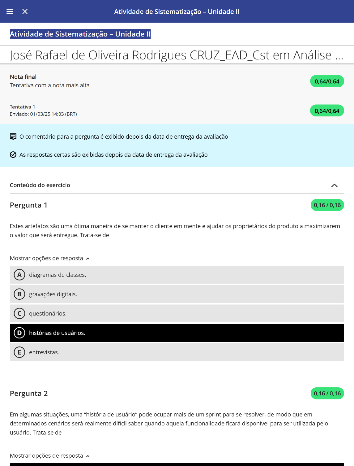 X Atividade de Sistematização - Unidade II Atividade de Sistematização - Unidade II José Rafael de Oliveira Rodrigues CRUZ_EAD_Cst em Análise Nota final 0,64/0,64 Tentativa com a nota mais alta Tentativa 1 0,64/0,64 Enviado: 01/03/25 14:03 (BRT) comentário para a pergunta é exibido depois da data de entrega da avaliação As respostas certas são exibidas depois da data de entrega da avaliação Conteúdo do exercício Pergunta 1 0,16 / 0,16 Estes artefatos são uma ótima maneira de se manter o cliente em mente e ajudar os proprietários do produto a maximizarem o valor que será entregue. Trata-se de Mostrar opções de resposta A diagramas de classes B gravações digitais. C questionários. D histórias de usuários. E entrevistas. Pergunta 2 0,16/0,16 Em algumas situações, uma "história de usuário" pode ocupar mais de um sprint para se resolver, de modo que em determinados cenários será realmente difícil saber quando aquela funcionalidade ficará disponível para ser utilizada pelo usuário. Trata-se de Mostrar opções de respostaA épico. B recurso. C tema. D história. E novell. Pergunta 3 0,16/0,16 Qual é o nome dado à técnica utilizada para a criação de uma representação visual de uma possível solução para se revisar com as partes interessadas e se obter confirmação ou novas ideias sobre os requisitos? Mostrar opções de resposta A Entrevista. B Etnografia. C Prototipagem. D Workshop. E Brainstorming. Pergunta 4 0,16/0,16 Considerando ser um momento no qual faz-se anotações para ver quais melhorias ainda precisam estar na lista de pendências, quando devemos retomar a história do usuário? Mostrar opções de resposta A Planejamento do sprint. B Codificação ágil. C Classificação do sprint. D Revisão do sprint. E Change sprint management.Comentários Comentários para o aluno Seu instrutor não fez comentários
