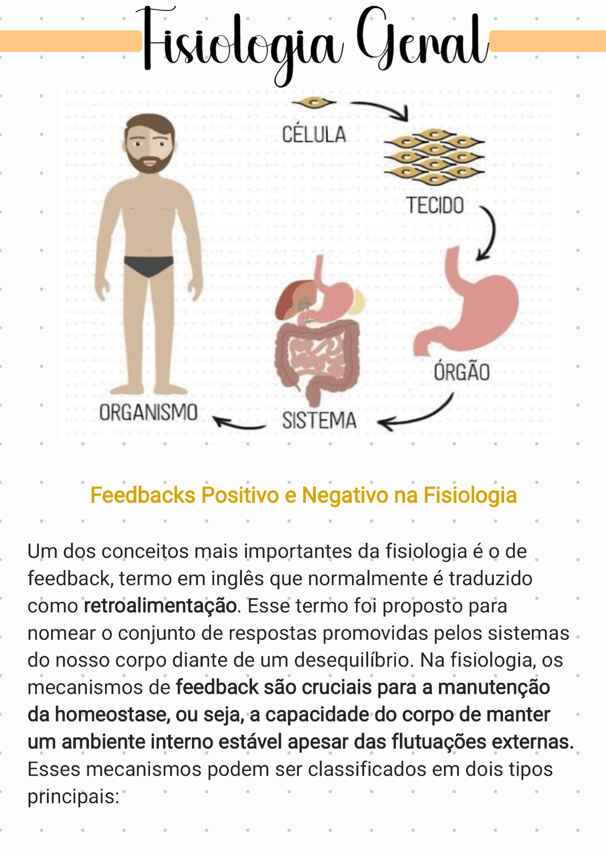 Geral TECIDO H ÓRGÃO ORGANISMO SISTEMA Feedbacks Positivo e Negativo na Fisiologia Um dos conceitos mais importantes da fisiologia é o de feedback, termo em inglês que normalmente é traduzido como retroalimentação. Esse termo foi proposto para nomear o conjunto de respostas promovidas pelos sistemas do nosso corpo diante de um desequilíbrio. Na fisiologia, os mecanismos de feedback são cruciais para a manutenção da homeostase, ou seja, a capacidade do corpo de manter um ambiente interno estável apesar das flutuações externas. Esses mecanismos podem ser classificados em dois tipos principais:Feedback Negativo feedback negativo é o mecanismo mais comum de controle fisiológico. Ele atua para reduzir ou neutralizar uma mudança inicial, trazendo o sistema de volta ao seu ponto de equilíbrio. Ele provoca uma mudança negativa em relação à alteração inicial, ou seja, um estímulo contrário àquele que levou ao No corpo humano, o feedback negativo regula diversas funções, como: Controle da temperatura Quando sentimos calor, suamos para resfriar o corpo. Regulação da pressão arterial: Se a pressão sobe, corpo libera substâncias que a reduzem. Controle da glicemia: Após uma refeição, a insulina é liberada para baixar o nível de açúcar no sangue. Respiração: Quando as concentrações de dióxido de carbono aumentam no sangue, o centro respiratório aumenta sua atividade, provocando aumento da frequência de respiração. Com o aumento da atividade respiratória, ocorre um aumento da remoção de dióxido de carbono no corpo. Percebe-se, portanto, que aumento da concentração causa um aumento na remoção. Feedback Positivo feedback positivo, por outro lado, aumenta o estímulo quegera desequilíbrio, afastando o sistema do seu ponto de equilíbrio.0 feedback positivo pode causar danos ao corpo, uma vez que não programa o organismo para voltar ao estado de estabilidade. Ele está envolvido em processos que precisam ser rapidamente concluídos. Um exemplo é o parto: Estímulo: O bebê se move para o canal de parto. Sensor: Receptores no colo do útero detectam a pressão. Efeito: corpo libera ocitocina, um hormônio que causa contrações uterinas mais fortes. Resultado: As contrações aumentam até o bebê nascer. Outros exemplos de feedback positivo incluem: Coagulação sanguínea: Uma lesão inicia uma cascata de eventos que levam à formação do coágulo. Amamentação: A sucção do bebê estimula a produção de leite. Quando uma pessoa perde uma grande quantidade de sangue: A perda do sangue faz com que coração pare de bombeá-lo de forma eficiente e, consequentemente, ocasiona a queda de pressão e diminuição do fluxo sangue para o músculo do coração. Isso faz com que o coração diminua ainda mais o bombeamento, o que ocasiona uma maior diminuição do fluxo sanguíneo, enfraquecendo ainda mais o órgão. Esse processo persiste até levar organismo ao óbito.Desequilíbrios nos Feedbacks: Quando os mecanismos de feedback falham, podem ocorrer doenças. Por exemplo, o diabetes tipo 1 é causado pela falta de insulina, o que impede o feedback negativo de controlar a glicemia. Já algumas doenças autoimunes podem ser resultado de um feedback positivo excessivo, levando o sistema imunológico a atacar o próprio corpo. Em resumo: Feedback negativo: Reduz ou neutraliza mudanças, mantendo a homeostase. Feedback positivo: Amplifica mudanças, levando a um resultado rápido. Transporte Celular: Permite que as células troquem substâncias com meio externo e mantenham seu funcionamento interno. Ele garante a entrada de nutrientes, a eliminação de resíduos e a comunicação entre as células. Tipos de Transporte Celular: Transporte Passivo:transporte passivo não requer gasto de energia pela célula, pois as substâncias se movem a favor de um gradiente de concentração (do meio mais concentrado para meio menos concentrado) ou de um gradiente elétrico. Difusão Simples: pequenas e não polares, como gases (oxigênio e gás carbônico) e algumas moléculas lipídicas, atravessam a membrana plasmática diretamente, sem auxílio de proteínas. Difusão Facilitada: Moleculas maiores ou polares, como glicose e aminoácidos, precisam de proteínas transportadoras (canais ou transportadores) para atravessar a membrana. Alta concentração Baixa concentraçãoOsmose: A água se move através de uma membrana semipermeável, do meio menos concentrado (hipotônico) para o meio mais concentrado (hipertônico). Espaço extracelular Canal proteico Membrana 0 celular Transportador de proteínas Espaço intracelular Solução Isotônica: Hipertônico Isotônico Hipotônico H2O H.O Equilíbrio: Mesma concentração de soluto que o interiorda célula. Sem Mudanças: Não há fluxo líquido de água através da membrana celular. Exemplos: Soro fisiológico, soluções de reidratação oral. Solução Hipotônica: Inchaço: Menor concentração de soluto que o interior da célula. Água para Dentro: A água se move para dentro da célula, que pode inchar e romper. Exemplo: Água pura. Solução Hipertônica: Desidratação: Maior concentração de soluto que o interior da célula. Água para Fora: A água se move para fora da célula, que pode murchar e morrer. Exemplos: Soluções de alta concentração de sal ou açúcar. Osmose na Prática: Soro Fisiológico: Uma solução isotônica de cloreto de sódio a 0,9% é utilizada para hidratar e repor eletrólitos em casos de desidratação. Soluções de Rehidratação Oral: Utilizadas para tratar diarreia e vômitos, geralmente são isotônicas ou levemente hipotônicas para facilitar a absorção de águae eletrólitos. Conservação de Alimentos: O sal e o açúcar são utilizados como conservantes, pois criam um ambiente hipertônico que impede o crescimento de bactérias. Transporte Ativo o transporte ativo requer gasto de energia pela célula, pois as substâncias se movem contra um gradiente de concentraç