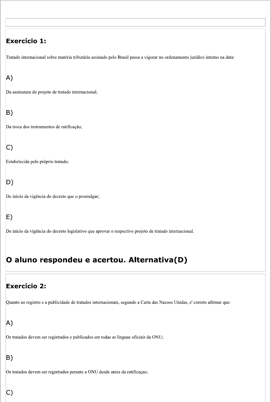Exercício 1: Tratado internacional sobre matéria tributária assinado pelo Brasil passa a vigorar no ordenamento jurídico interno na data: A) Da assinatura do projeto de tratado internacional; B) Da troca dos instrumentos de ratificação; C) Estabelecida pelo próprio tratado; D) De início da vigência do decreto que o promulgar; E) De início da vigência do decreto legislativo que aprovar o respectivo projeto de tratado internacional. o aluno respondeu e acertou. Alternativa(D) Exercício 2: Quanto ao registro e a publicidade de tratados internacionais, segundo a Carta das Nacoes Unidas, e' correto afirmar que: A) Os tratados devem ser registrados e publicados em todas as linguas oficiais da ONU; B) Os tratados devem ser registrados perante a ONU desde antes da ratificaçao; C)A obrigaçao de registro e publicidade de tratados esta' contida em uma norma jus cogens; D) Os tratados nao registrados não podem ser invocados perante orgaos da ONU; E) E' competencia da Assembleia-Geral da ONU publicar os tratados concluidos por qualquer membro da organização. aluno respondeu e acertou. Alternativa(D) Exercício 3: A ratificação representa o meio pelo qual o sujeito de direito internacional público, signatário de um tratado, manifesta em definitivo a sua vontade em vincular-se a um tratado. A ratificação apresenta como características: A) a unilateralidade e a discricionariedade. B) a plurilateralidade e a discricionariedade. C) a unilateralidade e a reciprocidade. D) a bilateralidade e a discricionariedade. E) a unilateralidade e a vinculatividade. o aluno respondeu e acertou. Alternativa(A) Exercício 4:Quanto à análise entre leis, tratados internacionais e constituição é correto dizer que: A) Como regra geral, o tratado internacional, posterior, regularmente incorporado ao sistema jurídico nacional. não revoga lei ordinária anterior. A exceção é prevista no art. 98 do Código Tributário Nacional: B) O Pacto de São José da Costa Rica, Decreto n. 678/1992, apresenta hierarquia de lei complementar no sistema jurídico nacional; C) Tratado internacional sobre direitos humanos somente apresentará hierarquia de norma constitucional se aprovado pelo Congresso Nacional em cada Casa em dois turnos por três quintos dos seus membros; D) É inconstitucional tratado internacional que estabeleça mecanismo de homologação de sentença estrangeira por meio de carta rogatória por serem instrumentos de cooperação jurídica internacional, previstos na Constituição da República Federativa do E) A competência constitucional para conceder exequatur às cartas rogatórias é privativa do Supremo Tribunal Federal, não podendo lei ordinária ou tratado internacional excepcionar esta regra; o aluno respondeu e acertou. Alternativa(C) Exercício 5: Com relação aos tratados internacionais, assinale a opção correta: A) Para que tenham validade no âmbito do direito internacional, os tratados internacionais devem ser sempre aprovados pela Organização das Nações Unidas (ONU) B) No direito internacional público, a coação de um Estado pela ameaça ou emprego da força pode dar causa à nulidade absoluta de um tratado internacional; C)A entrada em vigor de um tratado internacional com mais de duas partes apenas se dá a partir do momento em que todas as partes tenham concluído o processo de ratificação, não surtindo efeito para nenhuma delas antes que todas tenham concluído esse processo; D) Apesar de não ter ratificado a Convenção de Viena sobre Direito dos Tratados de 1969, o Brasil observa seu conteúdo como costume internacional e, portanto, como fonte de direito internacional público; E) Quando assinado pelo presidente da República, o tratado internacional cria obrigações jurídicas para o Brasil a partir do momento da assinatura, sendo dispensada, apenas neste caso, a ratificação. o aluno respondeu e acertou. Alternativa(B) Exercício 6: Considerando as assertivas abaixo: I - os ministros das relações exteriores estão habilitados a firmar tratados, com base nas Convenções de Viena; PORQUE II o chefe de Governo de um Estado detém a denominada competência originária para a celebração de tratados. É correto afirmar que: A) As duas afirmações estão erradas. B) As duas afirmações estão corretas e a segunda é fundamento da primeira. C) As duas afirmações estão corretas, mas a segunda não justifica a primeira. D) Somente a primeira afirmação é correta. E) Somente a segunda afirmação é correta.o aluno respondeu e acertou. Alternativa(B) Exercício 7: Sobre os tratados, assinale a alternativa correta: A) Os tratados são acordos formais celebrados por sujeitos do Direito Internacional, quer constem de um ou mais documentos, na forma oral ou escrita e qualquer que seja o nome atribuído ao texto final. B) Tratado é um acordo internacional concluído por escrito entre Estados e Organizações Internacionais Intergovernamentais e regido pelo Direito Internacional. C) São entes dotados de capacidade para assinar tratados os Estados e os indivíduos. D) Todos os tratados internacionais têm vigência por tempo indeterminado. E) Nenhuma das alternativas acima está correta. aluno respondeu e acertou. Alternativa(B) Exercício 8: É CORRETO afirmar que, no ordenamento jurídico brasileiro, um tratado internacional A) Só pode ser ratificado pelo Chefe do Poder Executivo Federal na hipótese de haver sido por ele assinado. B)Submete-se à aprovação do Congresso Nacional e à ratificação do Presidente da República. C) Pode ser ratificado pelo Presidente do Congresso Nacional. D) Excepcionalmente, necessita de aprovação congressual. E) Todas as assertivas anteriores estão incorretas. aluno respondeu e acertou. Alternativa(B) Exercício 9: Assinalar a alternativa correta: I. A denominação dos tratados internacionais é irrelevante para a determinação de seus efeitos ou de sua eficácia, sendo indiferente sejam chamados de acordo, c
