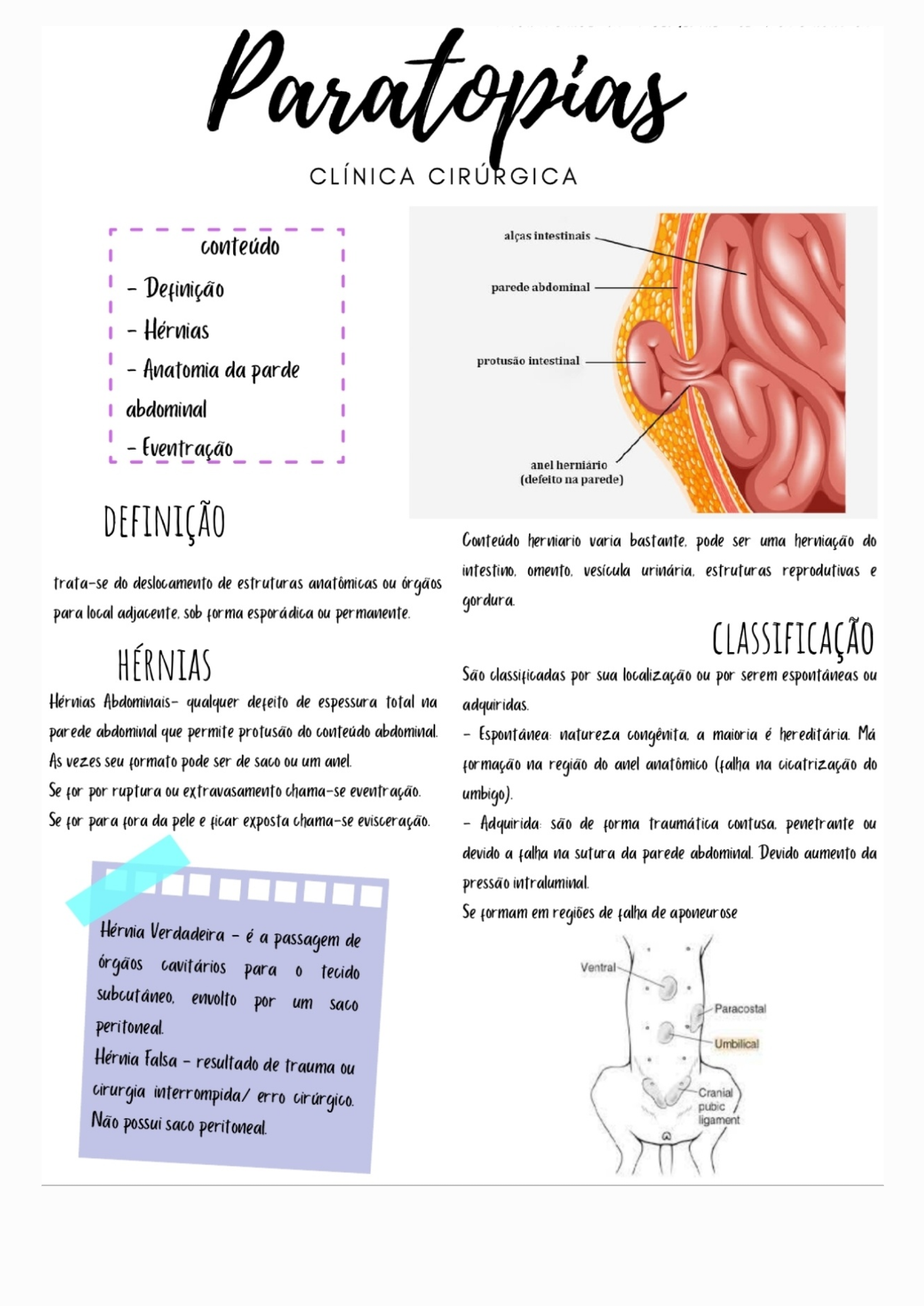 Paratopias CLÍNICA CIRURGICA alças intestinais conteúdo - Definição parede abdominal - Hérnias Anatomia da parde protusão intestinal abdominal - Eventração anel herniário (defeito na parede) DEFINIÇÃO Conteudo herniario varia pode ser uma do vesicula estruturas reprodutivas e trata-se do deslocamento de estruturas ou gordura para local adjacente. sob forma esporádica ou permanente HÉRNIAS CLASSIFICAÇÃO classificadas por sua localização ou por serem ou Abdominais- qualquer defeito de espessura total na parede abdominal que permite protusão do - Espontanea natureza a maioria é Ma As vezes seu formato pode ser de saco ou um anel. formação na região do anel anatômico (falha na cicatrização do Se for por ruptura ou extravasamento chama-se umbigo). Se for par a fora da pele e ficar exposta chama-se - de forma traumática penetrante ou devido a falha na sutura da parede abdominal Devido aumento da pressão intraluminal Se formam em de falha de aponeurose Hérnia Verdadeira - é a passagem de cavitários para 0 tecido Ventral envolto por um saco Paracostal Umbilical Falsa - resultado de trauma ou cirurgia interrompida/ erro Cranial pubic Não possui saco ligamentPATOFISIOLOGIA Podem ser resultado de falha na de perde a Aumento de volume na cicatriz umbilical força de má cicatrização de deiscência de Consistência macia na palpação traumas e (falha Reduz na Animal não sente dor INDICAÇÃO dor e êmese em caso de estrangulamento Tratamento desconforto sinais de obstrução de ou perda da coloração do tecido (urgencia) Herniorrafia da incisão do sacor Protusão significativa que afeta a qualidade de vida do animal redução dos para 0 interior da cavidade Risco de obstrução de do saco e sutura da musculatura e pele. não fazer só quando Sempre orientar 0 tutor a por imagem ultrassonografia e radiografia A maioria das para retirar as fazer quando estiver apenas se estiver seu hospital DIAGNÓSTICO DIFERENCIAL Complicações Estrangulamento quando ha de suprimento Onfalocele (não tem a falha na parede apenas tecido (compressão vascular). causará necorse fibroso). não tem dor Encarceramento hérnia aprisionada. tumores/neoplasias (diferencia pela citologia) causa dor e tem devido a compressão vascular Podem Eventração tornar obstruções letais em poucas horas. necessita de reparo Abcessos urgente Pode ocorrer em qualquer hérnia Hematomas Seromas (felinos) HÉRNIA INGUINAL HÉRNIA UMBILICAL Ocorre através do anel inguinal formado pela de dois (obliquo abdominal externo reto abdominal) Os or gaos se projetam dentro do anel Causa cadelas de idade avançada Acomete gatos Maior risco de encarceramento e estrangulamento de tecido mais acometidas Poodle daschund maltes Sinais e Sintomas aumento do volume em região inguinal. consistência dor quando encarcerada ou estrangulada. êmese e apatia lembrete Anormalidade (histórico animal) Obesidade Em machos está associado ao Tratamento criptorquidismo Associar a OSH incisão na linha média para poder puxar as visceras para dentro e depois faz-se incisão no saco Excisão do saco e CAROLINA 7°SEMESTRE / CLINICA sutura em sultanDiferencial m. elevador do Tumor de mama. consistência diferente (hérnia consistência m. esfincter macia) e neoplasia consistência dura m. coccigeo externo do ânus Para saber se encarcerou a vesicula fazer sondagem lipoma linfonodo alterado Abcesso HÉRNIA PERINEAL Acomete mais machos do que Ocorre quando os do m. obturador interno diafragma pélvico atrofiam ou diminuem seu muscular e se criando uma abertura e permitindo que 0 contéudo da A principal complicação dessa cirurgia é lesionar 0 nervo cavidade abdominal e da cavidade pélvica sejam projetados para levando a incontinência urinaria incontinência dentro do A principal causa é atrofia 0 prolapso levantador do anus tem uma perda da atividade e No pós-operatório administrar antibiótico para evitar abscessos e do colar protetor. laxante e limpeza Sinais e Sintomas Cirurgia sempre associado de dificuldade de urinar e defecar (bexiga e intestino encarcerado) RUPTURA DIAFRAGMÁTICA gotejamneto de urina. disquesia. Quando ha projeção de da cavidade abdominal para a Se a não tiver encarcerando não ha dores cavidade torácica através de uma descontinuidade do diafragma Causa principal - trauma chutes. quedas e 0 us auxilia a ver 0 e 0 RX auxilia para ver a saculação e brigas) a flexão do intestino A ruptura ocorre por aumento da pressão intra-abdominal Exame Clinico palpação retal sente 0 as vezes é aumento do gradiente de peritoneal e rompimento necessário fazer enema para retirar as Cistocentese para retirar a urina e passar sonda Fazer do RX é fundamental para 0 diagnóstico fluidoterapia para controlar a para então entrar em Sinais Clinicos cirurgia e taquipneia cianose Tratamento Taquicardia Cirurgia 0 animal é colocado em decubito ventral com a mesa inclinada se tiver torção do Anorexia / Hiporexia para 0 da hérnia voltar para 0 pela audivel na ausculta torácica fazer tricotomia ampla. fazer a bolsa de fumo para evitar que Palpação abdominal não sente 0 figado nem 0 estomago saia fezes colocando gases antes de incisão paralela ao Diagnóstico Diferencial indo da base da cauda até 0 Efusão pleural Herniorrafia geralmente ocorre entre 0 esfincter anal e 0 ax levantador do Sempre que realizar ciru de perineal Pneumonia utilizar uma tela Marlex para evitar que 0 se rompa Derrame Pleural 0 na parte ventral fazer um flap com 0 obturador interno para ocluir essa fragilidade na parte ventral CAROLINA / CLINICATratamento abertura do para acessar 0 em todo 0 momento deve fazer ventilação mecânica no animal devido à pressão negativa e 0 risco do colabar Acesso venoso Celiotomia acesso abdominal pela linha ventral acesso torácico - toracotomia intercostal Posição de Trendelenburg reverso Inguinal Complicações Pneumotorax / Hemotorax / piotorax Edema pulmonar Pneumonia EVENTRAÇÃO Protusão da