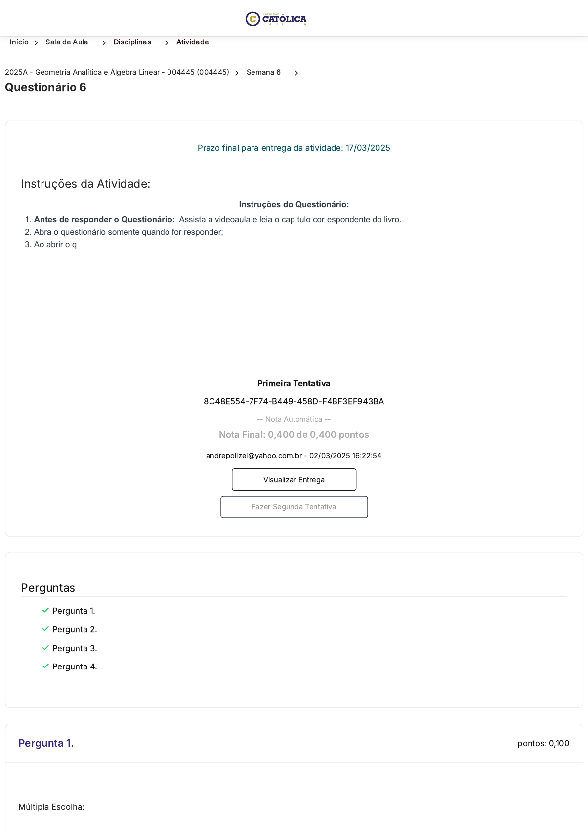 Início 〉 Sala de Aula 〉 Disciplinas 〉 Atividade 2025A - Geometria Analítica e Álgebra Linear - 004445 (004445) 〉 Semana 6 〉 Questionário 6 Instruções da Atividade: Prazo final para entrega da atividade: 17/03/2025 Instruções do Questionário: 1. Antes de responder o Questionário: Assista a videoaula e leia o capítulo correspondente do livro. 2. Abra o questionário somente quando for responder; 3. Ao abrir o questionário você terá 4 questões para responder; 4. Leia com calma todas as questões e entenda o que pede a questão: se pede a incorreta, a correta e qual o tema da questão; 5. Lembre-se de Clicar no botão "Enviar"; 6. Você tem duas tentativas para fazer o teste, a segunda tentativa é opcional; 7. Lembre-se que as respostas mudam de lugar em cada tentativa; 8. As respostas corretas só aparecem após o envio da segunda tentativa; 9. O sistema considera a maior nota entre as duas tentativas; 10. Lembre-se que na segunda tentativa zera TODAS as questões, inclusive as que você acertou na primeira tentativa. Bons estudos! Primeira Tentativa 8C48E554-7F74-B449-458D-F4BF3EF943BA -- Nota Automática -- Nota Final: 0,400 de 0,400 pontos andrepolizel@yahoo.com.br - 02/03/2025 16:22:54 Visualizar Entrega Fazer Segunda Tentativa Perguntas Pergunta 1. Pergunta 2. Pergunta 3. Pergunta 4. pontos: 0,100Pergunta 1. Encontre a equação reduzida da reta que passa pelos pontos A(-2,3) e B(2,-1), e assinale a alternativa correta: Múltipla Escolha: https://ava.uca.edu.br/aluno/sala-de-aula/disciplina/modulo/atividade/315483 https://ava.uca.edu.br/aluno/sala-de-aula/disciplina/modulo/atividade/315483 https://ava.uca.edu.br/aluno/sala-de-aula/disciplina https://ava.uca.edu.br/aluno/sala-de-aula/disciplina/modulo/atividade/:id/:nome javascript:void(0); A. 𝑦 = -𝑥 + 1 B. 𝑦 = -𝑥 - 1 C. 𝑦 = -𝑥 + 2 D. 𝑦 = 𝑥 + 2 E. 𝑦 = 𝑥 + 1 pontos: 0,100Pergunta 2. Sejam os pontos 𝐴 ( 4, 5 ) e 𝐵 ( - 1, 4 ) , assinale a correta alternativa que contém a distância entre ambos: Múltipla Escolha: A. d = √18 B. d = √26 C. d = √2 D. d = √22 E. d = √8 Avaliação Nota Avaliada: 0,100 de 0,100 Avaliação Nota Avaliada: 0,100 de 0,100 javascript:void(0); pontos: 0,100Pergunta 3. Encontre a equação geral da reta que passa pelos pontos A(0,2) e B(3,-1), e assinale a alternativa correta: Múltipla Escolha: A. 𝑥 + 3𝑦 - 2 = 0 B. 𝑥 + 2𝑦 - 6 = 0 C. 3𝑥 + 𝑦 - 3 = 0 D. 3𝑥 + 3𝑦 - 1 = 0 E. 3𝑥 + 3𝑦 - 6 = 0 pontos: 0,100Pergunta 4. Encontre as coordenadas do ponto médio do segmento, cujos extremos são os pontos A(-1,0) e B(3,1), e assinale a alternativa correta: Múltipla Escolha: A. M (1, 1 2 ) B. M (3, 0) C. M (-3, 1) D. M (4, 1 2 ) Avaliação Nota Avaliada: 0,100 de 0,100 javascript:void(0); E. M (2, -1) Fechar Visualização 〈 Voltar aos Módulos 〈 Anterior Avaliação Nota Avaliada: 0,100 de 0,100 Próxima 〉 Faculdade Católica Paulista Contato Endereço Avenida Cristo Rei, 305 – Banzato Marília, São Paulo – CEP: 17515-200 Horário De Funcionamento Segunda a quinta, das 8:00 às 20:00 horas As sextas, das 8:00 às 18:00 horas. WhatsApp : (14) 9.8826-3000 Telefone Sede: (14) 3422-1815 Central de Atendimento: 0800 664 5583 E-mail : secretaria@uca.edu.br https://www.instagram.com/faculdadecatolicaead/ https://facebook.com/ucaead https://www.youtube.com/@UcaEduBr https://www.linkedin.com/school/faculdade-catolica-paulista/?originalSubdomain=br https://maps.app.goo.gl/wWsD9QX5fVPa3h6PA https://api.whatsapp.com/send?phone=5514988263000&text=Suporte tel:14-3422-1815 tel:14-3422-1815 tel:0800-664-5583 tel:0800-664-5583 mailto:secretaria@uca.edu.br javascript:void(0);