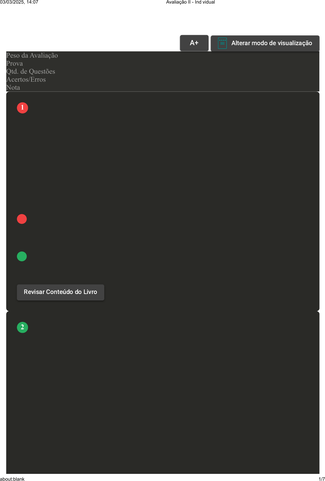 Prova Impressa GABARITO | Avaliação II - Individual (Cod.:987094) Peso da Avaliação 2,00 Prova 85902291 Qtd. de Questões 10 Acertos/Erros 7/3 Nota 7,00 A avaliação econômica é um processo pelo qual os custos de programas alternativos são comparados com suas consequências, em termos de melhora da saúde ou de economia de recursos. É também conhecida como estudo de rentabilidade. Engloba uma família de técnicas incluindo análise de custo-efetividade, análise de custo-benefício e análise de custo-utilidade. Sobre as características da Análise Custo-Efetividade, classifique V para as sentenças verdadeiras e F para as falsas: ( ) Vantagem: utiliza desfechos concretos da prática clínica. ( ) Custo: unidade monetária ( ) Desvantagem: a comparação dos estudos fica restrita a desfechos unidimensionais e comuns aos estudos. ( ) Desfecho: unidade. Assinale a alternativa que apresenta a sequência CORRETA: A F - V - V - F. B F - F - V - V. C V - V - V - F. D V - F - F - V. Com relação às dimensões norteadoras da Avaliação das Tecnologias em Saúde - ATS -, associe os itens, utilizando o código a seguir: I- Eficácia. II- Equidade. III- Precisão para testes de diagnóstico. VOLTAR A+ Alterar modo de visualização 1 Revisar Conteúdo do Livro 2 03/03/2025, 14:07 Avaliação II - Individual about:blank 1/7 ( ) Benefício das tecnologias em condições ideais de utilização como nos ensaios clínicos randomizados. ( ) Análise da proporção da população a ser beneficiada em razão de suas necessidades socioculturais, biológicas e de gênero. ( ) Capacidade das tecnologias em confirmar determinado diagnóstico em pessoas doentes. Assinale a alternativa que apresenta a sequência CORRETA: A III - II - I. B I - II - III. C III - I - II. D I - III - II. De acordo com a Organização Mundial da Saúde, Tecnologia em Saúde é a aplicação de conhecimentos e habilidades organizados na forma de dispositivos, medicamentos, vacinas, procedimentos e sistemas desenvolvidos para resolver um problema de saúde e melhorar a qualidade de vida. A avaliação das tecnologias em saúde deve nortear-se por alguns aspectos. Com base nesses aspectos, associe os itens, utilizando o código a seguir: I- Impacto social, ético e legal. II- Custo. III- Segurança. ( ) Risco aceitável em uma situação específica. ( ) Custo (de oportunidade) em saúde é o valor da melhor alternativa não concretizada em consequência de se utilizarem recursos escassos na produção de um dado bem e ou serviço. ( ) São todos os impactos não relacionados à efetividade, à segurança e aos custos, incluindo as consequências econômicas secundárias para indivíduos e comunidades. Assinale a alternativa que apresenta a sequência CORRETA: A III - II - I. B I - III - II. C 3 03/03/2025, 14:07 Avaliação II - Individual about:blank 2/7 II - I - III. D I - II - III. O sucesso de uma política de ATS no SUS demandará algumas ações prioritárias. Com relação a tais ações, classifique V para as sentenças verdadeiras e F para as falsas: ( ) O incentivo à formação de recursos humanos - nas diversas áreas do conhecimento envolvidas nas diferentes fases do ciclo de vida das tecnologias. ( ) A sensibilização dos gestores dos três níveis hierárquicos do SUS quanto à necessidade de ampliar a visão das consequências de um processo de incorporação de tecnologia malconduzido e de adotar critérios objetivos e claros no processo, tendo como referência a melhor evidência disponível. ( ) A sensibilização dos profissionais de − saúde e da sociedade em geral para as consequências econômicas e sociais do uso inapropriado de tecnologias nos serviços de saúde. Assinale a alternativa que apresenta a sequência CORRETA: A F - V - F. B V - F - F. C V - V - V. D V - V - F. O processo de inovação tecnológica inicia-se com a invenção de um novo produto, processo, ou prática, e é encerrado quando acontece a primeira utilização prática. Entre a invenção e a aplicabilidade prática ocorre alguma forma de avaliação econômica e testes usando voluntários são realizados na avaliação dos benefícios e riscos da nova tecnologia. Com base nos critérios que devem ser considerados no ciclo de vida de uma tecnologia, ordene os itens a seguir: I- Incorporação. II- Utilização em larga escala. III- Difusão Inicial. IV- Abandono. V- Inovação. 4 5 03/03/2025, 14:07 Avaliação II - Individual about:blank 3/7 Assinale a alternativa que apresenta a sequência CORRETA: A II - III - IV - V - I. B IV - II - V - I - III. C V - III - I - II - IV. D I - IV - III - II - V. Com relação às orientações de avaliação do impacto de uma ou mais tecnologias na Avaliação das Tecnologias em Saúde - ATS -, classifique V para as sentenças verdadeiras e F para as falsas: ( ) Processo avaliativo de uma tecnologia nova. ( ) Avaliação de alguma que já esteja em uso geral. ( ) Uma nova aplicação de outra já em uso. Assinale a alternativa que apresenta a sequência CORRETA: A F - V - F. B V - V - F. C V - V - V. D V - F - F. As perspectivas da avaliação de tecnologias refletem as necessidades ou objetivos específicos de quem conduz ou financia a avaliação. Considerando a natureza multidisciplinar e os diferentes atores 6 7 03/03/2025, 14:07 Avaliação II - Individual about:blank 4/7 envolvidos na ATS, cada uma das disciplinas que contribuem para a avaliação das tecnologias, associe os itens, utilizando o código a seguir: I- Saúde pública. II- Ética. III- Indústria Farmacêutica. ( ) Empreende escalas de tempo maiores para que sua viabilidade e efeitos sejam observados. ( ) Levam em consideração a ordem moral implícita ou explicitamente associadas no desenvolvimento e uso de tecnologias de atenção à saúde. ( ) Correspondem entre 10-15% do total dos custos na área de saúde. Assinale a alternativa que apresenta a sequência CORRETA: A I - III - II. B I - II - III. C III - I - I