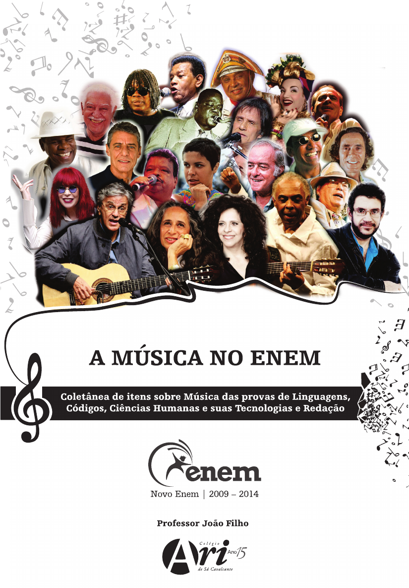 BREVE HISTÓRIA DA MÚSICA NO BRASIL QUESTÕES: • Teoria Musical .......................................................................................................... 5 • Cantigas populares .................................................................................................. 8 • MPB ........................................................................................................................ 10 • MPB (Samba) .......................................................................................................... 13 • MPB (Protesto/Década 60-70) .............................................................................. 17 • MPB (Tropicalismo) ................................................................................................ 20 • MPB (Regional) ...................................................................................................... 22 • Rock Nacional ........................................................................................................ 24 • Rap Nacional .......................................................................................................... 30 • Música Internacional .............................................................................................. 34 • Pesquisando sobre música na Internet ................................................................. 37 • Gabaritos ................................................................................................................ 42 BREVE HISTÓRIA DA MÚSICA NO BRASIL Das origens aos dias atuais. SÉCULO XVI, XVII E XVIII • Cantigas populares; • Ritmos percussivos africanos; • Fanfarras militares; • Músicas religiosas; • Músicas eruditas europeias; • Sons tribais indígenas. FIM DO SÉCULO XVIII E INÍCIO DO SÉCULO XIX • Lundu (africano) – sensual e dançante; • Modinha (portuguesa) – sentimental e melancólica; • Dança de salão europeia – trazida pela corte de D. João. SEGUNDA METADE DO SÉCULO XIX • Choro ou Chorinho; • Marchinhas carnavalescas. PRIMEIRA METADE DO SÉCULO XX • Capoeira; • Pagode; • Batidas do Candomblé; • Samba; • Origens da MPB; • Anos 20 a 40 (Era do Rádio); • Baião (Maxixe / Xaxado / Xote); • Samba-canção. SEGUNDA METADE DO SÉCULO XX • Bossa nova; • Era dos festivais da TV; • Jovem guarda; • Tropicalismo; • Música de protesto; • Festivais universitários / Samba-Rock; • “Pessoal do Ceará”; • Rock nacional; • “Mangue Beat”; • Forró / Sertanejo / Axé / Funk carioca; • Experimentações eletrônicas / Internet. A MÚSICA NO ENEM OSG 6152/15 5 TEORIA MUSICAL 1. (ENEM-2013) CAZES, H. Choro: do quintal ao Municipal. São Paulo: Editora 34, 1998. A foto mostra integrantes de um grupo de choro tocando instrumentos de diferentes classificações. Nessa formação, o instrumento que representa a família a) das madeiras é a flauta transversal. b) das cordas friccionadas é o bandolim. c) dos metais é o pandeiro. d) das percussões com membrana é o afoxé. e) das cordas percurtidas é o cavaquinho. A MÚSICA NO ENEM OSG 6152/15 6 2. (ENEM-2009) A música pode ser definida como a combinação de sons ao longo do tempo. Cada produto final oriundo da infinidade de combinações possíveis será diferente, dependendo da escolha das notas, de suas durações, dos instrumentos utilizados, do estilo de música, da nacionalidade do compositor e do período em que as obras foram compostas. Figura 1 - http://images.quebarato.com.br/photos/big/2/D/15A12D_2.jpg. Figura 2 - http://ourinhos.prefeituramunicipal.net/dados/fotos/2009/07/07/normal. Figura 3 - http://www.edmontonculturalcapital.com/gallery/edjazzfestival/JazzQuartet.jpg. Figura 4 - http://www.filmica.com/jacintaescudos/archivos/Led-Zeppelin.jpg. Das figuras que apresentam grupos musicais em ação, pode-se concluir que o(os) grupo(s) mostrado(s) na(s) figura(s) a) 1 executa um gênero característico da música brasileira, conhecido como chorinho. b) 2 executa um gênero característico da música clássica, cujo compositor mais conhecido é Tom Jobim. c) 3 executa um gênero característico da música europeia, que tem como repre- sentantes Beethoven e Mozart. d) 4 executa um tipo de música caracterizada pelos instrumentos acústicos, cuja intensidade e nível de ruído permanecem na faixa dos 30 aos 40 decibéis. e) 1 a 4 apresentam um produto final bastante semelhante, uma vez que as possi- bilidades de combinações sonoras ao longo do tempo são limitadas. A MÚSICA NO ENEM OSG 6152/15 7 3. (ENEM-2009) Figura 1 Figura 2 Figura 3 . Disponível em: . Disponível em: Disponível em: . Figura 4 Figura 5 Disponível em: Disponível em:Cuitelinho evidenciam a a) recriação da realidade brasileira de forma ficcional. b) criação neológica na língua portuguesa. c) formação da identidade nacional por meio da tradição oral. d) incorreção da língua portuguesa que é falada por pessoas do interior do Brasil. e) padronização de palavras que variam regionalmente, mas possuem mesmo sig- nificado. A MÚSICA NO ENEM OSG 6152/15 10 7. (ENEM-2009) No tempo da independência do Brasil, circulavam nas classes populares do Recife trovas que faziam alusão à revolta escrava do Haiti: Marinheiros e caiados Todos devem se acabar, Porque só pardos e pretos O país hão de habitar. AMARAL, F. P. do. Apud CARVALHO, A. Estudos pernambucanos. Recife: Cultura Acadêmica, 1907. O período da independência do Brasil registra conflitos raciais, como se depreende a) dos rumores acerca da revolta escrava do Haiti, que circulavam entre a população escrava e entre os mestiços pobres, alimentando seu desejo por mudanças. b) da rejeição aos portugueses, brancos, que significava a rejeição à opressão da Metrópole, como ocorreu na Noite das Garrafadas. c) do apoio que escravos e negros forros deram à monarquia, com a perspectiva de receber sua proteção contra as