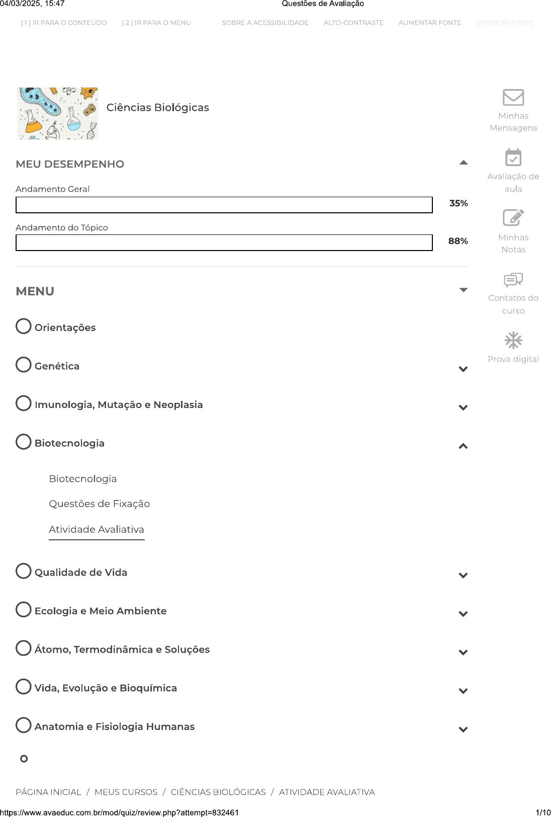 04/03/2025, 15:47 Questões de Avaliação [1] IR PARA CONTEÚDO [2] IR PARA MENU SOBRE A ACESSIBILIDADE ALTO-CONTRASTE AUMENTAR FONTE DIMINUIR FONTE Ciências Biológicas Minhas Mensagens MEU DESEMPENHO Avaliação de Andamento Geral aula 35% Andamento do Tópico 88% Minhas Notas MENU Contatos do curso Orientações Prova digital Genética Imunologia, Mutação e Neoplasia Biotecnologia Biotecnologia Questões de Fixação Atividade Avaliativa Qualidade de Vida Ecologia e Meio Ambiente Átomo, Termodinâmica e Soluções Vida, Evolução e Bioquímica Anatomia e Fisiologia Humanas PÁGINA INICIAL / MEUS CURSOS / CIÊNCIAS BIOLÓGICAS / ATIVIDADE AVALIATIVA https://www.avaeduc.com.br/mod/quiz/review.php?attempt=832461 1/1004/03/2025, 15:47 Questões de Avaliação [1] IR PARA CONTEÚDO [2] IR PARA O MENU SOBRE A ACESSIBILIDADE ALTO-CONTRASTE AUMENTAR FONTE DIMINUIR FONTE Questões de Avaliação Iniciado em terça, 4 mar 2025, 15:29 Estado Finalizada Concluída em terça, 4 mar 2025, 15:46 Tempo 17 minutos 22 segundos empregado Avaliar 10,00 de um máximo de 10,00(100%) Questão 1 Correto Atingiu 1,00 de 1,00 Um novo método para produzir insulina artificial que utiliza tecnologia de DNA recombinante foi desenvolvido por pesquisadores do Departamento de Biologia Celular da Universidade de Brasília (UnB) em parceria com a iniciativa privada. Os pesquisadores modificaram geneticamente a bactéria Escherichia coli para torná-la capaz de sintetizar hormônio. processo permitiu fabricar insulina em maior quantidade e em apenas 30 dias, um terço do tempo necessário para obtê-la pelo método tradicional, que consiste na extração do hormônio a partir do pâncreas de animais abatidos. Ciência Hoje, 24 abr. 2001. Disponível em: http://cienciahoje.uol.com.br (adaptado). A produção de insulina pela técnica do DNA recombinante tem, como consequência Escolha uma: a. aperfeiçoamento do processo de extração de insulina a partir do pâncreas suíno. b. a criação de animais transgênicos. C. progresso na técnica da síntese química de hormônios. d. impacto favorável na saúde de indivíduos diabéticos. e. a seleção de microrganismos resistentes a antibióticos. 2/1004/03/2025, 15:47 Questões de Avaliação [1] IR PARA CONTEÚDO [2] IR PARA O MENU SOBRE A ACESSIBILIDADE ALTO-CONTRASTE AUMENTAR FONTE DIMINUIR FONTE Correto Atingiu 1,00 de 1,00 Existem mais de 200 tipos de células no corpo humano colaborando entre si para formar os tecidos. As células têm uma vida dinâmica no organismo, surgindo pela divisão de uma célula precursora, desenvolvendo-se e morrendo. Mesmo após concluído período de crescimento, quando número de células necessariamente aumenta, organismo deve continuar a produzir novas células. Para a maioria das células do organismo, a renovação ocorre a partir de células tronco que existem nos diferentes tecidos. Quais são as características que diferenciam uma célula-tronco das demais células do organismo? Escolha uma: a. As células-tronco podem se reproduzir artificialmente nos laboratórios, gerando células filhas exatamente iguais entre si, mas mais especializadas do que a célula original. b. Elas são capazes de se proliferar originando duas células filhas exatamente iguais entre si e iguais à célula original e elas são capazes de se diferenciar, gerando células especializadas. C. São células de multipotência, ou seja, podem se proliferar e gerar todos os tipos de células especializadas de um organismo. d. Elas são células de pluripotência, podendo gerar todas as células especializadas do nosso organismo. e. Todas as células-tronco, tanto embrionárias quanto as de adulto, têm a característica de totipotência, ou seja, podem se proliferar e se diferenciar em quaisquer células do nosso organismo. https://www.avaeduc.com.br/mod/quiz/review.php?attempt=832461 3/1004/03/2025, 15:47 Questões de Avaliação [1] IR PARA CONTEÚDO [2] IR PARA MENU SOBRE A ACESSIBILIDADE ALTO-CONTRASTE AUMENTAR FONTE DIMINUIR FONTE Correto Atingiu 1,00 de 1,00 A amplificação de ácidos nucléicos é uma ferramenta molecular importante não só na ciência básica, mas também no desenvolvimento de estratégias clínicas que envolvem diagnóstico de doenças infecciosas, clonagem de genes e controle de qualidade industrial. PCR (polymerase chain reaction) é uma ferramenta chave nesses processos de amplificação. Qual das seguintes afirmativas melhor representa a etapa de anelamento na metodologia de PCR? Escolha uma: a. DNA molde é aquecido pra quebrar as pontes de hidrogênio entre as bases complementares. b. A polimerase se liga a cada primer de PCR e inicia a adição dos nucleotídeos. C. Os primers se anelam ao DNA molde pelo aumento de temperatura. d. A enzima DNA polimerase gera um primer que anela ao DNA complementar. e. Os primers formam pares de bases complementares com os nucleotídeos do DNA molde e anelam. 4/1004/03/2025, 15:47 Questões de Avaliação [1] IR PARA CONTEÚDO [2] IR PARA O MENU SOBRE A ACESSIBILIDADE ALTO-CONTRASTE AUMENTAR FONTE DIMINUIR FONTE Correto Atingiu 1,00 de 1,00 termo Bioética foi introduzido pelo biólogo Rensselaer Potter, em 1971. Na atualidade, a Bioética busca respostas para questões abrangentes, relacionadas ao crescente uso das técnicas de manipulação genética, e existe um consenso sobre modelo atualmente utilizado, principalmente na prática clínica. Quais são os 4 princípios bioéticos fundamentais e em qual modelo eles foram fundamentados? Escolha uma: a. Autonomia, beneficência, não-maleficência e justiça. Modelo principalista. b. Moralismo, cumprimento da lei, não-maleficência e justiça. Modelo principalista. C. Autonomia, moralismo, cumprimento da lei e beneficência. Modelo principalista. d. Autonomia, beneficência, não-maleficência e justiça. Modelo reducionista. e. Moralismo, cumprimento da lei, e justiça. Modelo reducionista. https://www.avaeduc.com.br/mod/quiz/review