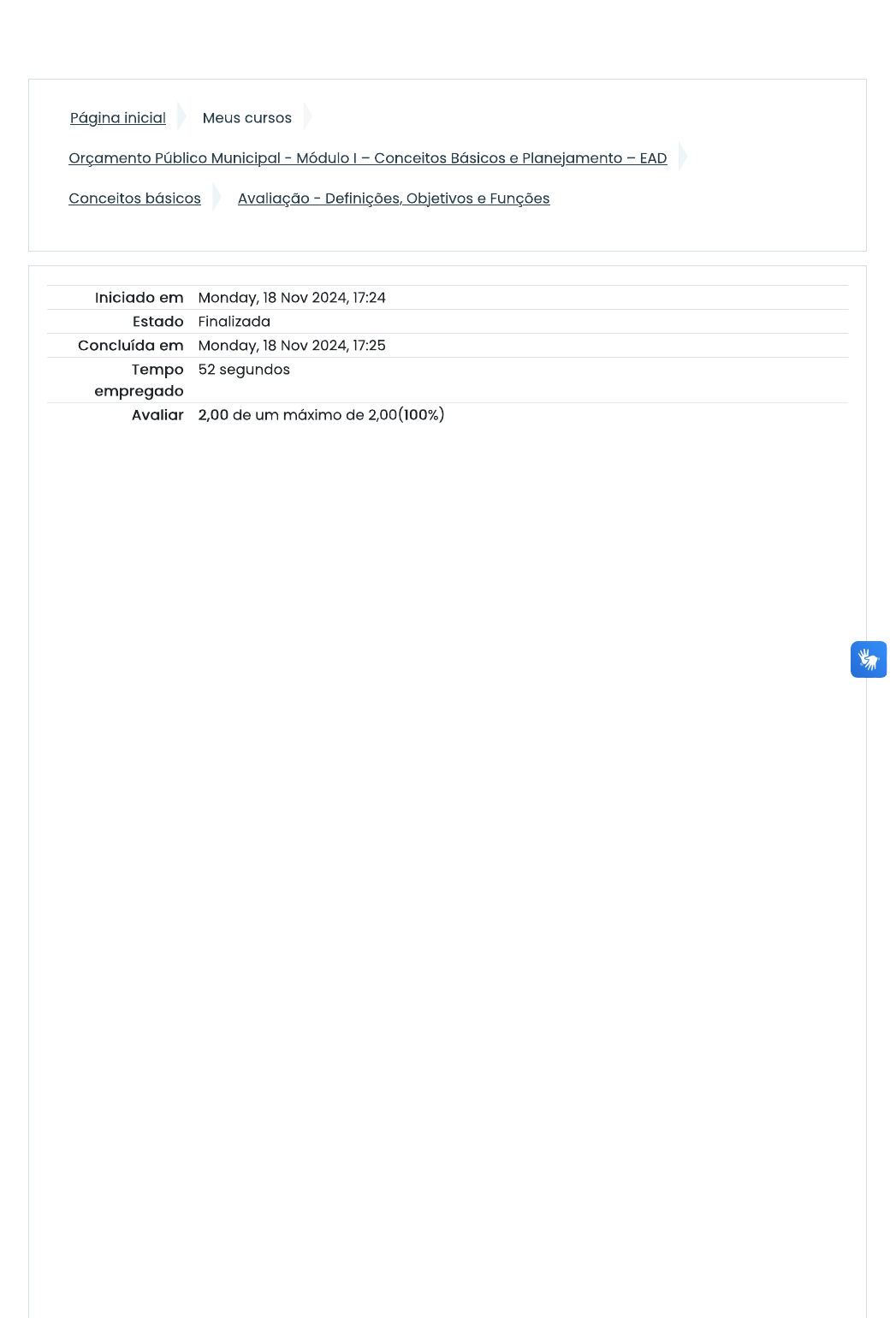 Avaliação - Definições, Objetivos e Funções https://emaspead.prefeitura.sp.gov.br/mod/quiz/review.php?attempt=796551&cmid=7360 1 of 3 18/11/2024, 18:45 Avaliação - Definições, Objetivos e Funções https://emaspead.prefeitura.sp.gov.br/mod/quiz/review.php?attempt=796551&cmid=7360 2 of 3 18/11/2024, 18:45 Avaliação - Definições, Objetivos e Funções https://emaspead.prefeitura.sp.gov.br/mod/quiz/review.php?attempt=796551&cmid=7360 3 of 3 18/11/2024, 18:45 Avaliação - Tipos de Orçamentos - Receitas Públicas. https://emaspead.prefeitura.sp.gov.br/mod/quiz/review.php?attempt=796698&cmid=7363 1 of 4 18/11/2024, 18:44 Avaliação - Tipos de Orçamentos - Receitas Públicas. https://emaspead.prefeitura.sp.gov.br/mod/quiz/review.php?attempt=796698&cmid=7363 2 of 4 18/11/2024, 18:44 Avaliação - Tipos de Orçamentos - Receitas Públicas. https://emaspead.prefeitura.sp.gov.br/mod/quiz/review.php?attempt=796698&cmid=7363 3 of 4 18/11/2024, 18:44 Avaliação - Tipos de Orçamentos - Receitas Públicas. https://emaspead.prefeitura.sp.gov.br/mod/quiz/review.php?attempt=796698&cmid=7363 4 of 4 18/11/2024, 18:44 Página inicial Meus cursos Orçamento Público Municipal - Módulo I – Conceitos Básicos e Planejamento – EAD Conceitos básicos Avaliação - Tipos de Despesa - Classificação Orçamentária Iniciado em Monday, 18 Nov 2024, 20:03 Estado Finalizada Concluída em Monday, 18 Nov 2024, 20:04 Tempo empregado 1 minuto 29 segundos Avaliar 4,00 de um máximo de 4,00(100%) https://emaspead.prefeitura.sp.gov.br/ https://emaspead.prefeitura.sp.gov.br/course/view.php?id=130 https://emaspead.prefeitura.sp.gov.br/course/view.php?id=130#section-1 https://emaspead.prefeitura.sp.gov.br/mod/quiz/view.php?id=7371 https://emaspead.prefeitura.sp.gov.br/badges/view.php?type=2&id=130 https://emaspead.prefeitura.sp.gov.br/admin/tool/lp/coursecompetencies.php?courseid=130 https://emaspead.prefeitura.sp.gov.br/grade/report/index.php?id=130 https://emaspead.prefeitura.sp.gov.br/ https://emaspead.prefeitura.sp.gov.br/my/ https://emaspead.prefeitura.sp.gov.br/calendar/view.php?view=month&course=130 javascript:void(0); javascript:void(0); Questão 1 Correto Atingiu 1,00 de 1,00 Preencha as lacunas com as palavras mais adequadas: As despesas ________________ e intraorçamentárias devem estar previstas na Lei Orçamentária Anual, ao passo que as despesas __________________ ocorrem ___________________. Assinale a alternativa que indica as palavras que preenchem adequadamente as colunas, respectivamente: Escolha uma opção: a. Extraorçamentárias; nunca; demasiadamente. b. Extraorçamentárias; financeiras; pouco. c. Orçamentárias; sigilosas; sempre. d. Públicas; extraorçamentárias; financeiramente. e. Orçamentárias; extraorçamentárias; financeiramente. Sua resposta está correta. Orçamentárias; extraorçamentárias; financeiramente. Resposta Correta Extraorçamentárias; financeiras; pouco. Resposta incorreta porque as despesas extraorçamentárias não estão previstas na Lei Orçamentária Anual, já que estão fora do orçamento público. Além disso, as despesas intraorçamentárias também têm um aspecto financeiro, e não necessariamente ocorrem pouco. Extraorçamentárias; nunca; demasiadamente. Resposta incorreta porque as despesas extraorçamentárias não estão previstas na Lei Orçamentária Anual, já que estão fora do orçamento público. Além disso, não é possível afirmar se as despesas em geral ocorrem pouco ou em demasia sem definir esses parâmetros e analisar o histórico da execução orçamentária. Orçamentárias; sigilosas; sempre. Resposta incorreta porque, em regra, as despesas orçamentárias e intraorçamentárias são consideradas públicas, enquanto o sigilo é considerado exceção. Não é possível afirmar se sempre ocorrem despesas sigilosas e, ainda assim, despesas orçamentárias e intraorçamentárias sigilosas devem estar previstas no orçamento público, ainda que detalhes sobre sua execução e seus beneficiários não estejam publicizados. Públicas; extraorçamentárias; financeiramente. Resposta incorreta porque não faz sentido diferenciar as despesas entre públicas, intraorçamentárias e extraorçamentárias, já que todas as despesas do governo são despesas públicas. https://emaspead.prefeitura.sp.gov.br/badges/view.php?type=2&id=130 https://emaspead.prefeitura.sp.gov.br/admin/tool/lp/coursecompetencies.php?courseid=130 https://emaspead.prefeitura.sp.gov.br/grade/report/index.php?id=130 https://emaspead.prefeitura.sp.gov.br/ https://emaspead.prefeitura.sp.gov.br/my/ https://emaspead.prefeitura.sp.gov.br/calendar/view.php?view=month&course=130 javascript:void(0); javascript:void(0); Questão 2 Correto Atingiu 1,00 de 1,00 Considere a seguinte afirmação: Orçamento não é dinheiro: é uma autorização para gastar, e não o dinheiro depositado no Tesouro. Assinale a alternativa que indica adequadamente a realidade do orçamento público e da sua relação com a disponibilidade financeira de um governo. Escolha uma opção: a. As despesas extraorçamentárias são aquelas que ocorrem quando os recursos são movimentados entre diferentes órgãos e entidades do governo, usando a modalidade de aplicação 91, e não afetam a disponibilidade financeira do Tesouro. b. Embora o governo planeje suas despesas usando o orçamento público, as receitas são previstas em outros instrumentos de planejamento, como a Matriz de Saldos Contábeis. c. Todas as alternativas apresentadas estão corretas. d. Quando o princípio do equilíbrio é observado, o volume de receitas previstas é equivalente ao volume de despesas orçadas, de forma que não haja mais despesas do que receitas, e não se gaste mais do que o recurso disponível. e. O aspecto orçamentário tem a ver com planejamento, e o aspecto financeiro é somente uma consequência disso. Ou seja, se o planejamento foi bem-feito, sobrará dinheiro no Tesouro. Sua resposta está correta. O 