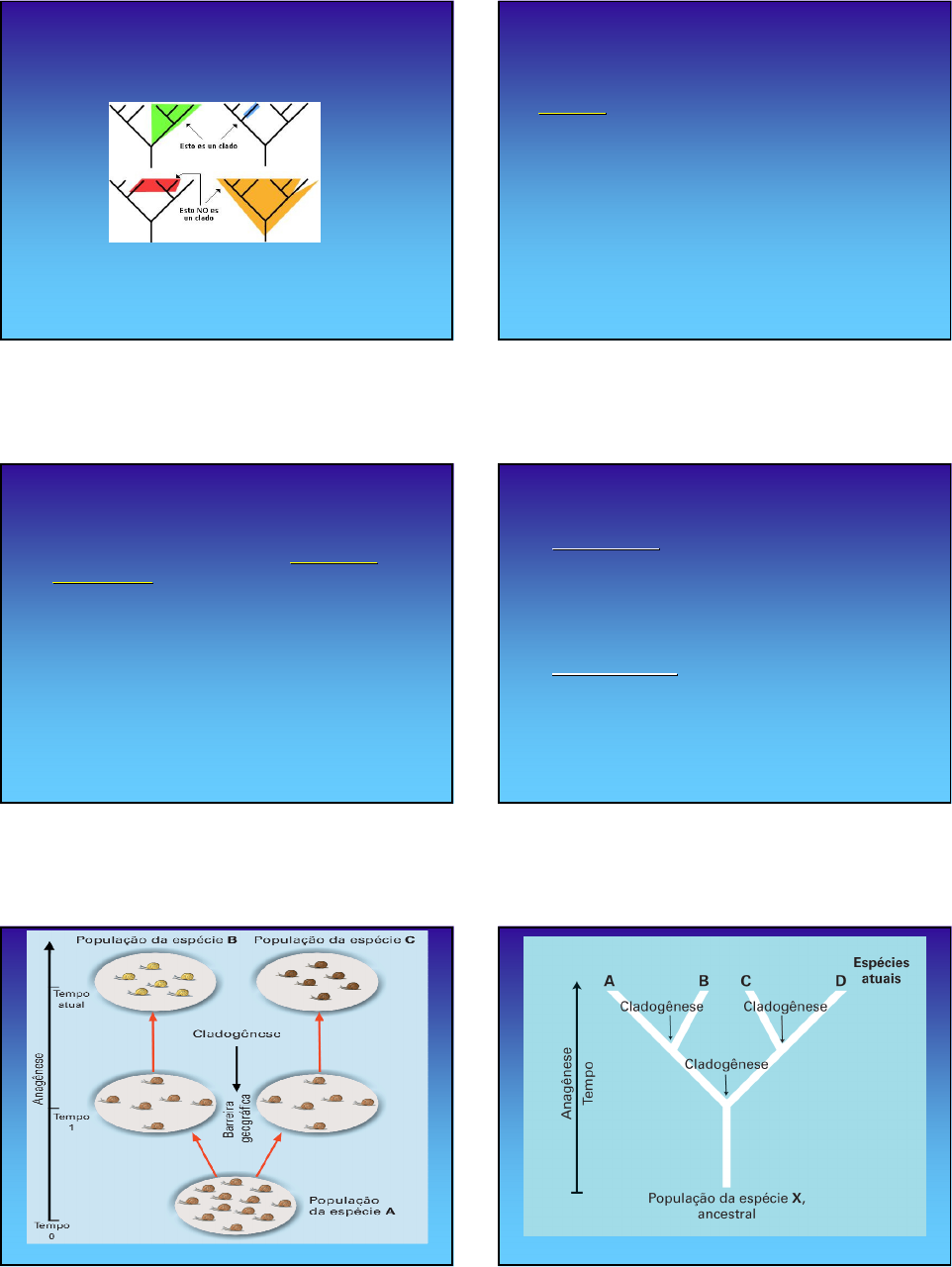 CLADOGRAMAS PROF. ALEXANDRE S. OSÓRIO Evolução e Sistemática � A sistemática é a área da Biologia que se preocupa principalmente em compreender a filogeniafilogenia: história evolutiva das espécies de seres vivos. � Sistemática evolutiva X sistemática filogenética ou cladística: • diferem nos critérios para se definir os táxons: a filogenética usa apenas as novidades evolutivas para formar grupos e há um método para se testar hipóteses de parentesco. � A cladística foi introduzida a partir da divulgação dos trabalhos de Willi Hennig, em 1966. Sistemática Filogenética ou Cladística � Entende-se que a diversidade de seres vivos é resultante de processos evolutivos e que esses processos ocorrem por anagêneseanagênese e por cladogênesecladogênese. � As relações evolutivas entre os seres vivos são representadas por diagramas denominados cladogramas (clado = ramo), em que se destacam os pontos onde ocorreram os eventos cladogenéticos e se considera a anagênese como processo que origina as novidades evolutivas. � A filogenia só pode ser reconstruída com base em caracteres derivados compartilhados. Anagênese e Cladogênese � AnagêneseAnagênese: processo pelo qual um caráter surge ou se modifica numa população ao longo do tempo, sendo responsável pelas novidades evolutivas. � CladogêneseCladogênese: processo responsável pela ruptura da coesão inicial numa população, gerando duas ou mais populações que não mais se comunicam. Cladogramas - Enraizado � Definir a raiz, ou seja, onde o cladograma se inicia, pode ser feito de várias formas: analisando a ontogenia ou comparando os organismos que se pretende estudar (grupos internos) com outros grupos evolutivamente próximos, cuja cladogênese tenha sido anterior (grupos externos). Cladogramas � Para cada caráter é destacada qual a condição ancestral (ou primitiva) e qual a condição derivada que surgiu a partir desta condição primitiva. � Somente as condições derivadas são usadas para definir os agrupamentos. � Somente são aceitos grupos monofilmonofilééticosticos:: formados por organismos que compartilham a mesma condição derivada de um ou mais caracteres e que descendem de um ancestral comum exclusivo. Cladogramas � Partes que compõem um cladograma: raiz, ramos, nós e terminais. � Os grupos de seres vivos compõem os terminais nos cladogramas. � Os ramos são as linhas do cladograma. � Nó: ponto de onde partem as ramificações. Representa o ancestral comum hipotético para todos os grupos acima dele. Os grupos acima de cada nó são monofiléticos. Cada nó simboliza um evento cladogenético. Princípio da parcimônia ♦ Marcar o menor número possível de passos no cladograma: características que ocorrem em um número maior de organismos são as primeiras a serem colocadas no cladograma a partir da raiz e assim sucessivamente. ♦ O princípio da parcimônia sugere que uma determinada característica derivada deve ter surgido uma única vez na evolução. Por isso deve ser apontada no cladograma uma única vez. Cladograma Allosaurus Stegosaurus Parasaurolophus Pachycephalosaurus Triceratops Quadril Púbis Dente Crânio Chifre Conceitos de espécie � Conceito biológico: organismos capazes de se reproduzir e dar origem a descendentes férteis. � Conceito filogenético: população ou grupo de populações definidas por uma ou mais condições derivadas.