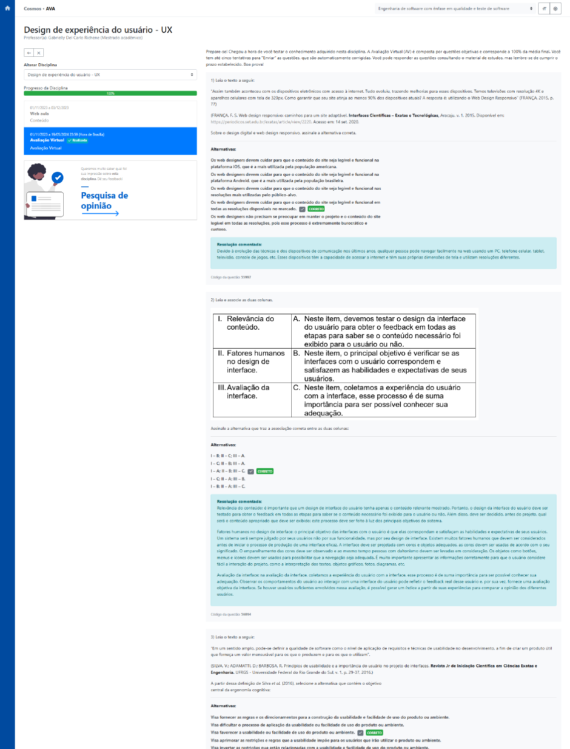 Cosmos AVA Engenharia de software com em qualidade e teste de software Design de experiência do usuário UX Professor(a): Gabrielly Del Carlo Richene (Mestrado acadêmico) Prepare-se! Chegou hora de você testar o conhecimento adquirido nesta disciplina. A Avaliação Virtual (AV) é composta por questões objetivas e corresponde a 100% da média final. Você tem até cinco tentativas para "Enviar" as questões, que são automaticamente corrigidas. Você pode responder as questões consultando o material de estudos, mas lembre-se de cumprir Alterar Disciplina prazo Boa prova! Design de experiência do usuário UX 1) Leia texto seguir: Progresso da Disciplina "Assim também aconteceu com os dispositivos eletrônicos com acesso à Tudo evoluiu. trazendo melhorias para esses dispositivos. Temos televisões com resolução 4K e 100% aparelhos celulares com tela de 320px. Como garantir que seu site atinja ao menos 90% dos dispositivos atuais? A resposta é: utilizando o Web Design Responsivo" 2015, p. 77) 01/11/2023 03/12/2023 Web aula (FRANÇA Web design responsivo: caminhos para um site Interfaces Exatas e Tecnológicas, Aracaju, 2015. Disponível em: Acesso em: 14 set. 2020. 01/11/2023 19/05/2024 23:59 (Hora de Sobre design digital e web design assinale a alternativa correta. Avaliação Virtual Realizada Avaliação Virtual Alternativas: Os web designers devem cuidar para que o conteúdo do site seja legível funcional na Queremos muito saber qual foi plataforma que é mais utilizada pela população americana. sua impressão sobre esta Os web designers devem cuidar para que o conteúdo do site seja legível e funcional na disciplina De seu plataforma Android que é a mais utilizada pela população brasileira. Os web designers devem cuidar para que o conteúdo do site seja legível e funcional nas Pesquisa de resoluções mais utilizadas pelo Os web designers devem cuidar para que o conteúdo do site seja legível e funcional em opinião todas as resoluções disponíveis no mercado. CORRETO Os web designers não precisam se preocupar em manter o projeto e conteúdo do site legível em todas as resoluções, pois esse processo é extremamente burocrático e custoso. Resolução comentada: Devido à evolução das técnicas e dos dispositivos de comunicação nos últimos qualquer pessoa pode navegar facilmente na web usando um PC. telefone celular, tablet. console de etc. Esses dispositivos têm a capacidade de acessar a internet têm suas próprias dimensões de tela e utilizam resoluções diferentes. Código da questão: 55997 2) Leia associe as duas colunas. I. Relevância do A. Neste item, devemos testar o design da interface conteúdo. do usuário para obter o feedback em todas as etapas para saber se o conteúdo necessário foi exibido para o usuário ou não. II. Fatores humanos B. Neste item, o principal objetivo é verificar se as no design de interfaces com o usuário correspondem e interface. satisfazem as habilidades e expectativas de seus usuários. III. Avaliação da C. Neste item, coletamos a experiência do usuário interface. com a interface, esse processo é de suma importância para ser possível conhecer sua adequação. Assinale a alternativa que traz a associação correta entre as duas colunas: Alternativas: B: III A. B: III C. CORRETO C; A: III B. A: III C. Resolução comentada: Relevância do conteúdo: é importante que um design de interface do usuário tenha apenas o conteúdo relevante mostrado. design da interface do usuário deve ser testado para obter o feedback em todas as etapas para saber se o conteúdo necessário foi exibido para usuário ou não. Além disso. deve ser decidido, antes do projeto, qual será o conteúdo apropriado que deve ser exibido: este processo deve ser feito à luz dos principais objetivos do Fatores humanos no design de interface: o principal objetivo das interfaces com usuário é que elas correspondam e satisfaçam as habilidades e expectativas de seus Um sistema será sempre julgado por seus usuários não por sua mas por seu design de interface. Existem muitos fatores humanos que devem ser considerados antes de iniciar processo de produção de uma interface A interface deve ser projetada com cores objetos adequados, as cores devem ser usadas de acordo com o seu significado. o emparelhamento das cores deve ser observado e ao mesmo tempo pessoas com daltonismo devem ser levadas em consideração. Os objetos como menus e devem ser usados para possibilitar que a navegação seja adequada. muito importante apresentar as informações corretamente para que usuário considere fácil interação do projeto, como a interpretação dos textos. objetos gráficos, etc. Avaliação da interface: na avaliação da coletamos a experiência do usuário com a interface. esse processo é de suma importância para ser possível conhecer sua adequação. Observar os comportamentos do ao interagir com uma interface do pode refletir o feedback real desse por sua vez. fornece uma avaliação objetiva da interface. Se houver suficientes envolvidos nessa é possível gerar um a partir de suas experiências para comparar a opinião dos diferentes Código da questão 56014 3) Leia texto seguir: "Em um sentido amplo, pode-se definir a qualidade de software como o nível de aplicação de requisitos e técnicas de usabilidade no a fim de criar um produto útil que forneça um valor mensurável para os que o produzem para os que utilizam". D.: BARBOSA R. Princípios de usabilidade e a importância do usuário no projeto de interfaces. Revista Jr de Iniciação Científica em Ciências Exatas e UFRGS Universidade Federal do Rio Grande do Sul. 1, A partir dessa definição de Silva et al. selecione a alternativa que contém o objetivo central da ergonomia cognitiva: Alternativas: Visa fornecer as regras e os direcionamentos para a construção da usabilidade e facilidade de uso do produto ou ambiente. Visa dificultar processo de aplicação da usabili