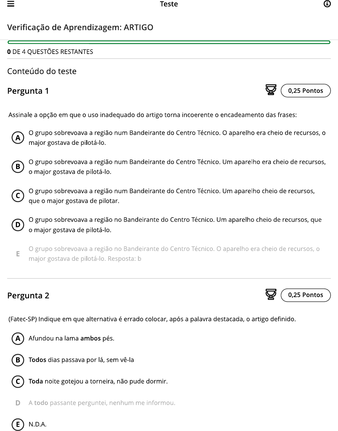 Teste i Verificação de Aprendizagem: ARTIGO 0 DE 4 QUESTÕES RESTANTES Conteúdo do teste Pergunta 1 0,25 Pontos Assinale a opção em que o uso inadequado do artigo torna incoerente o encadeamento das frases: O grupo sobrevoava a região num Bandeirante do Centro Técnico. aparelho era cheio de recursos, o A major gostava de pilotá-lo. grupo sobrevoava a região num Bandeirante do Centro Técnico. Um aparelho era cheio de recursos, B o major gostava de pilotá-lo. O grupo sobrevoava a região num Bandeirante do Centro Técnico. Um aparelho cheio de recursos, que o major gostava de pilotar. grupo sobrevoava a região no Bandeirante do Centro Técnico. Um aparelho cheio de recursos, que D o major gostava de pilotá-lo. O grupo sobrevoava a região no Bandeirante do Centro Técnico. O aparelho era cheio de recursos, E major gostava de pilotá-lo. Resposta: b Pergunta 2 0,25 Pontos (Fatec-SP) Indique em que alternativa é errado colocar, após a palavra destacada, o artigo definido. A Afundou na lama ambos pés. B Todos dias passava por lá, sem vê-la C Toda noite gotejou a torneira, não pude dormir. D A todo passante perguntei, nenhum me informou. E N.D.A.Pergunta 3 0,25 Pontos Leia: "As duas manas Lousadas! Secas, escuras e gárrulas como cigarras, desde longos anos, em Oliveira, eram elas as esquadrinhadoras de todas as vidas, as espalhadoras de todas as maledicências, as tecedeiras de todas as intrigas. E na desditosa cidade, não existia nódoa, pecha, bule rachado, coração dorido, algibeira arrasada, janela entreaberta, poeira a um canto, vulto a uma esquina, bolo encomendado nas Matildes, que seus olhinhos furantes de azeviche sujo não descortinassem e que sua solta língua, entre os dentes ralos, não comentasse com malícia " Eça de Queirós, A ilustre casa de Ramires. Nesse texto, o emprego de artigos definidos e a omissão de artigos indefinidos têm como efeito, respectivamente: atribuir às personagens traços negativos de caráter; apontar Oliveira como cidade onde tudo A acontece. acentuar a exclusividade do comportamento típico das personagens; marcar a generalidade das situações que são objeto de seus comentários. definir a conduta das duas irmãs como criticável; colocá-las como responsáveis pela maioria dos C acontecimentos na cidade. particularizar a maneira de ser das manas Lousadas; situá-las numa cidade onde são famosas pela D maledicência. E associar as ações das duas irmãs; enfatizar seu livre acesso a qualquer ambiente na cidade. Pergunta 4 0,25 Pontos (Fatec-SP) Indique o erro quanto ao emprego do artigo. A Em certos momentos, as pessoas as mais corajosas se acovardam. B Em certos momentos, as pessoas mais corajosas se acovardam. C Em certos momentos, pessoas, as mais corajosas, se acovardam. D Em certos momentos, as mais corajosas pessoas se acovardam. E N.D.A. Salvo pela última vez 15:56:05Filtro de questões (4) Salvar e fechar Enviar