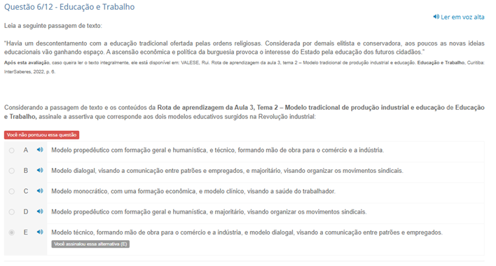 Questão 6/12 - Educação e Trabalho Ler em voz alta Leia a seguinte passagem de texto: "Havia um descontentamento com a educação tradicional ofertada pelas ordens Considerada por demais elitista e aos poucos as novas ideias educacionais vão ganhando A ascensão econômica e politica da burguesia provoca interesse do Estado pela educação dos futuros cidadãos." esta queira texto disponível VALESE Rota de aprendizagem da aula tema 2 - Modelo de produção industrial educação Educação Curitiba 2022 Considerando a passagem de texto e os da Rota de aprendizagem da Aula Tema 2 - Modelo tradicional de produção industrial e educação de Educação assinale a assertiva que corresponde aos dois modelos educativos surgidos na Revolução Vock não pontuou essa questão A 40 Modelo propedêutico com formação geral e formando mão de obra para e a B 40 Modelo visando a comunicação entre patrões e e visando organizar os movimentos sindicais 40 Modelo com uma formação e modelo visando a saúde do trabalhador D Modelo propedêutico com formação geral e humanistica e visando organizar os movimentos E 40 Modelo formando mão de obra para e a e modelo visando a comunicação entre patrões e Vool assinalou essa alternativa E