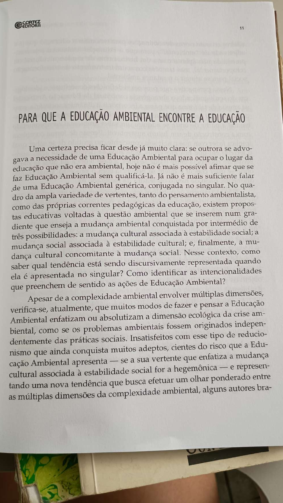 CORTEZ EDITORA 11 PARA QUE A EDUCAÇÃO AMBIENTAL ENCONTRE A EDUCAÇÃO Uma certeza precisa ficar desde já muito clara: se outrora se advo- gava a necessidade de uma Educação Ambiental para ocupar o lugar da educação que não era ambiental, hoje não é mais possível afimar que se faz Educação Ambiental sem qualificá-la. Já não é mais suficiente falar de uma Educação Ambiental genérica, conjugada no singular. No qua- dro da ampla variedade de vertentes, tanto do pensamento ambientalista, como das próprias correntes pedagógicas da educação, existem propos- tas educativas voltadas à questão ambiental que se inserem num gra- diente que enseja a mudança ambiental conquistada por intermédio de três possibilidades: a mudança cultural associada à estabilidade social; a mudança social associada à estabilidade cultural; e, finalmente, a mu- dança cultural concomitante à mudança social. Nesse contexto, como saber qual tendência está sendo discursivamente representada quando ela é apresentada no singular? Como identificar as intencionalidades que preenchem de sentido as ações de Educação Ambiental? Apesar de a complexidade ambiental envolver múltiplas dimensões, verifica-se, atualmente, que muitos modos de fazer e pensar a Educação Ambiental enfatizam ou absolutizam a dimensão ecológica da crise am- biental, como se os problemas ambientais fossem originados indepen- dentemente das práticas sociais. Insatisfeitos com esse tipo de reducio- nismo que ainda conquista muitos adeptos, cientes do risco que a Edu- cação Ambiental apresenta - se a sua vertente que enfatiza a mudança cultural associada à estabilidade social for a hegemônica e represen- tando uma nova tendência que busca efetuar um olhar ponderado entre as múltiplas dimensões da complexidade ambiental, alguns autores bra-criaram novas denominações que para a Educação renomear Ambiental a educação seja que com- já é sileiros adjetivada de "ambiental", para um instrumento de mudança cultural ou preendida não apenas mas também como como ambiental. um instrumento de transformação social comportamental, para se atingir a mudança que provoca redefinições conceituais e ideológi- cas do Nessa seu significado, perspectiva a abrangência passa a incorporar conceitual a dinâmica da Educação societária, Ambiental con- de tal forma que visualizar a complexidade am- dição se amplia sine qua non de para onde que se adquire seja possível um saber ambiental de forma comprometido biental a partir de um futuro sustentável. Pensar de se saber complexa com a construção com que o agir seja consciente, no sentido qual implica fazer nos movemos, o alcance de determinada ação, apre- o terreno coerência em que entre o que se quer, a base teórica da qual se parte, sentando se quer chegar e quem se beneficia com o processo. Qual enqua- dramento, onde pano de fundo ou leitura da realidade há. Não são poucos os trabalhos que mencionam estar em sintonia com princípios orientadores dessa prática pedagógica, demarcados nas grandes os conferências internacionais, e que são provenientes do campo da educação. Contudo, Loureiro constata que eles se esvaziaram de sen- tido, apesar de continuarem sendo citados nas ações de Educação Am- biental, aparentemente apenas como um fortuito ato mecânico. Porém, muitos deles também apresentam sua identidade situada no plano éti- embora curiosamente descolada das condições sociais, o que acarre- ta contradições entre o que se pretende e o que de fato se faz quanto aos objetivos e os resultados de um projeto de intervenção em Educação Ambiental. A crítica aqui elaborada aponta os limites da Educação Ambiental de caráter moralista que recai na concepção desse modo de fazer peda- gógico como se os humanos fossem seres passivos e totalmente sobredeterminados pela esfera ideal, subdimensionando ou ignorando a ação humana no tecido social, negando a existência do sujeito históri- e da Essa vertente enfatiza a dimensão ecológica em detri- mento das demais contextualizações do problema ambiental, promoven- do o entendimento da estrutura e funcionamento dos sistemas ecológi- cos, mas ignorando a sua interface com a dinâmica social. Loureiro aler-E FUNDAMENTOS DA EDUCAÇÃO AMBIENTAL ta que é preciso coerência, porque essa corrente moralista, na pode estar esvaziando o terreno da ação política, por colocar prática, formação do comportamento individual uma centralidade que na não trans- cor- responde ao seu papel na mudança social. Contra a unidimensionalidade das posturas idealistas que vêem na mudança cultural a única necessidade para se cultivar a Educação Am- biental, Loureiro enfatiza a irredutibilidade da dialética entre a mudan- ça social e a mudança cultural para se alcançar o propósito educativo em formar cidadãos de fato comprometidos com a construção de socieda- des ecologicamente prudentes e socialmente justas. Nesse sentido, afir- ma que não há mudança ética possível quando se ignora a sociedade em que se move, porque os valores não são um simples reflexo da estrutura econômica, mas são definidos a partir de condições históricas específi- cas, inseridas num movimento dialético de mútua constituição entre objetividade e subjetividade. Se as bases ecológicas da sustentabilidade não se localizam apenas esfera ideal, mas também na esfera material, no modo de produção na capitalista e nas relações sociais, parece então que a Educação Ambien- tal só poderá frutificar à medida que integrar o método dialético em sua tra- lógica de ação e reflexão. Nessa perspectiva, Loureiro enfatiza que de a científica do método dialético marxista é a melhor forma pen- dição transformar o mundo. E qualifica o conhecimento e uso todo desse deba- mé- sar todo e como algo "indispensável para a Educação Ambiental idéias são e construí- na complexidade ambiental", porque "