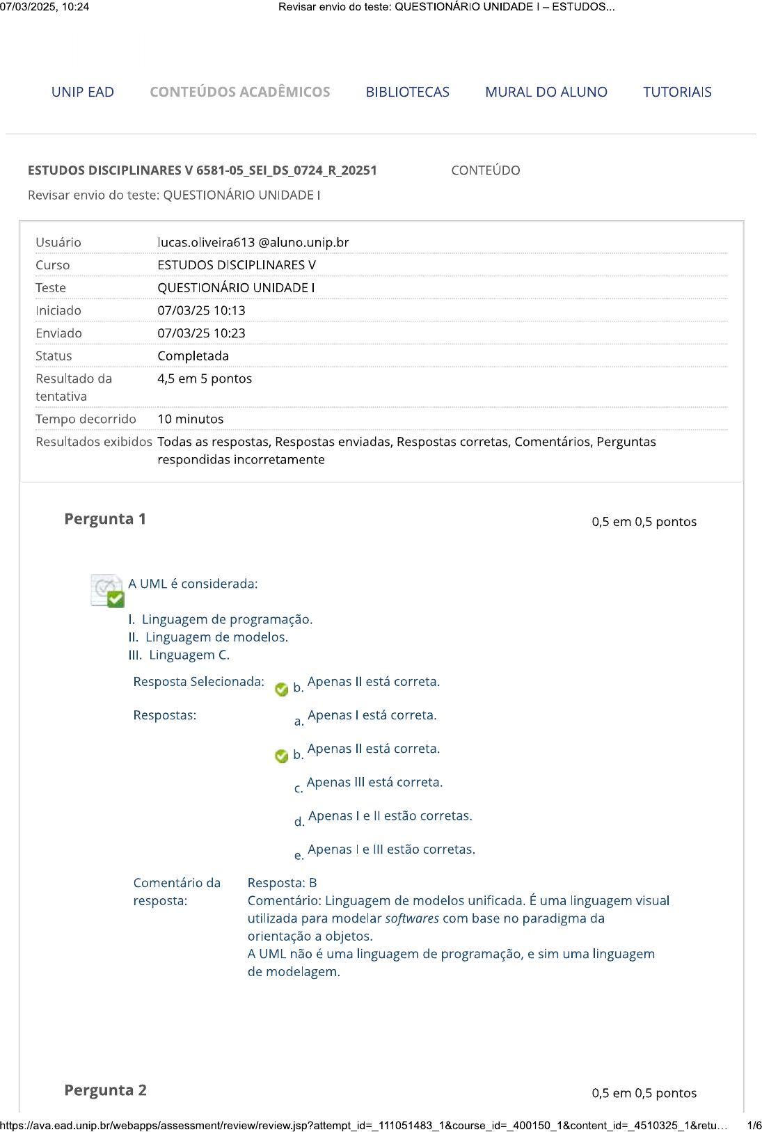 07/03/2025, 10:24 Revisar envio do teste: QUESTIONÁRIO UNIDADE ESTUDOS... UNIP EAD CONTEÚDOS ACADÊMICOS BIBLIOTECAS MURAL DO ALUNO TUTORIAIS ESTUDOS DISCIPLINARES V 6581-05_SEI_DS_0724_R_20251 CONTEÚDO Revisar envio do teste: QUESTIONÁRIO UNIDADE Usuário lucas.oliveira613@aluno.unip.b Curso ESTUDOS DISCIPLINARES V Teste QUESTIONÁRIO UNIDADE Iniciado 07/03/25 10:13 Enviado 07/03/25 10:23 Status Completada Resultado da 4,5 em 5 pontos tentativa Tempo decorrido 10 minutos Resultados exibidos Todas as respostas, Respostas enviadas, Respostas corretas, Comentários, Perguntas respondidas incorretamente Pergunta 1 0,5 em 0,5 pontos A UML é considerada: I. Linguagem de programação. II. Linguagem de modelos. III. Linguagem C. Resposta Selecionada: b. Apenas está correta. Respostas: Apenas está correta. a. b. Apenas II está correta. C. Apenas III está correta. d. Apenas e estão corretas. Apenas e III estão corretas. e. Comentário da Resposta: B resposta: Comentário: Linguagem de modelos unificada. É uma linguagem visual utilizada para modelar softwares com base no paradigma da orientação a objetos. A UML não é uma linguagem de programação, e sim uma linguagem de modelagem. Pergunta 2 0,5 em 0,5 pontos 1/610:24 Revisar envio do teste: QUESTIONÁRIO UNIDADE ESTUDOS... Descrever os passos a serem percorridos para a conclusão de uma atividade específica é função de qual diagrama? Resposta Selecionada: C. Diagrama de atividades. Respostas: Diagrama de sequência. a. b. Diagrama de caso de uso. Diagrama de atividades. C. d. Diagrama de pacotes. Diagrama de implantação. e. Comentário da Resposta: C resposta: Comentário: Esse diagrama busca descrever os passos a serem percorridos para a conclusão de uma atividade específica, podendo esta ser representada por um método ou algoritmo com um certo grau de complexidade. Pergunta 3 0,5 em 0,5 pontos Qual diagrama representa os subsistemas englobados por um sistema de forma a determinar as partes que o compõe? Resposta Selecionada: d. Diagrama de pacotes. Respostas: Diagrama de sequência. a. b. Diagrama de caso de uso. Diagrama de atividades. C. d. Diagrama de pacotes. Diagrama de implantação. e. Comentário da Resposta: D resposta: Comentário: Esse diagrama tem por objetivo representar os subsistemas englobados por um sistema de forma a determinar as partes que o compõem. Pode ser utilizado de maneira independente ou associado com outros diagramas. Pergunta 4 0,5 em 0,5 pontos Qual diagrama determina a necessidade de hardware do sistema e de suas características físicas, como servidores e estações de topologia e protocolo de comunicação? 2/607/03/2025, 10:24 Revisar envio do teste: QUESTIONÁRIO UNIDADE ESTUDOS... Resposta Selecionada: Diagrama de implantação. e. Respostas: Diagrama de sequência. a. b. Diagrama de caso de uso. Diagrama de atividades. C. d. Diagrama de pacotes. e. Diagrama de implantação. Comentário da Resposta: E resposta: Comentário: Esse diagrama determina as necessidades de hardware do sistema, as características físicas, como servidores, estações, topologias e protocolos de comunicação, ou seja, todo o aparato físico sobre o qual o sistema deverá ser executado. Pergunta 5 0,5 em 0,5 pontos Qual diagrama determina como os componentes estarão estruturados e irão interagir com o sistema de maneira adequada? Resposta Selecionada: b. Diagrama de componentes. Respostas: a. Diagrama de sequência. b. Diagrama de componentes. C. Diagrama de atividades. d. Diagrama de pacotes. Diagrama de implantação. e. Comentário da Resposta: B resposta: Comentário: diagrama de componentes representa por meio de notação (desenho) a interação entre os elementos do sistema, esta representação deve ocorrer de forma estruturada. Com isso, pode-se representar de forma coerente como o sistema irá se comportar no futuro. Pergunta 6 0,5 em 0,5 pontos Qual diagrama determina os atributos e métodos que serão utilizados? Resposta Selecionada: d. Diagrama de classe Respostas: a. Diagrama de sequência. 3/607/03/2025, 10:24 Revisar envio do teste: QUESTIONÁRIO UNIDADE ESTUDOS... b. Diagrama de caso de uso. Diagrama de atividades. C. d. Diagrama de classe. Diagrama de implantação. e. Comentário da Resposta: D resposta: Comentário: Esse diagrama define a estrutura das classes utilizadas pelo sistema, determinando os atributos e métodos possuídos por cada uma, além de estabelecer como elas se relacionam e trocam informações entre Pergunta 7 0,5 em 0,5 pontos Como é chamado o local em que os elementos de uma abstração são armazenados? Resposta Selecionada: b. Encapsulamento. Respostas: a. Modularidade. b. Encapsulamento. C. Abstração. d. Atributos. Hierarquia. e. Comentário da Resposta: B resposta: Comentário: Após a realização de uma abstração, encontram-se os elementos da mesma, e estes devem ser arquivados de uma forma correta para acesso futuro, este armazenamento é chamado de encapsulamento. Pergunta 8 0 em 0,5 pontos As características essenciais de um objeto que o distingue de todos os outros objetos são chamadas de: Resposta Selecionada: x e. Modelo. Respostas: a. Abstração. b. Encapsulamento. Classe. C. d. Pacote. 4/607/03/2025, 10:24 Revisar envio do teste: QUESTIONÁRIO UNIDADE ESTUDOS... e. Modelo. Pergunta 9 0,5 em 0,5 pontos Objetos são: I. Abstrações. II. Independentes. III. IV. Dependentes. Resposta Selecionada: b. Apenas I, e III estão corretas. Respostas: Apenas IV está correta. a. b. Apenas I, e III estão corretas. Apenas I, II e IV estão corretas. d. Apenas II, III e IV estão corretas. Apenas I, III e IV estão corretas. e. Comentário Resposta: B da resposta: Comentário: Todo objeto dentro do sistema possui características únicas de objeto, e estas características são levantadas após uma análise e realização de abstração, para que, dessa forma, possa saber, além dos elementos abstraídos, as entidades que pertencem a esse objeto. E va