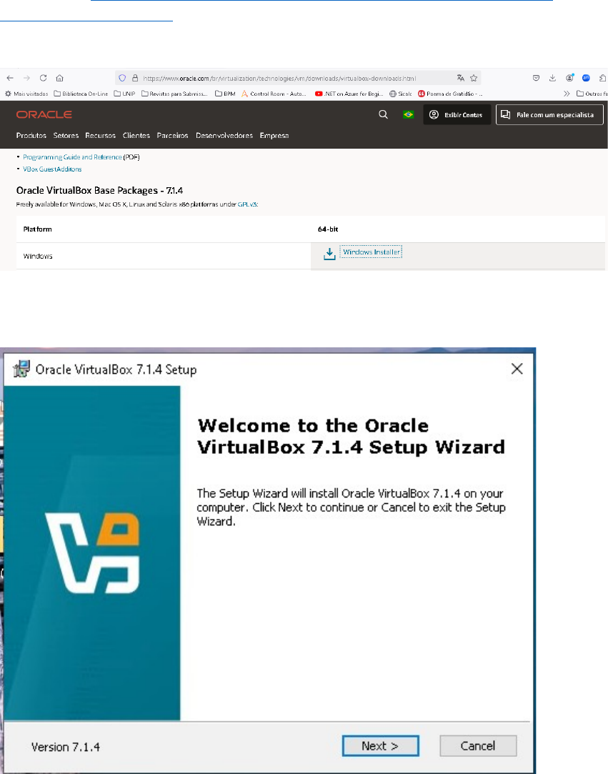 Instalando a máquina virtual para Windows Vá para o site https://www.oracle.com/br/virtualization/technologies/vm/downloads/virtualbox-downloads.html e baixe o virutal box para Windows Após o download execute o .exe e uma tela assim abrirá e pressione next Aceite as condições e pressione next novamente A tela de customização aparecerá e de next novamente Na próxima tela ele informa que a rede será desconectada temporariamente, então feche qualquer aplicativo que esteja rodando e necessite de rede antes de continuar Caso esteja faltando algumas dependências para rodar o virtual box ele abrira a seguinte tela e é só dar yes Nesse ponto ele pergunta onde deve criar as shortcuts e é só dar next Agora com todos os parâmetros setados é só dar o install Desmarque o checkbox, para ainda não iniciarmos o virtualbox, e só dar finish Instalando o Linux na máquina virtual Fazer o download no site do Linux https://ubuntu.com/download/desktop clicando no botão de download (botão verde da figura abaixo) Após finalizar o download, acione o virtual box na barra de tarefas Irá abrir a tela abaixo e devemos clicar em ferramentas e depois em novo Irá abrir uma tela de configurações onde iremos preencher: Nome : UbuntuVM (se colocar o prefixo Ubuntu ele já irá preencher os campos tipo, sybtype e versão) Pasta: Onde irá ser criada a VM Imagem ISO: Imagem do sistema operacional que iremos instalar. No caso é só preencher o caminho onde esta o sistema operacional que acabamos de baixar Depois de tudo preenchido, clicar em próximo Após isso vem a configuração do usuário de acesso, nesse caso você pode deixar o nome do usuário como esta ou mudar, mas não se esqueça de alterar a senha para deixar a sua vm mais segura Na próxima tela iremos fazer a configuração do hardware que será usado na nossa VM. Após a configuração clicar em próximo. Nessa tela iremos configurar o tamanho do disco rígido da nossa VM Agora é só conferir se tudo esta correto (caso não esteja clique no botão voltar para chegar até o item que você deseja alterar) e clicar finalizar image6.png image7.png image8.png image9.png image10.png image11.png image12.png image13.png image14.png image15.png image16.png image17.png image1.png image2.png image3.png image4.png image5.png