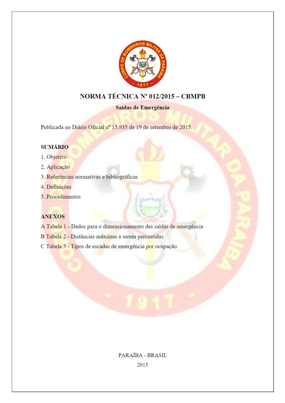 DE 1917 NORMA TÉCNICA 012/2015 - CBMPB Saídas de Emergência Publicada no Diário Oficial 15.935 de 19 de setembro de 2015. SUMÁRIO 1. Objetivo 2. Aplicação 3. Referências normativas e bibliográficas 4. Definições 5. Procedimentos ANEXOS A Tabela 1 - - Dados para o dimensionamento das saídas de emergência B Tabela 2 - Distâncias máximas a serem percorridas C Tabela 3 - Tipos de escadas de emergência por ocupação 1917 PARAÍBA - BRASIL 20151. OBJETIVO Estabelecer os requisitos mínimos necessários para o dimensionamento das saídas de emergência para que sua população possa abandonar a edificação, em caso de incêndio ou pânico, completamente protegida em sua integridade física, e permitir o acesso do CBMPB para o salvamento de pessoas e/ou combate ao incêndio, atendendo ao previsto na Lei Estadual n° 9.625/2011 Código Estadual de Proteção Contra Incêndio, Explosão e Controle de Pânico. 2. APLICAÇÃO Esta Norma Técnica (NT) aplica-se a todas as edificações, exceto para as ocupações destinadas à divisão F-3 e F-7, com população total superior a 2.500 pessoas, onde deve ser aplicada a NT CBMPB 010/2014 - Centros esportivos e de exibição Requisitos de segurança contra Nota: Para a classificação das ocupações constantes nesta NT, consultar as Tabela 1 da NT CBMPB 3. REFERÊNCIAS NORMATIVAS E BIBLIOGRÁFICAS NBR 5410 - Instalações elétricas de baixa tensão. NBR 5413 Iluminância de interiores. NBR NM 207 - Elevadores elétricos de passageiros. NBR 6479 - Portas e vedadores - determinação da resistência ao fogo. NBR 7199 Projeto, execução e aplicações de vidros na construção civil. NBR 9050 - Acessibilidade à edificações, mobiliário, espaços e equipamentos urbanos. NBR 9077 - Saídas de emergências em NBR 10898 - Sistemas de iluminação de emergência. NBR 11742 Porta corta-fogo para saídas de emergência. NBR 11785 Barra antipânico requisitos. NBR 13434 Sinalização de segurança contra incêndio e pânico 3 partes. NBR 13435 Sinalização de segurança contra incêndio e pânico. NBR 13437 Símbolos gráficos para sinalização contra incêndio e pânico. NBR 13768 Acessórios destinados a PCF para saídas de emergência. NBR 14718 Guarda-corpos para edificação. NBR 17240 Sistema de detecção e alarme de incêndio. NFPA 101 - Life SafetyThe Building Regulations, 1991 Edition. Means of Escape. BS 5588 Fire precaution in the design and construction of buildings. BS 7941-1 - Methods for measuring the skid resistence of pavement surfaces. Japan International Cooperation Agency, tradução do Código de Segurança Japonês pelo Corpo de Bombeiros do Distrito Federal, volume 1, edição de março de 1994. Normas Técnicas (NT's) do CBMPB. Instrução Técnica n° 0011/2014 CBPMSP 4. DEFINIÇÕES Para os efeitos desta NT aplicam-se as definições constantes da NT do CBMPB de Terminologia de segurança contra incêndio ou NBR's da ABNT na inexistência de NT do CBMPB. 5. PROCEDIMENTOS 5.1 Classificação das edificações 5.1.1 Para os efeitos desta NT, as edificações são classificadas quanto à ocupação e à altura, conforme a NT - CBMPB n° 004/2013. 5.2 Componentes da saída de emergência 5.2.1 A saída de emergência compreende o seguinte: a. acessos; b. rotas de saídas horizontais, quando houver, e respectivas portas ou espaço livre exterior, nas edificações térreas; escadas ou rampas; d. descarga; e. elevador de emergência. 5.3 Cálculo da população 5.3.1 As saídas de emergência são dimensionadas em função da população daedificação. 5.3.2 A população de cada pavimento da edificação é calculada pelos coeficientes da Tabela 1 (Anexo "A"), considerando sua ocupação dada na Tabela 1 - Classificação das edificações e áreas de risco quanto à ocupação da NT - CBMPB n° 004/2013. 5.3.3 Exclusivamente para o cálculo da população devem ser incluídas nas áreas de pavimento: a. as áreas de terraços, sacadas, beirais e platibandas, excetuadas pertencentes às edificações dos grupos de ocupação A, B e H; b. as áreas totais cobertas das edificações F-3 e F-6, inclusive canchas e assemelhados; as áreas de escadas, rampas e assemelhados, no caso de edificações dos grupos F-3, F-6 e F-7, quando, em razão de sua disposição em planta, esses lugares puderem, eventualmente, ser utilizados como arquibancadas. 5.3.4 Exclusivamente para o cálculo da população as áreas de elevadores são excluídas das áreas de pavimento. 5.4 Dimensionamento das saídas de emergência 5.4.1 Largura das saídas 5.4.1.1 A largura das saídas deve ser dimensionada em função do número de pessoas que por elas deva transitar, observados os seguintes critérios: a. os acessos são dimensionados em função dos pavimentos que sirvam à população; b. as escadas, rampas e descargas são dimensionadas em função do pavimento de maior população, o qual determina as larguras mínimas para os lanços correspondentes aos demais pavimentos, considerando-se o sentido da saída.5.4.1.2 A largura das saídas, isto é, dos acessos, escadas, descargas, é dada pela seguinte fórmula: N = Número de unidades de passagem, arredondado para número inteiro imediatamente superior. P = População, conforme coeficiente da Tabela 1 (Anexo "A"), e critérios das seções 5.3 e 5.4.1.1. C = Capacidade da unidade de passagem conforme Tabela 1 Notas: 1. Unidade de passagem: largura mínima para a passagem de um fluxo de pessoas, fixada em 0,55 m; 2. Capacidade de uma unidade de passagem: é o de pessoas que passa por esta unidade em 1 3. A largura mínima da saída é calculada pela multiplicação do N pelo fator 0,55, resultando na quantidade, em metros, da largura mínima total das 5.4.1.2.1 No cálculo da largura das saídas, deve ser atendida a metragem total calculada na somatória das larguras, quando houver mais de uma saída, aceitando-se somente o que for múltiplo de 0,55 (1 UP). 5.4.2 Larguras mínimas a serem a