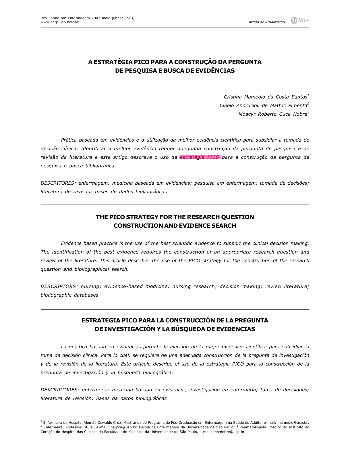 OnlineRev Latino-am Enfermagem 2007 maio-junho; 15(3) www.eerp.usp.br/rlae Artigo de Atualização A ESTRATÉGIA PICO PARA A CONSTRUÇÃO DA PERGUNTA DE PESQUISA E BUSCA DE EVIDÊNCIAS Cristina Mamédio da Costa Santos1 Cibele Andrucioli de Mattos Pimenta2 Moacyr Roberto Cuce Nobre3 Prática baseada em evidências é a utilização da melhor evidência científica para subsidiar a tomada de decisão clínica. Identificar a melhor evidência requer adequada construção da pergunta de pesquisa e de revisão da literatura e este artigo descreve o uso da estratégia PICO para a construção da pergunta de pesquisa e busca bibliográfica. DESCRITORES: enfermagem; medicina baseada em evidências; pesquisa em enfermagem; tomada de decisões; literatura de revisão; bases de dados bibliográficas THE PICO STRATEGY FOR THE RESEARCH QUESTION CONSTRUCTION AND EVIDENCE SEARCH Evidence based practice is the use of the best scientific evidence to support the clinical decision making. The identification of the best evidence requires the construction of an appropriate research question and review of the literature. This article describes the use of the PICO strategy for the construction of the research question and bibliographical search. DESCRIPTORS: nursing; evidence-based medicine; nursing research; decision making; review literature; bibliographic databases ESTRATEGIA PICO PARA LA CONSTRUCCIÓN DE LA PREGUNTA DE INVESTIGACIÓN Y LA BÚSQUEDA DE EVIDENCIAS La práctica basada en evidencias permite la elección de la mejor evidencia científica para subsidiar la toma de decisión clínica. Para lo cual, se requiere de una adecuada construcción de la pregunta de investigación y de la revisión de la literatura. Este artículo describe el uso de la estrategia PICO para la construcción de la pregunta de investigación y la búsqueda bibliográfica. DESCRIPTORES: enfermería; medicina basada en evidencia; investigácion en enfermaría; toma de decisiones; literatura de revisión; bases da datos bibliográficas 1 Enfermeira do Hospital Alemão Oswaldo Cruz, Mestranda do Programa de Pós-Graduação em Enfermagem na Saúde do Adulto, e-mail: mamedio@usp.br; 2 Enfermeira, Professor Titular, e-mail: parpca@usp.br. Escola de Enfermagem da Universidade de São Paulo; 3 Reumatologista; Médico do Instituto do Coração do Hospital das Clínicas da Faculdade de Medicina da Universidade de São Paulo, e-mail: mrcnobre@usp.br OnlineRev Latino-am Enfermagem 2007 maio-junho; 15(3) www.eerp.usp.br/rlae INTRODUÇÃO O primeiro ensaio clínico randomizado (ECR) foi publicado no British Medical Journal em 1948(1). No século XX, houve refinamento das técnicas de investigação em saúde, aprimoramento dos ensaios clínicos e hoje há milhares de ensaios clínicos nas bases de dados. Os resultados dos ECR mostraram-se conflitantes em situações onde objetivos e objetos de pesquisa eram semelhantes e geraram questionamentos sobre a efetividade, fundamentação, indicações e resultados de várias práticas em saúde. Essas dúvidas motivaram a construção de um novo paradigma, chamado Medicina Baseada em Evidências (MBE), que, à medida que os preceitos da MBE foram incorporados a outras disciplinas, passou-se a chamar Prática Baseada em Evidências (PBE)(2). A PBE prevê metodologias e processos para a identificação de evidências de que um certo tratamento, ou meio diagnóstico, é efetivo, estratégias para avaliação da qualidade dos estudos e mecanismos para a implementação na assistência. Este artigo centra-se na etapa inicial da PBE, a identificação de evidências, que requer adequada construção da pergunta de pesquisa e de busca bibliográfica. O movimento da PBE teve origem simultânea na McMaster University (Ontario, Canadá) e na University of York (Reino Unido)(3). Evidência é aquilo que é claro, a constatação de uma verdade que não suscita qualquer dúvida. Evidência científica representa uma prova de que um determinado conhecimento é verdadeiro ou falso. Para que se tenha evidência científica é necessário que exista pesquisa prévia, conduzida dentro dos preceitos científicos(4). Archie Cochrane (Reino Unido) teve profunda influência na avaliação das intervenções médicas, estabelecendo a importância dos ECR para avaliação da efetividade dos tratamentos(5). A David Sackett (Canadá) é creditada a definição clássica da MBE: uso consciencioso, explícito e sensato da melhor evidência disponível na tomada de decisão sobre o cuidado a pacientes, acrescida da experiência do médico e das preferências do paciente(6). A PBE visa a melhoria do cuidado, por meio da identificação e promoção de práticas que funcionem e eliminação das ineficientes ou prejudiciais(7) e minimização da lacuna entre a geração da evidência e sua aplicação no cuidado ao paciente. Na Tabela 1 estão apresentadas as etapas da PBE(7-11). Tabela 1 - Etapas da Prática Baseada em Evidências ocinílcamelborpmuedoãçacifitnedI-1 oãsiveR acitámetsiS acifícepseeetnaveleracinílcoãtseuqamuedoãçalumroF-2 sacifítneicsaicnêdivesadacsuB-3 sievínopsidsaicnêdivesadoãçailavA-4 saicnêdivesadacinílcedadilibacilpaadoãçailavA-5 etneicapoaodadiuconaicnêdiveadoãçatnemelpmI-6 açnadumadsodatlusersodoãçailavA-7 As etapas 1, 2, 3 e 4 representam o desenvolvimento dos estudos chamados revisões sistemáticas, modelo de pesquisa fundamental dentro da PBE. Revisão sistemática representa a utilização de método padronizado para sintetizar os dados de múltiplos estudos primários(8). As revisões de literatura tradicionais (hoje chamadas revisões narrativas) há muito são criticadas, uma vez que o método de busca bibliográfica e seleção dos estudos não são padronizados e explicitados. Os resultados obtidos com tais revisões são tendenciosos, não esgotam toda a literatura disponível sobre o tema pesquisado e geralmente são inconclusivos. A busca de evidência requer adeq