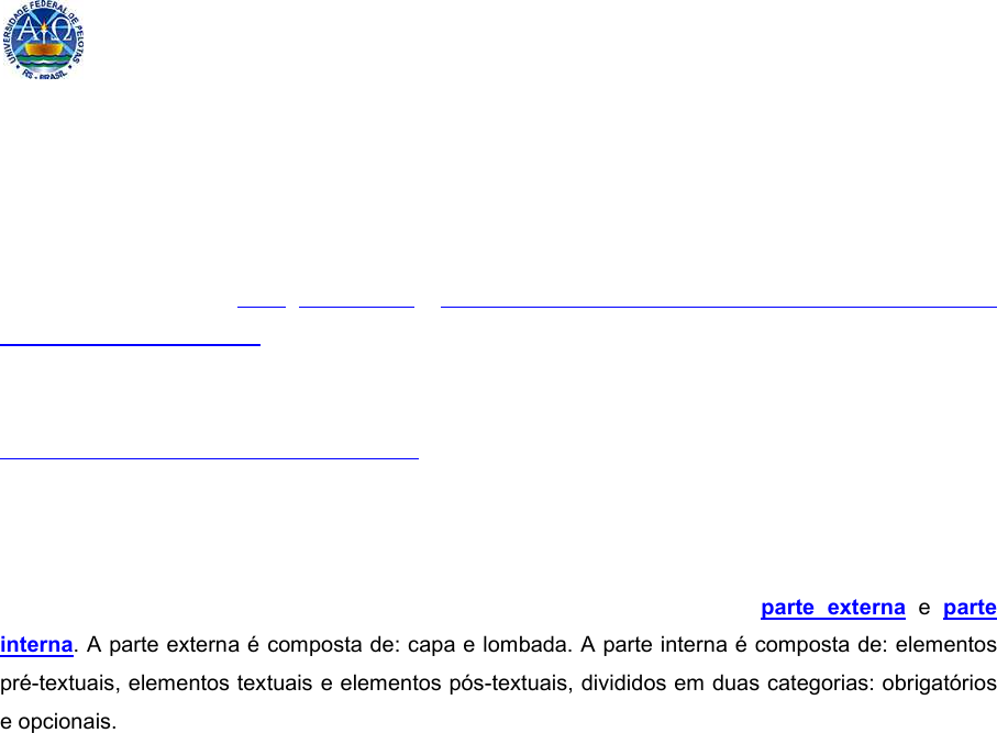 Apresentação A Universidade Federal de Pelotas (UFPel) apresenta seu Manual para elaboração de Trabalhos Acadêmicos: Tese, Dissertação e Trabalho de Conclusão de Curso de Graduação (TCC) e de Especialização (TCCP), com adaptações para esta Instituição, aprovado pelo COCEPE. Tem como principal objetivo padronizar sua produção científica. Os critérios utilizados em sua elaboração são provenientes das Normas Técnicas que tratam da Documentação e Informação editadas pela Associação Brasileira de Normas Técnicas (ABNT online, acesso pelo proxy da UFPel). Trabalhos acadêmicos – Apresentação (NBR 14724) A estrutura dos trabalhos acadêmicos compreende duas partes: parte externa e parte interna . A parte externa é composta de: capa e lombada. A parte interna é composta de: elementos pré-textuais, elementos textuais e elementos pós-textuais, divididos em duas categorias: obrigatórios e opcionais. http://abntcolecao.com.br/ufpel Catiuscie Realce Elementos que compõe um Trabalho Acadêmico Parte externa ����Capa (obrigatório) ����Lombada (opcional) Parte interna ���� Elementos Pré - Textuais • Folha de Rosto (Obrigatório) ���� Ficha catalográfica • Errata (Opcional) • Folha de Aprovação (Obrigatório) • Dedicatória (Opcional) • Agradecimentos (Opcional) • Epígrafe (Opcional) • Resumo (Obrigatório) • Resumo em Língua Estrangeira (Obrigatório) • Lista de Figuras (Opcional) • Lista de Tabelas (Opcional) • Lista de Abreviaturas e Siglas (Opcional) • Lista de Símbolos (Opcional) • Sumário (Obrigatório) ����Elementos Textuais • Introdução (Obrigatório) • Desenvolvimento (Capítulos) (Obrigatório) • Conclusão ou Considerações Finais (Obrigatório) ����Elementos Pós-Textuais • Referências (Obrigatório) • Glossário (Opcional) • Apêndices (Opcional) • Anexos (Opcional) • Índice (Opcional) Níveis de Descrição para elaboração dos Trabalhos A cadêmicos Normas Gerais de Citação Notas de Rodapé Normas Gerais de Apresentação Gráfica Exemplos de Referências Numeração Progressiva Catiuscie Realce Catiuscie Realce Catiuscie Realce Catiuscie Realce Catiuscie Realce Catiuscie Realce Catiuscie Realce Níveis de descrição Verifique junto ao Coordenador de seu Curso ou seu Orientador qual nível de descrição você deve utilizar para a elaboração de seu trabalho acadêmico. Opte por um dos níveis de descrição a seguir: Nível de Descrição Tradicional Nível de Descrição em Capítulos Nível de Descrição em Capítulos não convencionais Nível de Descrição em Artigos Regras gerais Informe-se junto ao seu Curso de Graduação ou Programa de Pós-Graduação para a escolha do Nível de Descrição e, se necessário, a impressão de cópias . A Biblioteca não recebe cópia impressa. Para integrar o acervo da Biblioteca deverá ser entregue somente uma cópia em meio digital, a qual será disponibilizada nas Bases de Dados, Pergamum (Acervo das Bibliotecas da UFPel), TEDE (Teses e Dissertações) da UFPel e Biblioteca Digital de Dissertações e Teses do IBICT, juntamente com o Termo de Autorização para inserir Trabalho Acadêmico nas Bases de Dados da UFPel. http://pergamum.ufpel.edu.br http://pergamum.ufpel.edu.br http://www.ufpel.edu.br/tede http://bddt.ibict.br http://bddt.ibict.br Capa Elemento obrigatório. Deve ser confeccionada conforme as versões abaixo. Todos os elementos devem ser redigidos em fonte Arial tamanho 12, centralizados, em negrito e entrelinhas de 1,5cm. Versão impressa: encadernação em brochura com lombada e logotipo. - Modelo de Capa Impressa Versão em CD - Modelo de Capa para CD Catiuscie Realce Catiuscie Realce Catiuscie Realce Lombada Elemento obrigatório. Utilizada para capa em versão impressa. Todos os elementos devem ser redigidos em fonte Arial tamanho 12 e em negrito. Modelo de Lombada Folha de Rosto Elemento obrigatório. Devem constar os dados necessários à identificação do trabalho, a identificação da natureza e a finalidade do trabalho acadêmico. Todos os elementos devem ser redigidos em fonte Arial tamanho 12, centralizados, apenas autor e título, em negrito e entrelinhas de 1,5cm. A natureza do trabalho deve ser com espaçamento simples e recuado 7cm da margem esquerda. Modelo de Folha de Rosto para Tese Modelo de Folha de Rosto para Dissertação Modelo de Folha de Rosto para Trabalho de Conclusão de Curso Catiuscie Realce Catiuscie Realce Ficha catalográfica Quando finalizado o trabalho, deve ser solicitada no Programa de Geração de Fichas do Sistema de Bibliotecas da UFPel em: http://sisbi.ufpel.edu.br/?p=reqFicha Sua localização é no verso da folha de rosto para versão impressa ou após a folha de rosto na versão digital. Deve ser redigida em fonte Arial, 10, com margem alinhada à esquerda e entrelinhas simples. Consulte os trabalhos acadêmicos da UFPel em: http://www.ufpel.edu.br/tede/ ou http://pergamum.ufpel.edu.br http://sisbi.ufpel.edu.br/?p=reqFicha http://www.ufpel.edu.br/tede/ http://pergamum.ufpel.edu.br Errata Elemento opcional. Deve ser inserida e colada logo após a folha de rosto, constituída pela referência do trabalho e pelo texto da errata. Todos os elementos devem ser redigidos em fonte Arial tamanho 12, título centralizado, sem indicativo numérico, texto justificado e entrelinhas de 1,5cm. Modelo de Errata Catiuscie Realce Folha de Aprovação Elemento obrigatório. Deve ser preenchida com os dados do trabalho e data de aprovação. Todos os elementos devem ser redigidos em fonte Arial tamanho 12, centralizados. A natureza do trabalho em texto justificado, com espaçamento entrelinhas simples. O título deste elemento pré- textual não deve constar na folha. Modelo de Folha de Aprovação para Tese Modelo de Folha de Aprovação para Dissertação Modelo de Folha de Aprovação para Trabalho de Concl usão de Curso Catiuscie Realce Dedicatória El