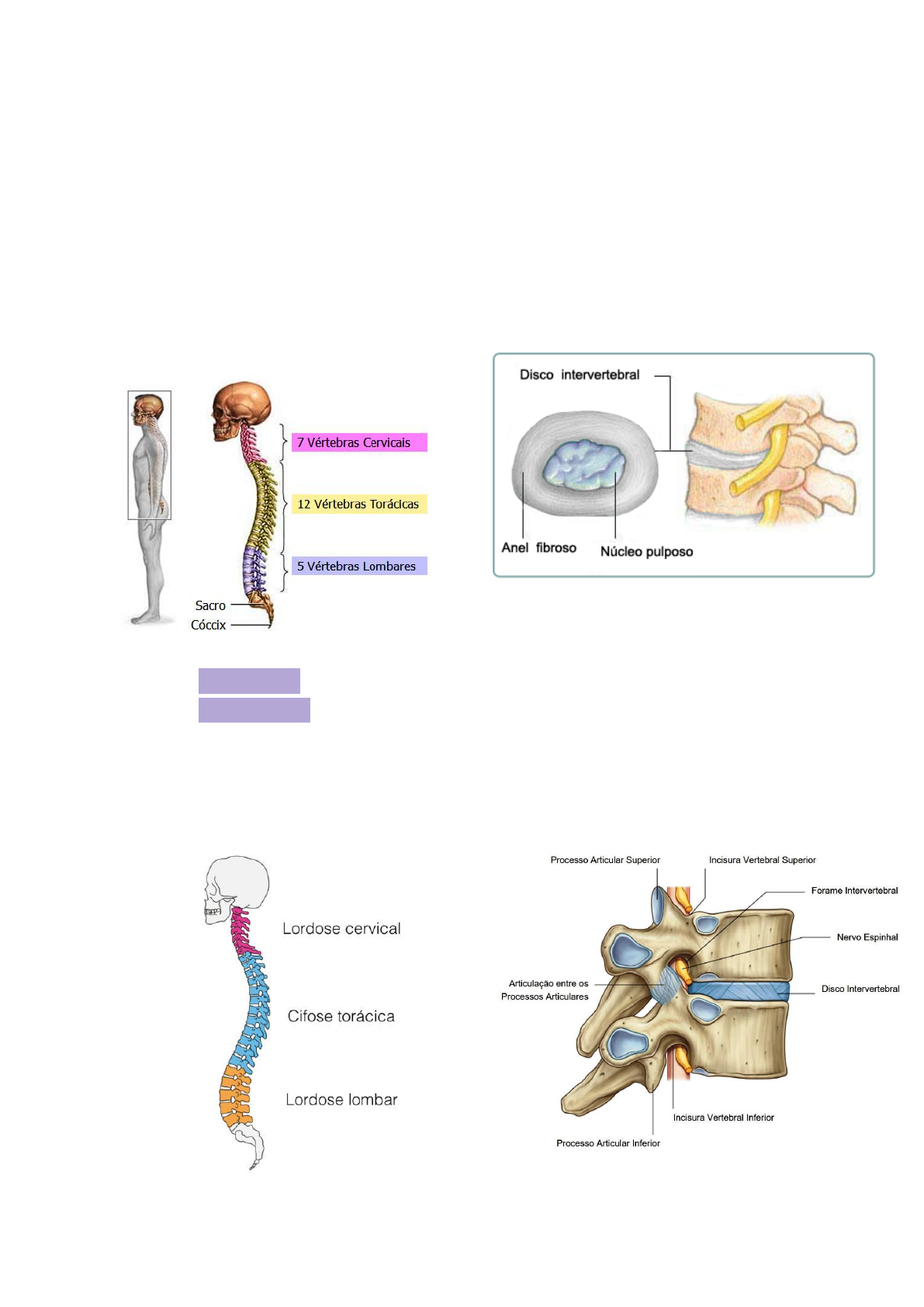 colun� vertebra� 06/02 º 33 ossos (vértebras) º 5 regiões: - Cervical 7 vértebras - Torácicas 12 vértebras - Lombar 5 vértebras - Sacral 5 ossos que se juntam e formam o sacro - Coccígea 4 º Aloja e protege medula espinal e nervos. º Região com mais movimento: Cervical º Região com menos movimento: Torácica º Entre uma vértebra e outra existe um disco chamado disco articular intervertebral. º Formada por 4 curvaturas: Lordose cervical e lombar e Cifose torácica e sacro-cóccix. DISCO INTERVERTEBRAL Existem 23 discos e são formados por um anel fibrocartilaginoso e um núcleo pulposo. FUNÇÃO: - Flexibilidade e proteção da coluna - Absorção e transmissão de carga ARTICULAÇÕES - Atlanto-occipital - Atlantoaxial - Intervertebrais - Lombossacral - Sacroilíaca - Zigoapofisárias (entre os proc. articulares) - Sacrococcígea colun� vertebra� VÉRTEBRA TÍPICA - Precisa ter um corpo e um arco, o encontro deles forma um forame vertebral. - Sustentação do corpo. CERVICAIS: 1- Corpo menor 2- Processo transverso 3- Forame transverso 4- Face Articular 5- Pedículo do arco vertebral 6- Forame vertebral 7- Lâmina vertebral 8- Processo espinhoso bifurcado TORÁCICAS: 1- Corpo da vértebra 2- Pedículo do arco vertebral 3- Forame vertebral 4- Processo transverso 5- Lâmina vertebral 6- Processo espinhoso pontiagudo (inclinado para baixo) 7- Face articular superior 1- Fóvea costal superior 2- Fóvea costal inferior 3- Face articular superior 4- Fóvea costal do processo transverso 5- Face articular inferior colun� vertebra� LOMBARES: 1- Corpo maior 2- Forame vertebral 3- Pedículo do arco vertebral 4- Processo transverso alongado 5- Face articular 6- Lâmina vertebral 7- Processo espinhoso curto VÉRTEBRA ATÍPICA - Foge dos critérios da vértebra típica. - Atlas (C1), Áxis (C2) e a sétima proeminente (C7). - Para a vértebra C7 o forame transverso pode estar presente ou não. ATLAS: 1- Tubérculo anterior 2- Processo transverso 3- Forame transverso 4- Forame vertebral 5- Tubérculo posterior 6- Face articular superior 7- Face articular inferior ÁXIS: colun� vertebra� 1- Dente do Áxis 2- Face articular superior 3- Processo transverso 4- Forame vertebral 5- Lâmina vertebral 6- Processo espinhoso 7- Forame transverso 8- Corpo do áxis 9- Face articular inferior SACRO E CÓCCIX 1- Base do sacro 2- Promontório 3- Processo articular superior 4- Asa do sacro 5- Forame sacral anterior 6- Processo transverso do cóccix 7- Face auricular 8- Hiato sacral 9- Crista sacral lateral 10- Crista sacral medial 11- Crista sacral mediana 12- Forame sacral posterior 13- Canal sacral HIÓIDE Não se articula com nenhum outro osso. Fixado por ligamentos e músculos. LIGAMENTOS DA COLUNA VERTEBRAL