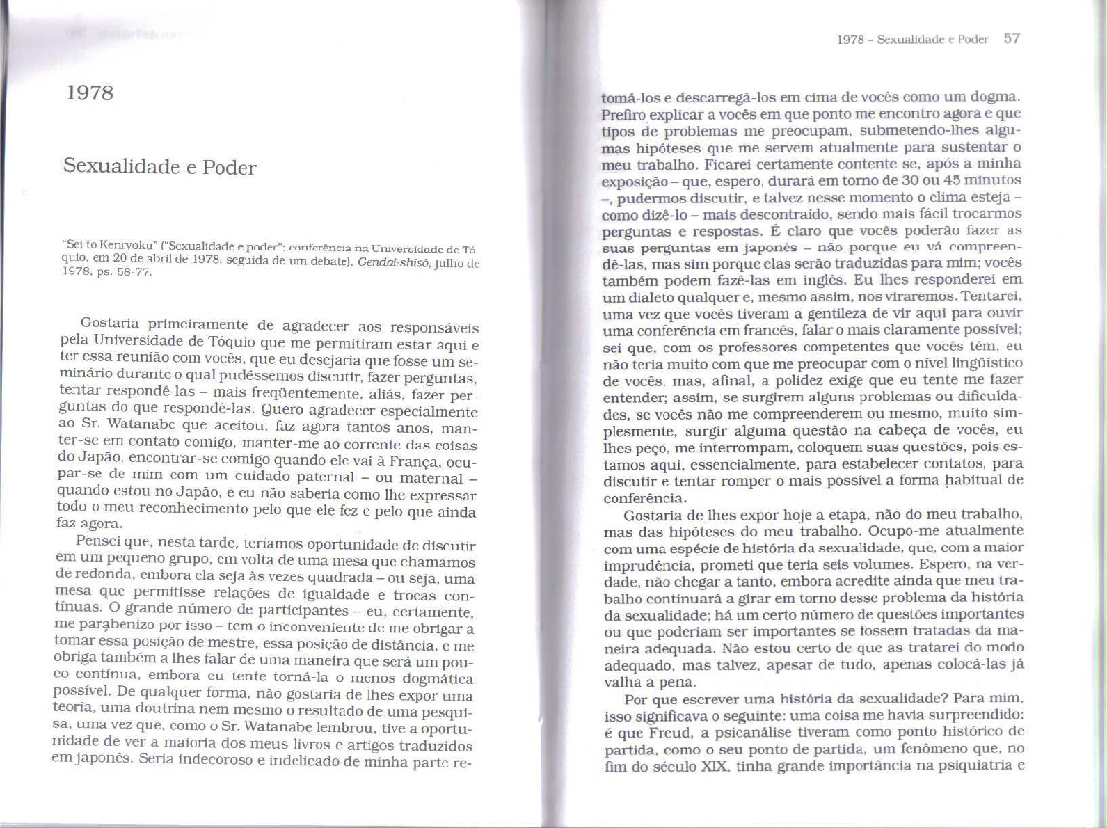 1978 Sexualidade e Poder 57 1978 tomá-los e descarregá-los em cima de vocês como um dogma. Prefiro explicar a vocês em que ponto me encontro agora e que tipos de problemas me preocupam, submetendo-lhes algu- mas hipóteses que me servem atualmente para sustentar o Sexualidade e Poder meu trabalho. Ficarei certamente contente se, após a minha exposição que, espero, durará em torno de 30 ou 45 minutos pudermos discutir, e talvez nesse momento clima esteja como dizê-lo mais descontraído, sendo mais fácil trocarmos perguntas e respostas. É claro que vocês poderão fazer as to Kenryoku" ("Sexualidade e conferência na Universidade de T6- suas perguntas em não porque eu vá compreen- quio, em 20 de abril de 1978, seguida de um debate), de dê-las, mas sim porque elas serão traduzidas para mim; vocês 1978, ps. 58-77. também podem fazê-las em Eu lhes responderei em um dialeto qualquer e, mesmo assim, nos viraremos. Tentarei, uma vez que vocês tiveram a gentileza de vir aqui para ouvir Gostaria primeiramente de agradecer aos responsáveis uma conferência em francês, falar o mais claramente possível; pela Universidade de Tóquio que me permitiram estar aqui e sei que, com os professores competentes que vocês eu ter essa reunião com vocês, que eu desejaria que fosse um se- não teria muito com que me preocupar com o minário durante qual pudéssemos discutir, fazer perguntas, de vocês, mas, afinal, a polidez exige que eu tente me fazer tentar mais fazer per- entender; assim, se surgirem alguns problemas ou dificulda- guntas do que agradecer especialmente des, se vocês não me compreenderem ou mesmo, muito sim- ao Sr. Watanabe que aceitou, faz agora tantos anos, man- plesmente, surgir alguma questão na cabeça de vocês, eu ter-se em contato comigo, manter-me ao corrente das coisas lhes me interrompam, coloquem suas questões, pois es- do Japão, encontrar-se comigo quando ele vai à França, ocu- tamos aqui, essencialmente, para estabelecer contatos, para par-se de mim com um cuidado paternal ou maternal discutir e tentar romper o mais possível a forma habitual de quando estou no Japão, e eu não saberia como lhe expressar conferência. todo o meu reconhecimento pelo que ele fez e pelo que ainda faz agora. Gostaria de lhes expor hoje a etapa, não do meu trabalho, mas das hipóteses do meu trabalho. Ocupo-me atualmente Pensei que, nesta tarde, teríamos oportunidade de discutir com uma espécie de história da sexualidade, que, com a maior em um pequeno grupo, em volta de uma mesa que chamamos imprudência, prometi que teria seis volumes. Espero, na ver- de redonda, embora ela seja às vezes quadrada ou seja, uma dade, não chegar a tanto, embora acredite ainda que meu tra- mesa que permitisse relações de igualdade e trocas con- balho continuará a girar em torno desse problema da história tínuas. o grande número de participantes eu, certamente, da sexualidade; há um certo número de questões importantes me parabenizo por isso tem o inconveniente de me obrigar a ou que poderiam ser importantes se fossem tratadas da ma- tomar essa posição de mestre, essa posição de distância, e me neira adequada. Não estou certo de que as tratarei do modo obriga também a lhes falar de uma maneira que será um pou- adequado, mas talvez, apesar de tudo, apenas colocá-las já contínua, embora eu tente torná-la menos dogmática valha a pena. possível. De qualquer forma, não gostaria de lhes expor uma Por que escrever uma história da sexualidade? Para mim, teoria, uma doutrina nem mesmo resultado de uma pesqui- isso significava o seguinte: uma coisa me havia surpreendido: sa, uma vez que, como Sr. Watanabe lembrou, tive a oportu- é que Freud, a psicanálise tiveram como ponto histórico de nidade de ver a maioria dos meus livros e artigos traduzidos partida, como o seu ponto de partida, um que, no em Seria indecoroso e indelicado de minha parte re- fim do século XIX, tinha grande importância na psiquiatria e58 Michel Foucault Ditos e Escritos 1978 Sexualidade e Poder 59 mesmo, de modo geral, na sociedade, e podemos dizer, na cul- tante, que era, por um lado, um fenômeno geral mas apenas tura ocidental. Esse fenômeno singular quase marginal situável no nível dos ou seja, o desconhecimento fascinou os médicos, fascinou de maneira geral, digamos, os pelo sujeito de seu próprio desejo e isso se manifestava espe- pesquisadores, aqueles que se interessavam de uma forma ou cialmente na histeria e ao mesmo tempo, pelo contrário, um de outra pelos problemas muito amplos da psicologia. Esse fenômeno de cultural, social, teórico da fenômeno era a histeria. Deixemos de lado, se quiserem, o sexualidade. Esses dois fenômenos de desconhecimento da problema propriamente médico da histeria; a histeria, essen- sexualidade pelo próprio sujeito e de supersaber sobre a se- cialmente caracterizada por um fenômeno de esquecimento, xualidade na sociedade não são fenômenos de desconhecimento maciço pelo sujeito de si mesmo, que po- Eles coexistem efetivamente no Ocidente, e um dos problemas dia ignorar pelo viés de sua síndrome histérica todo um frag- é certamente saber de que modo, em uma sociedade como a mento do seu passado ou toda uma parte do seu corpo. Freud nossa, é possível haver essa produção teórica, essa produção mostrou que esse desconhecimento do sujeito por ele próprio especulativa, essa produção sobre a sexualidade no era o ponto de ancoragem da psicanálise, que ele era, de fato, plano cultural geral e, ao mesmo tempo, um desconhecimento não um desconhecimento geral pelo sujeito de si mesmo, mas do sujeito a respeito de sua sexualidade. sim um desconhecimento de seu desejo, ou de sua sexualida- Vocês sabem que a psicanálise não respondeu diretamente de, para empregar uma palavra que talvez não seja muito ade- a essa questão. Não creio que se possa dizer legitimamente quada. Então, inicialmente, desconhecimento do seu desejo que ela não t