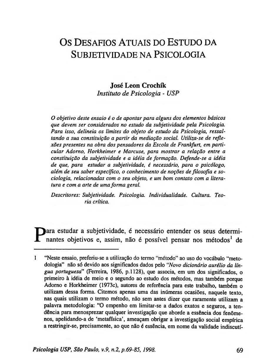 Os D e sa fio s A t u a is d o E s t u d o d a S u b je t iv id a d e n a P sic o l o g ia José León Crochík Instituto de Psicologia - USP O objetivo deste ensaio é o de apontar para alguns dos elementos básicos que devem ser considerados no estudo da subjetividade pela Psicologia. Para isso, delineia os limites do objeto de estudo da Psicologia, ressal tando a sua constituição a partir da mediação social. Utiliza-se de refle xões presentes na obra dos pensadores da Escola de Frankfurt, em parti cular Adorno, Horkheimer e Marcuse, para mostrar a relação entre a constituição da subjetividade e a idéia de formação. Defende-se a idéia de que, para estudar a subjetividade, é necessário, para o psicólogo, além de seu saber específico, o conhecimento de noções de filosofia e so ciologia, relacionadas com o seu objeto, e um bom contato com a litera tura e com a arte de uma form a geral. Descritores: Subjetividade. Psicologia. Individualidade. Cultura. Teo ria crítica. Para estudar a subjetividade, é necessário entender os seus determi nantes objetivos e, assim, não é possível pensar nos métodos1 de 1 “Neste ensaio, preferiu-se a utilização do termo “método” ao uso do vocábulo “meto dologia” não só devido aos significados dados pelo “Novo dicionário aurélio da lín gua portuguesa” (Ferreira, 1986, p. 1128), que associa, em um dos significados, o primeiro à idéia de meio e o segundo ao estudo dos métodos, mas também porque Adorno e Horkheimer (1973c), autores de referência para este trabalho, também o utilizam dessa forma. Citemos apenas uma das inúmeras ocasiões, naquele texto, nas quais utilizam o termo método, não sem antes dizer que raramente utilizam a palavra metodologia: “O empenho em limitar-se a dados exatos e seguros, a ten dência para menosprezar qualquer investigação que aborde a essência dos fenôme nos, apelidando-a de ‘metafísica’, ameaçam obrigar a investigação social empírica a restringir-se, precisamente, ao que não é essência, em nome da validade indiscutí- P sicologia USP, São Paulo, v.9, n.2, p .69-85, 1998. 69 ra, a formação deve se destinar à diferenciação do indivíduo em relação ao seu meio, com o qual se vê confundido por ocasião de seu nascimento. A subjetividade assim define-se por um terreno interno que se opõe ao mundo externo, mas que só pode surgir deste. Sem a formação do indiví duo, este se confunde com o seu meio social e natural. Tal subjetividade se desenvolve pela interiorização da cultura, que permite expressar os an seios individuais e criticar a própria cultura que permitiu a sua formação. A subjetividade implica a adaptação para poder ir além dela, o que significa que pela própria mediação da cultura o indivíduo pode pensá-la. Assim, as leis psicológicas, se é que se pode empregar este termo5, são intrinsecamente relacionadas às leis da sociedade e da cultura. Isso não implica que se reduzam umas às outras, pois uma vez que o indivíduo se diferencia, passa a se distinguir da cultura, embora esta continue a exigir dele a adaptação. Neste sentido, só uma cultura que tenha como fins a fe licidade e a liberdade individuais é que pode suscitar a crítica a si pró pria, ou seja, a contínua auto-reflexão. Por outro lado, quando a cultura se presta a ser um fim em si mesma, separada dos indivíduos, passa a ser tão ameaçadora quanto a natureza que pretendeu enfrentar, devido ao seu caráter de exterioridade, que impede que aqueles nela se reconheçam. 5 Adorno et al. (1965) em Personalidad Autoritaria discute o uso da tipologia nos estudos de psicologia e argumenta que se, de um lado, não há por quê não se em pregar categorias para classificar as pessoas segundo as suas características psíqui cas - o que seria uma atitude romântica, uma vez que a noção de indivíduo tal como se definia no século passado não está podendo existir, de outro lado, essa mesma classificação mostra como os indivíduos vêm se tornando historicamente. Assim, não cabe culpar o instrumento pelo resultado obtido, mas a própria realidade. Con tudo, em outro texto, em conjunto com Horkheimer (Adorno & Horkheimer, 1973b), afirma que os instrumentos científicos que reduzem as respostas humanas a números fazem parte da mesma frieza que gera o horror que, por vezes, auxiliam a combater. Dessa forma, quando se fala do controle e da previsão do comportamento humano, ou seja, de leis psíquicas, tem-se que considerar a contradição acima apontada, de que se existem leis psicológicas, estas se referem à própria repetição da natureza, da qual o indivíduo deve se diferenciar, e não à autonomia individual, que impede que, por princípio, se saiba as reações dos indivíduos, obstando quem quer que seja de falar em seu nome. Uma cultura que não preza diretamente a individualidade gera uma duplicidade na formação da personalidade, uma certa esquizofrenia. De um lado, exige do indivíduo que se forme para reproduzi-la, ou seja, que desenvolva os comportamentos economicamente racionais, que são res ponsáveis pela sua sobrevivência cotidiana, de outro lado, permite aquilo que considera contingente, finito, desnecessário, que se constitui nas ca racterísticas pessoais; estas últimas, como marcas de caráter, apontam para o sofrimento individual, constituído pelas ameaças constantes da adaptação. É através dos primeiros - os comportamentos economicamente racionais - que as últimas - as características pessoais - se constituem, isto é, se para a adaptação individual é necessário o desenvolvimento de com portamentos que sigam a lógica da cultura, esses trazem correlata a resis tência à sua constituição, que se apresenta como traços de caráter. Se no desenvolvimento individual se apresenta essa duplicidade, o mesmo ocorre no projeto histórico da subjetividade, no qual há também a presença da negação da adaptação, que permit