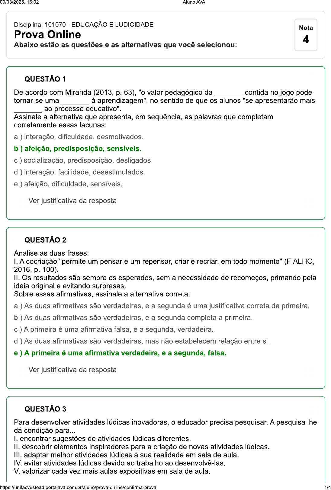 09/03/2025 16:02 Aluno AVA Disciplina: 101070 EDUCAÇÃO E LUDICIDADE Nota Prova Online 4 Abaixo estão as questões e as alternativas que você selecionou: QUESTÃO 1 De acordo com Miranda (2013, p. 63), "o valor pedagógico da contida no jogo pode tornar-se uma à aprendizagem", no sentido de que os alunos "se apresentarão mais ao processo educativo". Assinale a alternativa que apresenta, em sequência, as palavras que completam corretamente essas lacunas: a) interação, dificuldade, desmotivados. b afeição, predisposição, sensíveis. socialização, predisposição, desligados. interação, facilidade, desestimulados. e) afeição, dificuldade, Ver justificativa da resposta QUESTÃO 2 Analise as duas frases: I. A cocriação "permite um pensar e um repensar, criar e recriar, em todo momento" (FIALHO, 2016, p. 100). II. Os resultados são sempre os esperados, sem a necessidade de recomeços, primando pela ideia original e evitando surpresas. Sobre essas afirmativas, assinale a alternativa correta: a ) As duas afirmativas são verdadeiras, e a segunda é uma justificativa correta da primeira. b) As duas afirmativas são verdadeiras, e a segunda completa a primeira. A primeira é uma afirmativa falsa, e a segunda, verdadeira. As duas afirmativas são verdadeiras, mas não estabelecem relação entre si. e) A primeira é uma afirmativa verdadeira, e a segunda, falsa. Ver justificativa da resposta QUESTÃO 3 Para desenvolver atividades lúdicas inovadoras, o educador precisa pesquisar. A pesquisa lhe dá condição para... I. encontrar sugestões de atividades lúdicas diferentes. II. descobrir elementos inspiradores para a criação de novas atividades lúdicas. III. adaptar melhor atividades lúdicas à sua realidade em sala de aula. IV. evitar atividades lúdicas devido ao trabalho ao desenvolvê-las. V. valorizar cada vez mais aulas expositivas em sala de aula. 1/409/03/2025, 16:02 Aluno AVA Assinale a alternativa que apresenta as sentenças corretas: V. Ver justificativa da resposta QUESTÃO 4 Em relação à cultura lúdica, analise as sentenças: I. A cultura lúdica não diz respeito a uma restrita faixa etária, mas também está relacionada com o público adulto que, de certa forma, influencia o mundo da criança e do adolescente quando impõe regras aos comportamentos. II. A cultura lúdica pode ser comparada a um conjunto vivo diversificado conforme os indivíduos e os grupos, em função dos hábitos lúdicos, das condições climáticas ou espaciais. III. A cultura lúdica está relacionada com as estruturas de jogos e diz respeito aos conhecimentos adquiridos durante o tempo em que a criança está na escola. IV. A cultura lúdica são todas as heranças ligadas aos diversos modelos de atividades lúdicas que trazemos ao mundo contemporâneo: música, dança, teatro... V. A cultura lúdica é a herança cultural proveniente da leitura, atividade que promove a interação, o movimento corporal e que possibilita a expressão livre da criança. Assinale a alternativa que indica as sentenças corretas: b) III e V. V. Ver justificativa da resposta QUESTÃO 5 Analise as afirmações sobre as características de jogos que desempenham um papel fundamental na gamificação e identifique quais são verdadeiras (V) ou falsas (F). ( ) Tabuleiro. ( ) Desafios e tarefas. ( ) Pontos acumulados. ( ) Quebra-cabeça. ( ) Recompensas por completar ações. Assinale a alternativa que indica corretamente quais afirmativas são verdadeiras ou falsas: a) V, F, F, V, V. b) V, V, F. c) F, F, V, V, V. V, F, V, V, F. 2/409/03/2025, 16:02 Aluno AVA F, V, V, F, V. Ver justificativa da resposta QUESTÃO 6 Analise as sentenças: I. Uma das competências que precisa ser construída e desenvolvida pelos educadores é a de desenvolver uma relação favorável e harmoniosa com o aluno. II. Não se trata de ser o educador bonzinho, sério e rigoroso, mas aquele que mostra a realidade, que é autoritário e exigente. Assinale a alternativa correta: a ) As duas são verdadeiras, mas não estabelecem relação entre As duas são verdadeiras, e a segunda é uma justificativa correta da primeira. C ) A primeira é uma afirmativa falsa, e a segunda, verdadeira. d) A primeira é uma afirmativa verdadeira, e a segunda, falsa. e ) As duas são verdadeiras, mas a segunda é uma justificativa errada da primeira. Ver justificativa da resposta QUESTÃO 7 O que há em comum entre as brincadeiras livres e espontâneas e o brincar pedagógico? Assinale a alternativa correta. Nenhuma das duas maneiras de brincar devem fazer parte do contexto escolar. b) As duas maneiras de brincar contribuem para desenvolvimento integral da criança. c) Não há nada em comum entre essas duas maneiras de brincar. d Ambos são inventados pela criança. e ) Tanto um como o outro são dirigidos pelo educador. Ver justificativa da resposta QUESTÃO 8 Analise as frases: I. A cocriação é uma criação em conjunto, que tem como fundamento a colaboração. II. Nela, os alunos interagem uns com os outros, trocam ideias, experiências, fazem críticas e observações. Assinale a alternativa correta: a) As duas afirmativas são verdadeiras, mas não estabelecem relação entre b ) As duas afirmativas são falsas, mas a segunda é uma justificativa da primeira. A primeira é uma afirmativa verdadeira, e a segunda, falsa. d As duas afirmativas são verdadeiras, e a segunda completa a primeira 3/409/03/2025, 16:02 Aluno AVA e) A primeira é uma afirmativa falsa, e a segunda, verdadeira. Ver justificativa da resposta 4/4