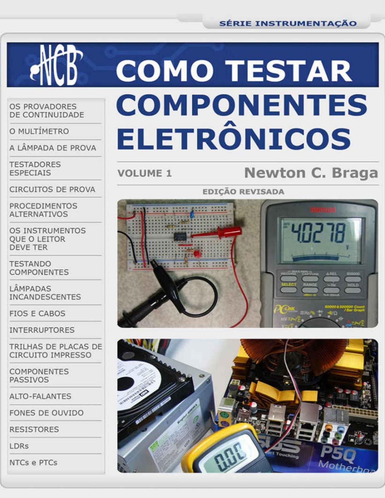 Newton C. Braga COMO TESTAR COMPONENTES ELETRÔNICOS VOLUME 1 EDIÇÃO REVISADA São Paulo - 2016 Institute NCB www.newtoncbraga.com leitor@newtoncbraga.com.br Autor: Newton C. Braga São Paulo - Brasil - 2016 Palavras-chave: Eletrônica - Reparo - Service - Componentes - Elétrica Diretor responsável: Newton C. Braga Diagramação e Coordenação: Renato Paiotti MAIS INFORMAÇÕES INSTITUTO NEWTON C. BRAGA http://www.newtoncbraga.com.br NOTA IMPORTANTE Esta série de livros fornece conhecimentos básicos de eletrônica para cursos regulares, cursos a distância e para autodidatas consistindo, portanto numa literatura cuja finalidade é apoio, iniciação ou complementação de conhecimentos. Sua aquisição não implica no direito a obtenção de certificados ou diplomas os quais devem ser emitidos pelas instituições que adotam o livro ou ainda ministram cursos de outras formas. Da mesma forma o autor ou a editora não se responsabilizam por eventuais problemas que possam ser causados pelo uso indevido das informações nele contidas como o não funcionamento de projetos, ferimentos ou danos causados a terceiros de forma acidental ou proposital, ou ainda prejuízos de ordem moral ou financeira. Os eventuais experimentos citados quando realizados por menores devem ter sempre a supervisão de um adulto. Todo cuidado foi tomado para que o material utilizado seja encontrado com facilidade na época da edição do livro, mas as mudanças tecnológicas são muito rápidas o que nos leva a não nos responsabilizarmos pela eventual dificuldade em se obter componentes para os experimentos quando indicados em outros livros desta série. http://www.newtoncbraga.com.br Índice INTRODUÇÃO À SÉRIE 1. OS INSTRUMENTOS 1.1 - CONTINUIDADE 1.2 - OS PROVADORES DE CONTINUIDADE 1.3 - O MULTÍMETRO 1.4 - A LÂMPADA DE PROVA OU LÂMPADA DE SÉRIE 1.5 - TESTADORES ESPECIAIS 1.6 - CIRCUITOS DE PROVA 1.7 - PROCEDIMENTOS ALTERNATIVOS 1.8 - OS INSTRUMENTOS QUE O LEITOR DEVE TER 2. TESTANDO COMPONENTES 2.1 – FUSÍVEIS 2.2 – LÂMPADAS INCANDESCENTES 2.3 - FIOS E CABOS 2.4- INTERRUPTORES 2.5 - REED-SWITCHES (Interruptores de lâminas) 2.6 - TRILHAS DE PLACAS DE CIRCUITO IMPRESSO 3. COMPONENTES PASSIVOS (I) 3.1 - INTRODUÇÃO 3.2 - ALTO-FALANTES 3.3 - FONES DE OUVIDO 3.4 - RESISTORES 3.5 - TRIMPOTS E POTENCIÔMETROS 3.6 - LDRs (Foto-Resistores) 3.7 - NTCs e PTCs LIVROS TÉCNICOS INTRODUÇÃO À SÉRIE Um dos grandes problemas que técnicos, engenheiros, amadores e profissionais em geral da eletrônica, mecatrônica, computadores e mesmo eletrotécnicos enfrentam e a prova de componentes. Como saber se determinado componente está bom ou ruim? Existem casos em que a simples observação visual é suficiente para saber se um componente está bom ou ruim: uma lâmpada queimada, por exemplo, pode ser facilmente identificada pela observação da interrupção de seu filamento. No entanto isso não é válido sempre pois a grande maioria dos componentes eletrônicos não apresenta sinais externos visíveis quando estão ruins. É o caso de transistores, diodos, circuitos integrados e muitos outros. Para os leigos pode parecer que a simples disponibilidade de um testador, como por exemplo, o multímetro resolve imediatamente qualquer problema: basta encostar as pontas de prova do instrumento no componente em prova para que a “agulhinha mágica” imediatamente diga se ele está bom ou ruim. Se isso está próximo da verdade, o que o leigo não sabe (e muitos profissionais também) é que o movimento da agulha que indica se estamos diante de um componente está bom ou ruim, não é sempre o mesmo. Para uns, o movimento pode indicar que está bom, enquanto que para outros, o mesmo movimento pode indicar que está ruim. Isso sem se falar que existem instrumentos que não possuem a agulhinha, como é o caso dos digitais e o que aparece no mostrador num teste é um misterioso número que deve ser interpretado. Será que um número alto significa que o componente está bom ou que o componente está ruim? Como interpretar isso? O primeiro passo para se provar um componente corretamente é saber o que ele faz e como ele se comporta num circuito. A partir daí, usando instrumentos e procedimentos corretos, podemos ter a prova tão desejada. Tudo isso pode parecer muito simples se não fosse a grande quantidade de componentes que encontramos nos aparelhos eletrônicos. Não bastando ao profissional conhecer a função de cada um no circuito, também é importante que ele saiba quais são os procedimentos para o teste de cada um, coisa que nem todos os cursos técnicos, escolas de engenharia ou outros preparatórios ensinam. Assim, visando levar aos praticantes da eletrônica uma poderosa ferramenta de trabalho preparamos uma série de 4 volumes bastante objetivos que vão ensinar os leitores a provar todos (quase (*)) os componentes eletrônicos em uso comum nos equipamentos comerciais, industriais, computadores e mesmo de montagem caseira como os normalmente descritos nas revistas especializadas. Em conjunto com outros cursos (**) do mesmo autor, os leitores terão mais uma importante fonte de consultas para seu sucesso profissional. Newton C. Braga (*) Dizemos quase, pois existem componentes que só podem ser testados num circuito específico para essa finalidade. Em alguns casos, ensinaremos como montar esses circuitos de teste. Para esses circuitos daremos a simulação e formas de onda obtidas no MultiSIM BLUE. (**) São do mesmo autor os seguintes Cursos: * Curso Prático de Eletrônica * Curso de Instrumentação – Multímetros (Volume I e II) * Curso de Reparação para Iniciantes * Curso de TV e Vídeo para Iniciantes Os quatro volumes abordam os seguintes assuntos Volume 1 – Os instrumentos (multímetro, osciloscópio, provador de continuidade, traçador de curvas, etc.) Volume 2 – Componentes passivos (resistores, capacitores, indutores, etc..) Volume 3 – Semicondutores e outros dispositivos - I (diodos,