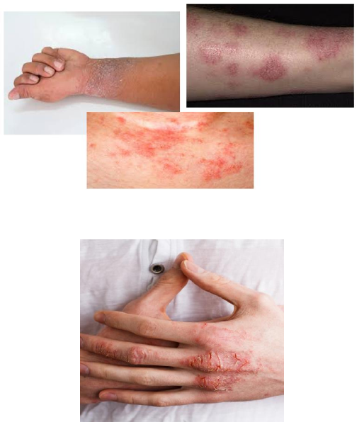 ECZEMAS Eczema e dermatite atópica são termos sinônimos. Eles designam a inflamação da pele que podem ter várias etiologias. Todos os eczemas são dermatites, mas nem toda dermatite é um eczema. Porque o eczema tem eczema tem características clínicas próprias, pápulas, pode ter pústulas, pode ter vesículas, secreção ou liquenificação que já é a forma mais crônica do eczema. E nem toda dermatite tem todo esse conjunto de coisas. Todas essas lesões elementares podem acontecer continuamente – aparece uma, depois outra, e depois mais outra. Ou então, todas associadas e simultaneamente. E formam a característica muito comum do eczema que é aquilo: ele não muda muito, é algo fácil de ver. É tudo junto: tem pápula que normalmente forma uma placa, mas com tudo junto; todas essas características juntas - eritema, edema, tem bastante escama, crostas, tudo na fase mais crônica. Na liquenificação, os sulcos ficam extremamente evidentes – parece a mão enrugada de uma pessoa mais velha. Você percebe uma pele mais brilhante e mais enrugada que é a característica da liquenificação. Essas são imagens do eczema clássico: tem pápulas, eritema, vesículas, crostas. Isso é uma dermatite eczematosa. Nem toda dermatite é um eczema, mas todo eczema é uma dermatite. Aqui você tem fissuras, rágades, uma lesão mais crônica (abaixo). Elas são sempre acompanhadas do prurido (eczemas). O eczema (ou dermatite) pode ser atópico, de contato. O prurido é pela liberação dessas substâncias nas terminações nervosas.... isso vocês estudem. A síndrome eczematosa pode ser classificada em aguda, subaguda e crônica, dependendo do tempo de evolução e do que você está vendo clinicamente. No eczema agudo tem mais edema, vesiculação, sempre vai ter eritema (aliás, em todos tem eritema, embora o que menos tenha eritema é na fase crônica que tem mais liquenificação, mas ainda assim tem eritema). No subagudo, vai predominar mais as crostas, mas também tem secreção. O eritema é menos do que na fase aguda. Na fase crônica, continua com eritema, mas é mais clarinho, menos evidente; o que é mais importante é a descamação, crosta e a liquenificação. (já teve questão pedindo pra diferenciar a fase só pela clínica) Eczema subagudo com um eritema não tão intenso. Você vê crostas e eritema, então uma lesão eritemato-crostosa. Você ve muitas pápulas, tendendo a se agrupar. Mas ainda tem eritema. Didaticamente, quando há um eczema com eritema muito intenso se chama de eritema rubro. Ou ainda chama-se de eczema secretante ou vesiculoso quando sai muita secreção. E o liquenificado que é a fase crônica dos eczemas. Na autoeczematização acontece do processo que era na mão se espalhar para outras áreas. Isso acontece na dermatite de contato alérgica e na fototóxica. Mas na dermatite de contato por irritante primário não é comum de acontecer porque não tem mecanismo imunológico. Mas se acredita que a autoeczematização pode acontecer em outras áreas que não aquela área em que houve o contato do alérgeno que fez o processo de alergia. Clinicamente são a mesma coisa (pápulas eritematosas e edematosas que evoluem placas eczematosas ou eritemato-urticadas). Acreditam que esse processo está relacionado aos antígenos que são liberados pelo processo inflamatório, então esses autoantígenos (da própria pessoa) e vão para outros locais através da corrente sanguínea e fazem lesão em outras áreas. Esse aqui é bem clássico, em que você tem uma placa com eritema, com crostas, tem até áreas já liquenificadas (sulco bem mais visível). Ou seja, é um eczema tendendo a ser mais subagudo a crônico. Esse do punho, típico de relógio, pulseira – a lesão fica localizada onde tem o contato. As outras hipóteses para autoeczematização são antígenos originados de exsudatos, participação de medicamentos (até os medicamentos tópicos utilizados, podem levar a antígenos que acabam liberando citocinas inflamatórias e fazem lesões em outras áreas), infecções. DERMATITE DE CONTATO Também é chamada de Hipersensibilidade de contato. É uma reação inflamatória, devido a componente de exposição que causa processo de irritação e inflamação na pele. Hoje, se acredita que existam fatores genéticos, de suscetibilidade individual que facilitam isso. Antigamente não se falava em genética na dermatite de contato. Clinicamente já falou como é. A dermatite de contato pode aparecer na primeira vez que houve o contato, ou aparecer depois de vários outros contatos. Se no primeiro contato já ocorrer lesão, vai ter a Dermatite de Contato por Irritante Primário (alguns livros chamam de dermatite de contato irritativa). Quanto mais tempo de uma exposição (mais de uma exposição) - Dermatite de Contato Alérgica Mas as vezes na prática nem dá para fazer essa diferença. Mesmo depois de retirar o contato, pode ter a dermatite. A dermatite de contato por irritante primário também ocorre por exposições, ou seja, mais de uma exposição, não precisa ser só em uma. A diferença é o mecanismo fisiopatológico porque na dermatite de contato alérgica há mecanismo imunológico envolvido. Na por irritante primário não tem mecanismo imunológico envolvido. Apesar de que a pessoa fazer a hipersensibilidade depois de vários outros contatos e aí pode ser um contato único ou pode ser repetidos contatos. Por exemplo, quem lava louça o tempo inteiro com sabão. Essa repetição, ao longo dos anos, pode levar uma hora a quebra do equilíbrio e a pessoa fazer um processo “alérgico” (por irritante primário ou alérgico). A dermatite de contato alérgica sempre vai ser induzida pelo contato na pele. As substâncias (o hapteno) vão levar a uma hipersensibilidade do tipo tardio, mediada por células T hapteno específicas. Vão requerer a ativação da imunidade adquirida, antígeno-específica. Na dermatite de contato por 