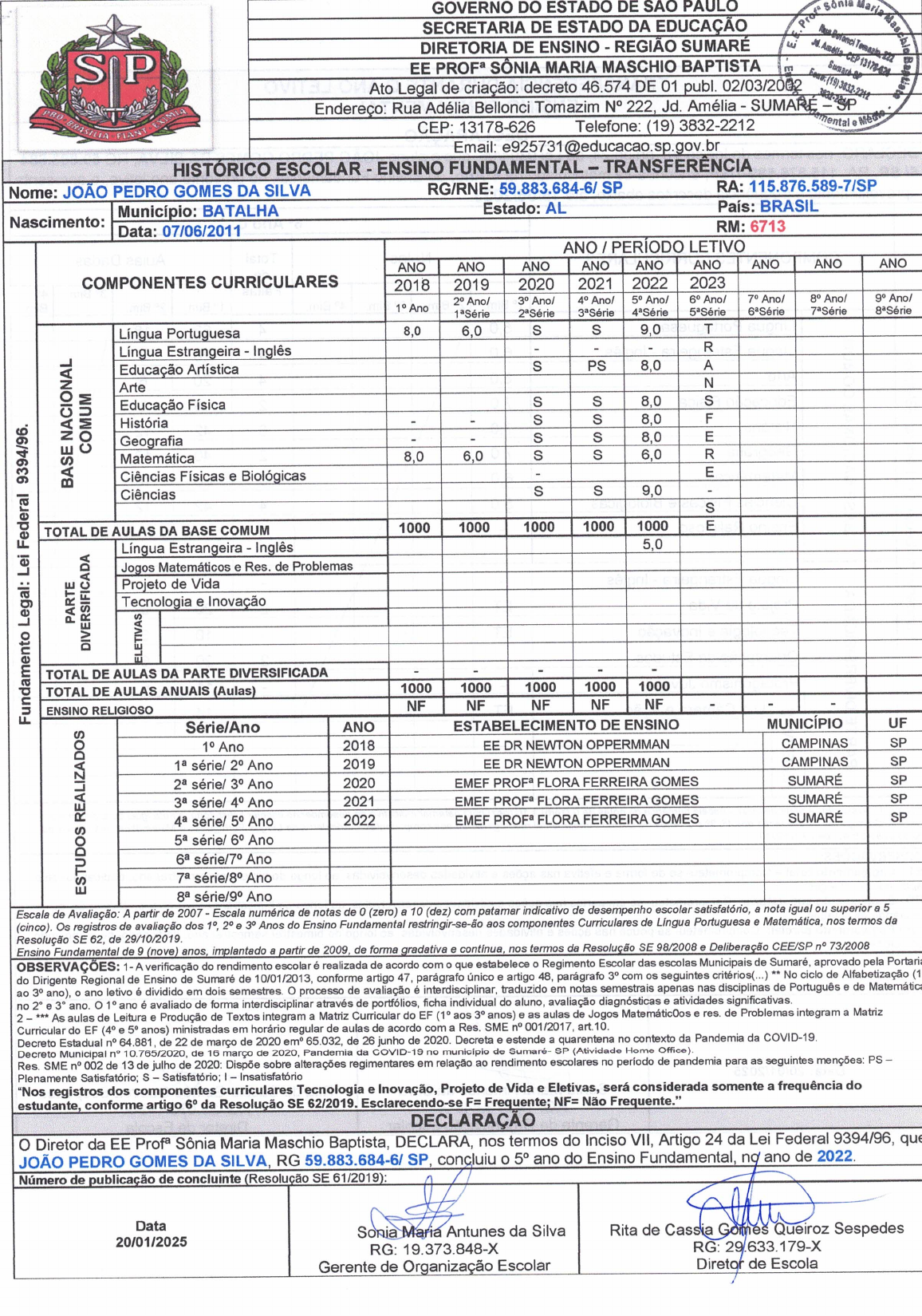 GOVERNO DO ESTADO DE SAO PAULO Maria SECRETARIA DE ESTADO DA EDUCAÇÃO DIRETORIA DE ENSINO REGIÃO SUMARÉ EE MARIA MASCHIO BAPTISTA Ato Legal de criação: decreto 46.574 DE 01 publ. 02/03/2002 Endereço: Rua Adélia Bellonci Tomazim N° 222, Jd. Amélia SUMARE CEP: 13178-626 Telefone: (19) 3832-2212 Email: e925731@educacao.sp.gov.br HISTÓRICO ESCOLAR ENSINO FUNDAMENTAL TRANSFERÊNCIA Nome: PEDRO GOMES DA SILVA RG/RNE: 59.883.684-6/ SP RA: Município: BATALHA Estado: AL País: BRASIL Nascimento: Data: 07/06/2011 RM: 6713 ANO PERÍODO LETIVO ANO ANO ANO ANO ANO ANO ANO ANO ANO COMPONENTES CURRICULARES 2018 2019 2020 2021 2022 2023 Ano/ 3° Ano/ Ano/ 5° Ano/ Ano/ Ano/ 8° Ano/ 9° Ano/ Ano Língua Portuguesa 8,0 6,0 S S 9,0 T Língua Estrangeira Inglês R Educação Artística S PS 8,0 A Arte N Educação Física S S 8,0 S História S S 8,0 F Geografia S S 8,0 E BASE Matemática 8,0 6,0 S S 6,0 R Ciências Físicas e Biológicas E Ciências S S 9,0 S TOTAL DE AULAS DA BASE COMUM 1000 1000 1000 1000 1000 E Língua Estrangeira Inglês 5,0 Jogos Matemáticos e Res. de Problemas Projeto de Vida Tecnologia e Inovação TOTAL DE AULAS DA PARTE DIVERSIFICADA TOTAL DE AULAS ANUAIS (Aulas) 1000 1000 1000 1000 1000 ENSINO RELIGIOSO NF NF NF NF NF Série/Ano ANO ESTABELECIMENTO DE ENSINO MUNICÍPIO UF Ano 2018 EE DR NEWTON OPPERMMAN CAMPINAS SP série/ Ano 2019 EE DR NEWTON OPPERMMAN CAMPINAS SP série/ 3° Ano 2020 EMEF FLORA FERREIRA GOMES SUMARÉ SP série/ Ano 2021 EMEF FLORA FERREIRA GOMES SUMARÉ SP série/ 5° Ano 2022 EMEF FLORA FERREIRA GOMES SUMARÉ SP série/ 6° Ano série/7° Ano Ano Ano Escala de Avaliação: A partir de 2007 Escala numérica de notas de 0 (zero) a 10 (dez) com patamar indicativo de desempenho escolar satisfatório, a nota igual ou superior a 5 (cinco). Os registros de avaliação dos 1°, 2° e 3° Anos do Ensino Fundamental restringir-se-ão aos componentes Curriculares de Língua Portuguesa e nos termos da Resolução SE de 29/10/2019 Ensino Fundamental de 9 (nove) anos, implantado a partir de de forma gradativa e nos termos da Resolução SE 98/2008 e Deliberação CEE/SP 73/2008 A verificação do rendimento escolar é realizada de acordo com que estabelece Regimento Escolar das escolas Municipais de Sumaré, aprovado pela Portaria do Dirigente Regional de Ensino de Sumaré de conforme artigo 47, parágrafo único e artigo 48, parágrafo 3° com os seguintes critérios(...) No ciclo de Alfabetização (1 ao 3° ano), letivo é dividido em dois processo de avaliação é interdisciplinar, traduzido em notas semestrais apenas nas disciplinas de Português e de Matemática no 2° e 3° ano. ano é avaliado de forma interdisciplinar através de portfólios, ficha individual do aluno, avaliação diagnósticas e atividades significativas. 2 *** As aulas de Leitura e Produção de Textos integram a Matriz Curricular do EF aos 3° anos) e as aulas de Jogos MatemáticOos e res. de Problemas integram a Matriz Curricular do EF (4° e anos) ministradas em horário regular de aulas de acordo com a Res. SME Decreto Estadual 64.881, de 22 de março de 2020 de 26 junho de 2020. Decreta e estende a quarentena no contexto da Pandemia da Decreto Municipal n° 10.765/2020, de 16 março de 2020, Pandemia da COVID-19 no município de Sumaré- SP (Atividade Home Office) Res. SME 002 de 13 de julho de 2020: Dispõe sobre alterações regimentares em relação ao rendimento escolares no período de pandemia para as seguintes menções: PS Plenamente Satisfatório; S Satisfatório; Insatisfatório "Nos registros dos componentes curriculares Tecnologia e Inovação, Projeto de Vida e Eletivas, será considerada somente a frequência do estudante, conforme artigo 6° da Resolução SE 62/2019. Esclarecendo-se F= Frequente; NF= Não Frequente." DECLARAÇÃO o Diretor da EE Sônia Maria Maschio Baptista, DECLARA, nos termos do Inciso VII, Artigo 24 da Lei Federal 9394/96, que JOÃO PEDRO GOMES DA SILVA, RG 59.883.684-6/ SP, concluiu o 5° ano do Ensino Fundamental, no ano de 2022. Número de publicação de concluinte (Resolução SE 61/2019): Data Sonia Maria Antunes da Silva Rita de Cassia Gomes Queiroz Sespedes 20/01/2025 RG: 19.373.848-X RG: 29.633.179-X Gerente de Organização Escolar Diretor de EscolaTRANSFERÊNCIA DURANTE o ANO LETIVO ENSINO FUNDAMENTAL DECLARAÇÃO DECLARO, nos termos do Inciso VII, artigo 24, da Lei 9394/96, que o aluno PEDRO GOMES DA SILVA, RG 59.883.684- 6/ SP, RA: 115.876.589-7/SP, encontra-se matriculado na 6°Ano, do Ensino Fundamental, no presente ano letivo, e apresenta aproveitamento e frequência descritos abaixo, até 15/05/2023. 6° Ano C COMPONENTES CURRICULARES Notas Total Aulas Dadas de Faltas 3° Bim. 1° Bim. 2° Bim. 3° Bim. Bim. 1° Bim. 2° Bim. Bim. Língua Portuguesa 5,0 4 62 18 Língua Estrangeira Inglês 6,0 4 20 6 Arte 8,0 4 20 6 Educação Física 7,0 2 18 6 História 7,0 6 42 12 Geografia 7,0 2 40 12 Matemática 6,0 6 60 18 BASE Ciências Físicas e Biológicas 5,0 4 42 12 Ensino Religioso - Língua Estrangeira Inglês - Projeto de Vida ET 2 20 6 Tecnologia e Inovação ET - 10 3 Orientação de Estudos 2 20 6 Protagonismo Juvenil 11 6 Luz Câmera e Ação ET 14 6 Escala de Avaliação: A partir de 2007 Escala numérica de notas de 0 (zero) a 10 (dez) com patamar indicativo de desempenho escolar satisfatório, a nota igual ou superior a 5 (cinco). Os registros de avaliação dos 2° e 3° Anos do Ensino Fundamental restringir-se-ão aos componentes Curriculares de Portuguesa e nos termos da Resolução SE de OBSERVAÇÕES: ET Engajamento total - Comprometeu- se de forma e efetiva nas ações e atividades desenvolvidas, ao longo do bimestre/ semestre/ ano, dedicando- se e apoiando os colegas ES Engajamento satisfatório: Comprometeu- se em partes nas ações e atividades desenvolvidas, ao longo do bimestre/ semestre/ ano, dedicando- se e apoiando os colegas EP Engajamento parcial: Comprometeu- se pouco nas ações e atividades desenvolvi