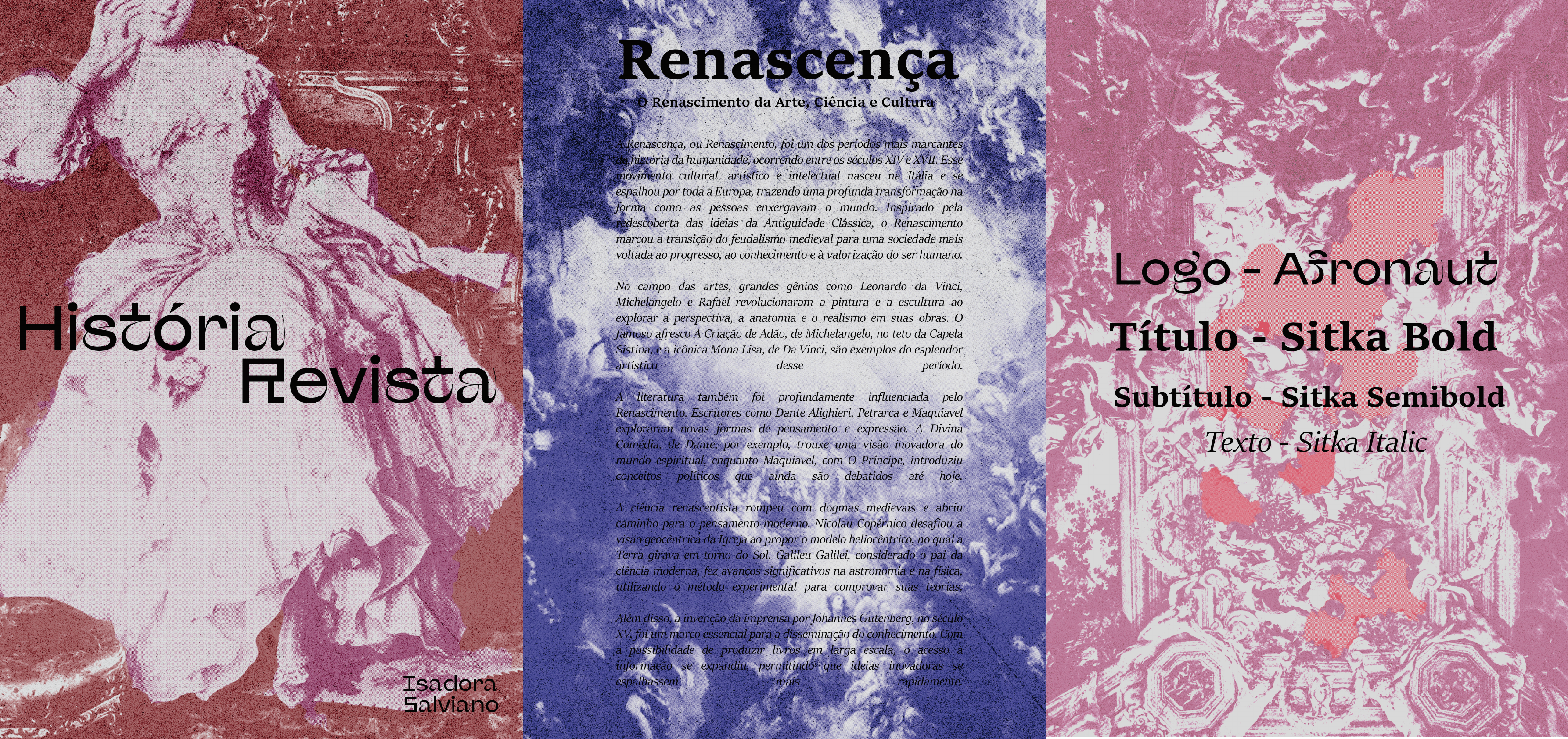 Renascenca Renascimento da Ciência e Cultura ou Renascimento, foi um dos períodos mais marcantes história da ocorrendo entre os séculos XIV Esse novimento artístico e intelectual nasceu na e se espalhou por toda a Europa, trazendo uma profunda transformação na forma como as pessoas enxergavam o Inspirado pela redescoberta das ideias da Antiguidade Clássica, o Renascimento marcou a transição do feudalismo medieval para uma sociedade mais voltada ao progresso, ao conhecimento e à valorização do ser No campo das artes, grandes gênios como Leonardo da Vinci, Logo - Michelangelo e Rafael revolucionaram a pintura e a escultura ao História explorar a perspectiva, a anatomia e o realismo em suas obras. o famoso afresco A Criação de Adão, de Michelangelo, no teto da Capela Título Sitka Bold a icônica Mona Lisa, de Da Vinci, são exemplos do esplendor artístico desse Revista período. A literatura também foi profundamente influenciada pelo Subtítulo - Sitka Semibold Escritores como Dante Alighieri, Petrarca e Maquiavel exploraram novas formas de pensamento e expressão. A Divina de Dante por exemplo, trouxe uma visão inovadora do Texto Sitka Italic mundo espiritual, enquanto Maquiavel, com introduziu conceitos políticos que ainda são debatidos até A ciência renascentista rompeu com dogmas medievais e abriu caminho para pensamento moderno. Nicolau Copernico desafiou a visão da Igreja ao propor modelo no qual a Terra em torno do Sol. Galileu Galilei, considerado o pai da ciência moderna, fez avancos significativos na astronomia e na física, utilizando método experimental para comprovar suas Além invenção da imprensa por Johannes Gutenberg, no XV foi um marco essencial para a disseminação Com a possibilidade de produzir livros em larga escala, acesso à se expandiu, permitindo que ideias inovadoras se Isadora espalhassem mais rapidamente Salviano