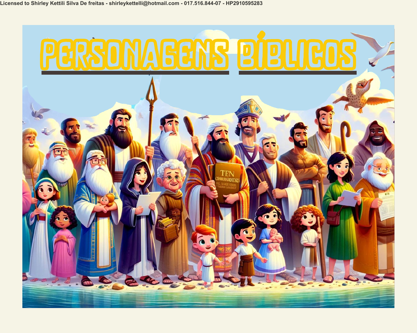 personagenspersonagens @ativ idadesmin ister io infant i l @at iv idadesmin ister io infant i l bíblicosbíblicos Licensed to Shirley Kettili Silva De freitas - shirleykettelli@hotmail.com - 017.516.844-07 - HP2910595283 ADÃO E EVA: COMO OS PRIMEIROS SERES HUMANOS CRIADOS POR DEUS, ADÃO E EVA DESEMPENHAM UM PAPEL FUNDAMENTAL NA HISTÓRIA DA HUMANIDADE. ELES SÃO COLOCADOS NO JARDIM DO ÉDEN E TÊM A TAREFA DE CUIDAR DELE E OBEDECER AOS MANDAMENTOS DE DEUS. NO ENTANTO, ELES DESOBEDECEM A DEUS E SÃO EXPULSOS DO JARDIM. DESOBEDIÊNCIA: ADÃO DESOBEDECEU A ORDEM DE DEUS AO COMER O FRUTO PROIBIDO DO CONHECIMENTO DO BEM E DO MAL, LEVANDO AO QUE É CONHECIDO COMO O "PECADO ORIGINAL". vida Adão PATRIARCA DA HUMANIDADE, O PAI DE TODOS OS SERES HUMANOS PRIMEIRO HOMEM, FORMADO DO PÓ DA TERRA.. "ADÃO" NÃO SÓ SIGNIFICA HOMEM, COMO TAMBÉM PODE SER RELACIONADO À TERRA VERMELHA, DO HEBRAICO "ADAMAH", QUE SIGNIFICA TERRA OU SOLO, REFLETINDO SUA CRIAÇÃO A PARTIR DO SOLO. filhos ALÉM DE CAIM, ABEL, E SETE, ADÃO TEVE OUTROS FILHOS E FILHAS. A BÍBLIA RELATA QUE ADÃO VIVEU 930 ANOS Licensed to Shirley Kettili Silva De freitas - shirleykettelli@hotmail.com - 017.516.844-07 - HP2910595283 ADÃO E EVA: COMO OS PRIMEIROS SERES HUMANOS CRIADOS POR DEUS, ADÃO E EVA DESEMPENHAM UM PAPEL FUNDAMENTAL NA HISTÓRIA DA HUMANIDADE. ELES SÃO COLOCADOS NO JARDIM DO ÉDEN E TÊM A TAREFA DE CUIDAR DELE E OBEDECER AOS MANDAMENTOS DE DEUS. NO ENTANTO, ELES DESOBEDECEM A DEUS E SÃO EXPULSOS DO JARDIM. REPRESENTAÇÃO DE VIDA E PECADO: EVA É FREQUENTEMENTE ASSOCIADA TANTO COM O NASCIMENTO DA HUMANIDADE QUANTO COM O INÍCIO DO PECADO HUMANO, DEVIDO AO SEU PAPEL NA HISTÓRIA DO FRUTO PROIBIDO. vida filhos EVA É A MÃE DE CAIM, ABEL, E SETE. EVA TEVE UM PAPEL VITAL NA CONTINUAÇÃO DA HUMANIDADE, DANDO À LUZ A FUTURAS GERAÇÕES PRIMEIRA MULHER: EVA É CONSIDERADA A PRIMEIRA MULHER, CRIADA POR DEUS A PARTIR DE UMA DAS COSTELAS DE ADÃO PARA SER SUA COMPANHEIRA. eva TENTAÇÃO: FOI A PRIMEIRA A SER TENTADA PELA SERPENTE (FREQUENTEMENTE ASSOCIADA A SATANÁS) A COMER O FRUTO PROIBIDO, E POSTERIORMENTE PERSUADIU ADÃO A FAZER O MESMO. MÃE DE TODOS OS VIVOS: É CHAMADA DE "MÃE DE TODOS OS VIVENTES" NA BÍBLIA, A BÍBLIA NÃO ESPECIFICA COMO OU QUANDO EVA MORREU, Licensed to Shirley Kettili Silva De freitas - shirleykettelli@hotmail.com - 017.516.844-07 - HP2910595283 CAIM E ABEL SÃO FIGURAS IMPORTANTES NO LIVRO DE GÊNESIS, CONHECIDOS PRINCIPALMENTE PELA TRÁGICA HISTÓRIA DO PRIMEIRO HOMICÍDIO. CAIM ERA AGRICULTOR, CULTIVANDO A TERRA PARA VIVER. caim oferta TROUXE AO SENHOR UMA OFERTA DOS FRUTOS DA TERRA, QUE, POR RAZÕES NÃO EXPLICITAMENTE DETALHADAS NA BÍBLIA, NÃO FOI ACEITA FAVORAVELMENTE POR DEUS. ciúme MOVIDO PELO CIÚME E RAIVA DEVIDO À ACEITAÇÃO FAVORÁVEL DA OFERTA DE ABEL POR DEUS, CAIM MATOU SEU IRMÃO ABEL. ESTE ATO É O PRIMEIRO HOMICÍDIO REGISTRADO NA BÍBLI punição COMO PUNIÇÃO, DEUS AMALDIÇOOU CAIM A VAGAR PELA TERRA. DEUS TAMBÉM COLOCOU UMA MARCA EM CAIM PARA PROTEGÊ-LO DE SER MORTO POR OUTROS, APESAR DE SEU EXÍLIO. filhos CAIM TEVE DESCENDENTES, INCLUINDO ENOQUE, PARA QUEM ELE CONSTRUIU UMA CIDADE, NOMEANDO-A EM HOMENAGEM A SEU FILHO caim Licensed to Shirley Kettili Silva De freitas - shirleykettelli@hotmail.com - 017.516.844-07 - HP2910595283 CAIM E ABEL SÃO FIGURAS IMPORTANTES NO LIVRO DE GÊNESIS, CONHECIDOS PRINCIPALMENTE PELA TRÁGICA HISTÓRIA DO PRIMEIRO HOMICÍDIO. ABEL ERA PASTOR, CUIDANDO DE REBANHOS abel oferta TROUXE DAS PRIMÍCIAS DO SEU REBANHO E DA GORDURA DESTE, O QUE FOI FAVORAVELMENTE ACEITO POR DEUS. A ACEITAÇÃO DE DEUS PELA OFERTA DE ABEL EM DETRIMENTO DA DE CAIM É FREQUENTEMENTE DISCUTIDA EM TERMOS DE PUREZA DE CORAÇÃO E VERDADEIRA DEVOÇÃO. vida ABEL FOI MORTO POR SEU IRMÃO CAIM, TORNANDO-SE A PRIMEIRA VÍTIMA DE HOMICÍDIO NA HISTÓRIA BÍBLICA. legado ABEL É FREQUENTEMENTE LEMBRADO POR SUA JUSTIÇA E FÉ. NO NOVO TESTAMENTO, ELE É CITADO COMO UM EXEMPLO DE FÉ E DE ALGUÉM CUJO SANGUE AINDA FALA, MESMO DEPOIS DE MORTO abel Licensed to Shirley Kettili Silva De freitas - shirleykettelli@hotmail.com - 017.516.844-07 - HP2910595283 NOÉ: DEUS ESCOLHE NOÉ PARA CONSTRUIR UMA ARCA E SALVAR A VIDA DE SUA FAMÍLIA E UM PAR DE CADA ESPÉCIE DE ANIMAL DURANTE O DILÚVIO, COMO UM JULGAMENTO DE DEUS SOBRE A MALDADE HUMANA. NOÉ É UM HOMEM JUSTO E FIEL, QUE SEGUE FIELMENTE AS INSTRUÇÕES DE DEUS. a arca HOMEM JUSTO: NOÉ É DESCRITO NO LIVRO DE GÊNESIS COMO UM HOMEM JUSTO E ÍNTEGRO ENTRE O POVO DE SUA ÉPOCA. ELE CAMINHAVA COM DEUS, DIFERENCIANDO-SE PELA SUA RETIDÃO E FÉ noé CONSTRUÇÃO DA ARCA: NOÉ CONSTRUIU A ARCA CONFORME AS ESPECIFICAÇÕES DADAS POR DEUS, UM ATO QUE DEMONSTROU SUA FÉ E OBEDIÊNCIA, MESMO DIANTE DA INCREDULIDADE DOS DEMAIS. O DILÚVIO: APÓS A CONSTRUÇÃO DA ARCA, NOÉ, SUA FAMÍLIA E OS ANIMAIS ENTRARAM NELA. ENTÃO, VEIO O DILÚVIO, QUE DUROU QUARENTA DIAS E QUARENTA NOITES, EXTERMINANDO TODA A VIDA NA TERRA, EXCETO AQUELES NA ARCA. após dilúvio APÓS AS ÁGUAS DO DILÚVIO BAIXAREM, NOÉ CONSTRUIU UM ALTAR E OFERECEU SACRIFÍCIOS A DEUS. EM RESPOSTA, DEUS ESTABELECEU UMA ALIANÇA COM NOÉ E SEUS DESCENDENTES, PROMETENDO NUNCA MAIS DESTRUIR A TERRA COM UM DILÚVIO E DANDO O ARCO-ÍRIS COMO SINAL DESSA PROMESSA. noé Licensed to Shirley Kettili Silva De freitas - shirleykettelli@hotmail.com - 017.516.844-07 - HP2910595283 NOÉ: DEUS ESCOLHE NOÉ PARA CONSTRUIR UMA ARCA E SALVAR A VIDA DE SUA FAMÍLIA E UM PAR DE CADA ESPÉCIE DE ANIMAL DURANTE O DILÚVIO, COMO UM JULGAMENTO DE DEUS SOBRE A MALDADE HUMANA. NOÉ É UM HOMEM JUSTO E FIEL, QUE SEGUE FIELMENTE AS INSTRUÇÕES DE DEUS. vida longa NOÉ TINHA TRÊS FILHOS: SEM, CAM E JAFÉ, QUE SÃO CONSIDERADOS OS ANCESTRAIS DAS NAÇÕES PÓS-DILUVIANAS. família NOÉ VIVEU 950 ANOS, SEGUNDO O RELATO BÍBLICO, O QUE REFLETE A LONGEVIDADE vida NOÉ SIMBOLIZA A FÉ, A OBEDIÊNCIA E A CAPACIDADE DE RENOVAÇÃO E SOBREVIVÊNCIA EM MEIO À DESTRUIÇÃO. SUA HISTÓRIA É VISTA COMO UM 