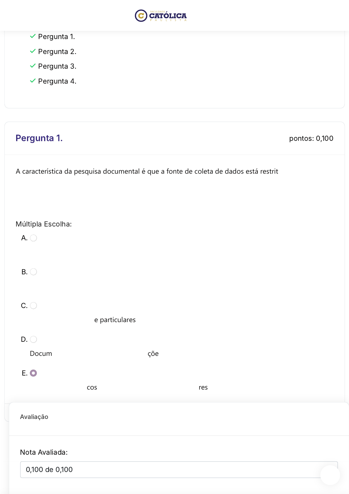 Perguntas Pergunta 1. Pergunta 2. Pergunta 3. Pergunta 4. pontos: 0,100Pergunta 1. A característica da pesquisa documental é que a fonte de coleta de dados está restrita a documentos, escritos ou não, constituindo o que se denomina de fontes primárias. Sabemos que também há as fontes secundárias, bem como os arquivos públicos que podem ser municipais, estaduais e nacionais. Em sua maior parte, contém: Múltipla Escolha: A. Documentos públicos e particulares B. Documentos públicos e municipais C. Documentos oficiais e particulares D. Documentos jurídicos, oficiais, publicações parlamentares E. Documentos jurídicos, oficiais, publicações parlamentares e iconografia Avaliação Nota Avaliada: 0,100 de 0,100 pontos: 0,100Pergunta 2. O plano de trabalho pode ser anual, semestral, trimestral, mensal, semanal e até mesmo diário, depende apenas das necessidades exigidas e da definição dos seus objetivos e de suas metas. Nesse caso, é importante que você também elabore um cronograma em que você consiga especificar as datas e as atividades a serem realizadas com a finalidade de conseguir otimizar o tempo de trabalho. Dessa forma, deve conter no plano de trabalho: Múltipla Escolha: A. Título, nome completo, curso, tema, problema, objetivos e metodologia. B. Apenas informações sobre o projeto. C. Os objetivos específicos e as metodologias, assim como as hipóteses. D. Todas as atividades que serão realizadas. E. Título, nome completo, curso, tema, problema, objetivos e conclusões. Avaliação Nota Avaliada: 0,100 de 0,100 pontos: 0,100Pergunta 3. As pesquisas científicas utilizam muitos artigos científicos em grande volume de informações e de conhecimento, pois é uma forma mais prática e rápida de se atentar a muito do que os livros estão referenciando. Os artigos científicos não são considerados grandes obras como são os livros, mas são importantes ferramentas e instrumentos de leitura para análise e coleta de informações e também para a pesquisa bibliográfica. É importante identificar os trabalhos que possuem grau de impacto de acordo com as instituições científicas; é necessário identificar aqueles trabalhos que realmente são de interesse para pesquisa. Esse processo é denominado de: Múltipla Escolha: A. Recorte científico B. Fichamento C. Metodologia D. Plano de trabalho E. Identificação dos elementos pontos: 0,100Pergunta 4. Avaliação Nota Avaliada: 0,100 de 0,100 O plano de trabalho pode acelerar os resultados da sua pesquisa e registrar as atividades, os objetivos e as tarefas necessárias que você terá de realizar durante a pesquisa científica. Portanto, o plano de trabalho é um dos documentos e uma das ações mais importantes da pesquisa científica, que você pode utilizar não apenas no início da pesquisa, mas durante e também na parte da finalização. A importância do plano de trabalho é para que você não perca de vista a necessidade de trabalhar os seus objetivos e alcançar os seus propósitos. Dessa forma, o plano de trabalho deve conter: Múltipla Escolha: A. Objetivos, tipo da pesquisa, metodologia e materiais que utilizará. B. Objetivos e metodologias C. Os elementos mais importantes da pesquisa. D. Os métodos, a hipótese e as técnicas de pesquisa. E. Os prazos e os cronogramas. Fechar Visualização Avaliação Nota Avaliada: 0,100 de 0,100