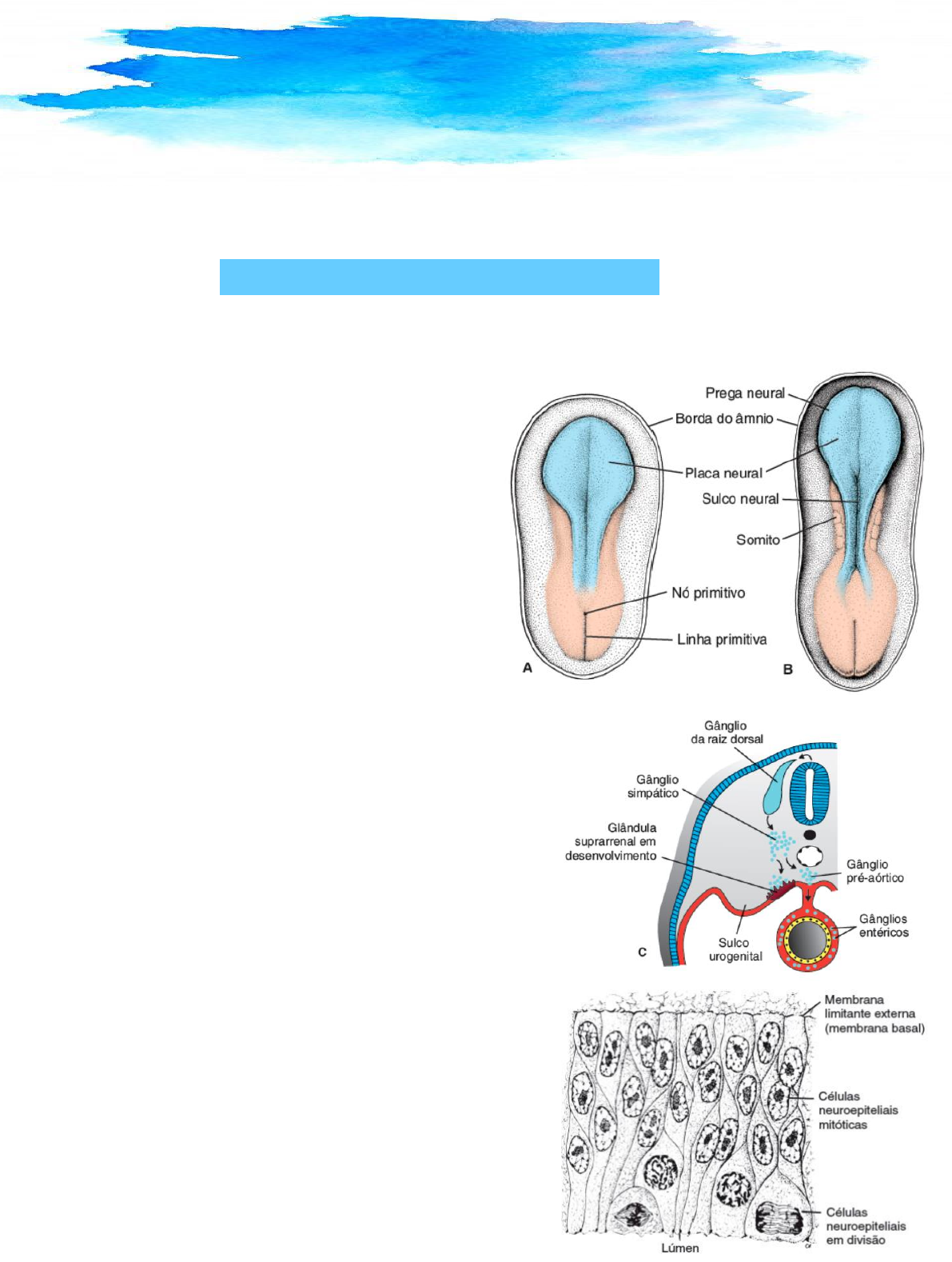 Embriologia do sistema nervoso • As primeiras indicações do desenvolvimento do sistema nervoso aparecem durante a terceira semana, já que a placa neural e o sulco neural se desenvolvem no aspecto posterior do embrião trilaminar. A notocorda e o mesênquima paraxial induzem o ectoderma subjacente a se diferenciar na placa neural. • Formação das pregas neurais, da crista neural e do tubo neural. • O tubo neural se diferencia no SNC • A crista neural dá origem às células que formam a maior parte de SNP e SNA Neurulação: formação da placa neural e do tubo neural começa durante a quarta semana (22-23 dias) na região do quarto ao sexto pares de somitos. Nesse estágio, os dois terços craniais da placa e do tubo neural até o quarto par de somitos representam o futuro encéfalo, e o terço caudal da placa e do tubo representa a futura medula espinhal. • Fusão das pregas neurais e a formação do tubo neural começa no quinto somito e prossegue nas direções cranial e caudal até que somente pequenas áreas do tubo permaneçam abertas em ambas as extremidades. • O lúmen do tubo neural se torna o canal neural, o qual se comunica livremente com a cavidade amniótica • A abertura cranial (neuroporo rostral) se fecha aproximadamente no 25° dia e o neuroporo caudal se fecha aproximadamente no 27° dia. • Fechamento dos neuroporos coincide com o estabelecimento da circulação vascular para o tubo neural. As células neuroprogenitoras da parede do tubo neural se espessam para formar o encéfalo e a medula espinhal • O canal neural forma o sistema ventricular do encéfalo e o canal central da medula espinhal. Histogênese das células do tecido nervoso: • As células em azuis derivam do ectoderma e as em vermelho do mesoderma. Histoarquitetura do tubo neural: • Primeiro grupo de neurônios migram e atingem a periferia = camada + interna Último grupo de neurônios migra e atinge a periferia = camada + externa Última onda migratória atravessa as anteriores e vão para a periferia Desenvolvimento da medula espinal: • A medula espinhal primordial se desenvolve da parte caudal da placa neural e da eminência caudal. • O tubo neural caudal ao quarto par de somitos se desenvolve na medula espinhal. • As paredes laterais do tubo neural se espessam, reduzindo gradualmente o tamanho do canal neural até somente um minúsculo canal central da medula espinhal existir na 9ª à 10ª semanas • A sinalização do ácido retinóico é essencial no desenvolvimento da medula espinhal desde a padronização inicial até a neurogênese. • Inicialmente, a parede do tubo neural é composta por um neuroepitélio espesso, colunar e pseudoestratificado. Essas células neuroepiteliais constituem a zona ventricular (camada ependimária), que dá origem a todos os neurônios e células macróglias (macróglia) da medula espinhal • As células macrogliais estão em maior número na família das células neurogliais, que incluem astrócitos e oligodendrócitos. Logo, a zona marginal composta pelas partes externas das células neuroepiteliais se torna reconhecível • Essa zona se torna gradualmente a substância branca da medula espinhal conforme os axônios se desenvolvem dos corpos das células nervosas da medula espinhal, dos gânglios espinhal e do encéfalo. • Algumas células neuroepiteliais em divisão na zona ventricular se diferenciam nos neurônios primordiais (neuroblastos). Essas células embrionárias formam uma zona intermediária (camada do manto) entre as zonas ventricular e marginal. Os neuroblastos se tornam neurônios conforme desenvolvem processos citoplasmáticos Desenvolvimento do tronco encefálico: • O encéfalo começa a se desenvolver durante a terceira semana, quando a placa e o tubo neural estão se desenvolvendo do neuroectoderma • O tubo neural, cranial ao quarto par de somitos, se desenvolve no encéfalo. As células neuroprogenitoras proliferam, migram e se diferenciam para formar áreas específicas do encéfalo. A fusão das pregas neurais na região cranial e o fechamento do neuroporo rostral formam três vesículas encefálicas primárias, das quais se desenvolve o encéfalo Prosencéfalo (encéfalo anterior). Mesencéfalo (encéfalo médio) Rombencéfalo (encéfalo posterior). • Durante a quinta semana, o prosencéfalo se divide parcialmente em duas vesículas encefálicas secundárias, o telencéfalo e o diencéfalo; o mesencéfalo não se divide. O rombencéfalo se divide parcialmente em duas vesículas, o metencéfalo e o mielencéfalo. Consequentemente, há cinco vesículas encefálicas secundárias.