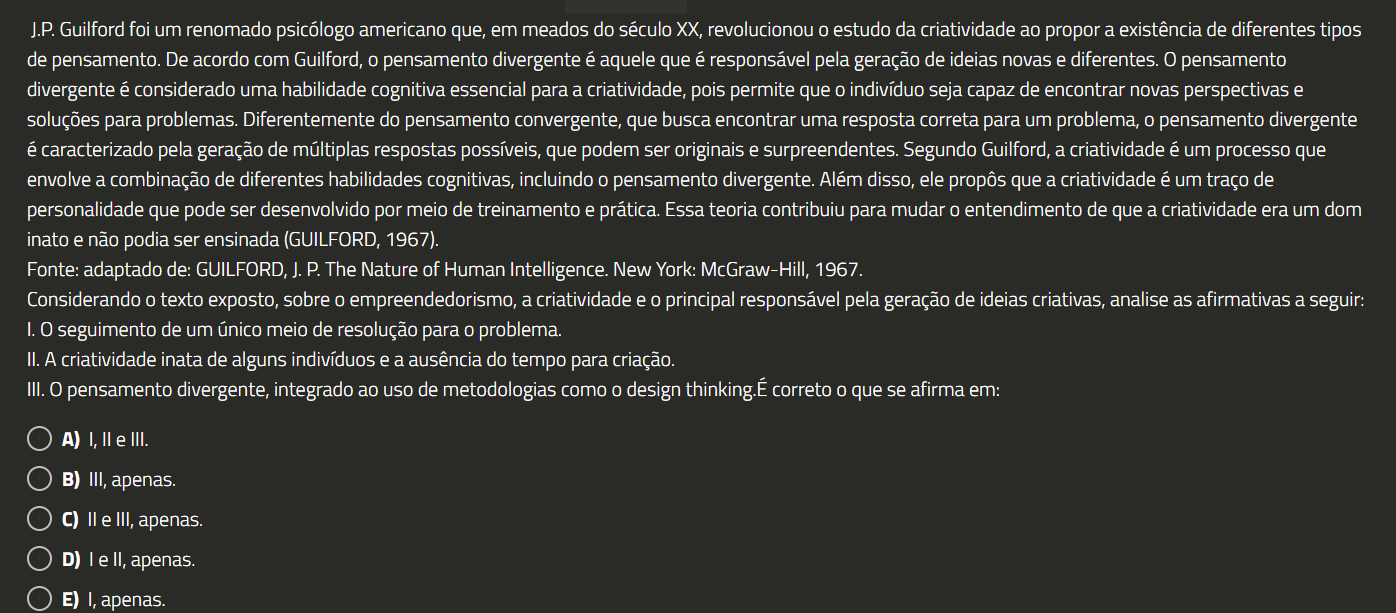 J.P. Guilford foi um renomado psicólogo americano que, em meados do século XX, revolucionou estudo da criatividade ao propor a existência de diferentes tipos de pensamento. De acordo com Guilford, pensamento divergente é aquele que é responsável pela geração de ideias novas e diferentes. pensamento divergente é considerado uma habilidade cognitiva essencial para a criatividade, pois permite que indivíduo seja capaz de encontrar novas perspectivas e soluções para problemas. Diferentemente do pensamento convergente, que busca encontrar uma resposta correta para um problema, pensamento divergente é caracterizado pela geração de múltiplas respostas possíveis, que podem ser originais e surpreendentes. Segundo Guilford, a criatividade é um processo que envolve a combinação de diferentes habilidades cognitivas, incluindo o pensamento divergente. Além disso, ele propôs que a criatividade é um traço de personalidade que pode ser desenvolvido por meio de treinamento e prática. Essa teoria contribuiu para mudar entendimento de que a criatividade era um dom inato e não podia ser ensinada (GUILFORD, 1967). Fonte: adaptado de: GUILFORD, J. P. The Nature of Human Intelligence. New York: McGraw-Hill, 1967. Considerando texto exposto, sobre empreendedorismo, a criatividade e principal responsável pela geração de ideias criativas, analise as afirmativas a seguir: I. seguimento de um único meio de resolução para problema. II. A criatividade inata de alguns indivíduos e a ausência do tempo para criação. III. pensamento divergente, integrado ao uso de metodologias como design thinking.É correto que se afirma em: A) I, II e III. B) III, apenas. C) II e III, apenas. D) e II, apenas. E) I, apenas.