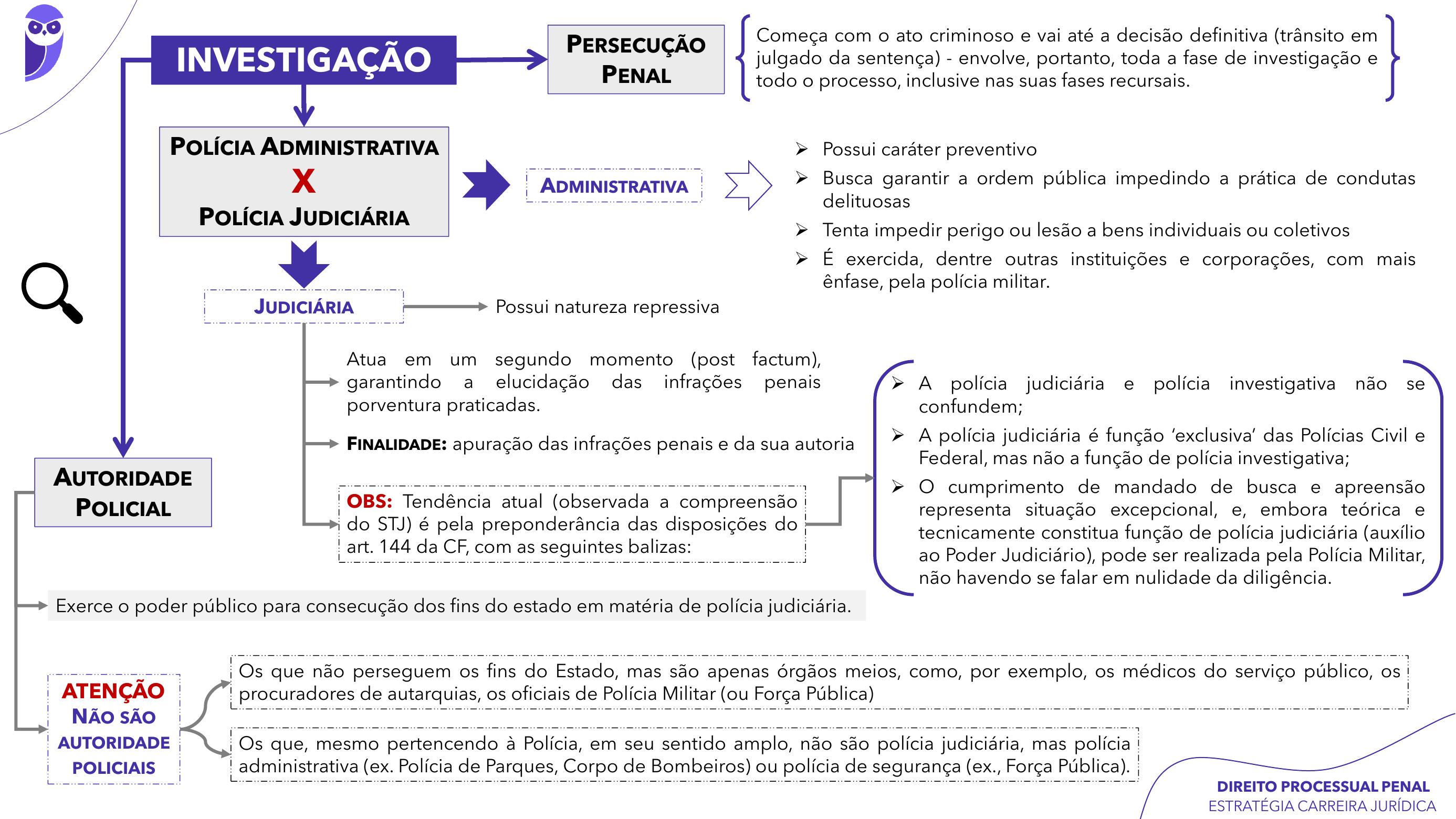 INVESTIGAÇÃO PERSECUÇÃO PENAL Começa com o ato criminoso e vai até a decisão definitiva (trânsito em julgado da sentença) - envolve, portanto, toda a fase de investigação e todo o processo, inclusive nas suas fases recursais. POLÍCIA ADMINISTRATIVA X POLÍCIA JUDICIÁRIA ADMINISTRATIVA JUDICIÁRIA ➢ Possui caráter preventivo ➢ Busca garantir a ordem pública impedindo a prática de condutas delituosas ➢ Tenta impedir perigo ou lesão a bens individuais ou coletivos ➢ É exercida, dentre outras instituições e corporações, com mais ênfase, pela polícia militar. Possui natureza repressiva Atua em um segundo momento (post factum), garantindo a elucidação das infrações penais porventura praticadas. FINALIDADE: apuração das infrações penais e da sua autoria OBS: Tendência atual (observada a compreensão do STJ) é pela preponderância das disposições do art. 144 da CF, com as seguintes balizas: ➢ A polícia judiciária e polícia investigativa não se confundem; ➢ A polícia judiciária é função ‘exclusiva’ das Polícias Civil e Federal, mas não a função de polícia investigativa; ➢ O cumprimento de mandado de busca e apreensão representa situação excepcional, e, embora teórica e tecnicamente constitua função de polícia judiciária (auxílio ao Poder Judiciário), pode ser realizada pela Polícia Militar, não havendo se falar em nulidade da diligência. AUTORIDADE POLICIAL Exerce o poder público para consecução dos fins do estado em matéria de polícia judiciária. ATENÇÃO NÃO SÃO AUTORIDADE POLICIAIS Os que não perseguem os fins do Estado, mas são apenas órgãos meios, como, por exemplo, os médicos do serviço público, os procuradores de autarquias, os oficiais de Polícia Militar (ou Força Pública) Os que, mesmo pertencendo à Polícia, em seu sentido amplo, não são polícia judiciária, mas polícia administrativa (ex. Polícia de Parques, Corpo de Bombeiros) ou polícia de segurança (ex., Força Pública). ESTRATÉGIA CARREIRA JURÍDICA DIREITO PROCESSUAL PENAL 11184002401 - Marcos Grex Castro Terceiro INVESTIGAÇÃO INQUÉRITO POLICIAL - IP PROCEDIMENTO PREPARATÓRIO DA AÇÃO PENAL, DE CARÁTER ADMINISTRATIVO, CONDUZIDO PELA POLÍCIA JUDICIÁRIA E VOLTADO À COLHEITA PRELIMINAR DE PROVAS PARA APURAR A PRÁTICA DE UMA INFRAÇÃO PENAL E SUA AUTORIA” (NUCCI, 2018) POSSUI DUPLA FUNÇÃO PRESERVADORA: inibe a instauração de um processo penal infundado, temerário, resguardando a liberdade do inocente e evitando custos desnecessários para o Estado. PREPARATÓRIA: fornece elementos de informação para que o titular da ação penal ingresse em juízo, além de acautelar meios de prova que poderiam desaparecer com o decurso do tempo. Acompanhará a denúncia ou queixa, sempre que servir de base a uma ou outra ATENÇÃO: O IP não é um “requisito” da ação penal VALOR PROBATÓRIO As provas colhidas na investigação possuem forma secundária ou complementar O juiz não pode julgar alguém tomando por base tão somente as “provas” colhidas no inquérito JUSTIFICATIVA: As provas produzidas em fase de inquérito não são submetidas, via de regra, a contraditório e ampla defesa. STJ: [...] é possível a utilização das provas colhidas durante a fase inquisitiva - reconhecimento fotográfico - para embasar a condenação, desde que corroboradas por outras provas colhidas em Juízo [...], nos termos do art. 155 do Código de Processo Penal. ATENÇÃO para os §§3º e 4º do art. 3º-C do CPP, incluídos pela Lei 13.964/19 - Pacote Anticrime, que altera tais entendimentos. ➢ Atualmente, os dispositivos estão suspensos. ➢ O aluno deve acompanhar a ADI 6.299ATRIBUIÇÃO DE INVESTIGAÇÃO PRESIDÊNCIA DO INQUÉRITO DEFINIÇÃO - REGRA: leva em conta a natureza da infração penal - qual é o crime que se investiga. Tese nº 13 do Jurisprudência em Teses do STJ, edição 72 13) As atribuições da Polícia Federal não se confundem com as regras de competência constitucionalmente estabelecidas para a Justiça Federal (arts. 108, 109 e 144, § 1º, da CF/88), sendo possível que uma investigação conduzida pela Polícia Federal seja processada perante a Justiça estadual. ESTRATÉGIA CARREIRA JURÍDICA DIREITO PROCESSUAL PENAL 11184002401 - Marcos Grex Castro Terceiro INVESTIGAÇÃO INQUÉRITO POLICIAL - IP CARACTERÍSTICAS PROCEDIMENTO ESCRITO ❑ Todas as peças do inquérito policial serão, num só processado, reduzidas a escrito ou datilografadas e, neste caso, rubricadas pela autoridade. (art. 9º, CPP) ❑ Trata-se de garantia do investigado. PROCEDIMENTO DISPENSÁVEL ❑ Nem sempre o IP será necessário, a depender das informações e elementos a que o titular da ação já tenha disponíveis. ❑ A dispensabilidade do procedimento, inclusive, é claramente demonstrada por vários dispositivos do CPP, podendo-se citar os artigos 12, 27 e 39, § 5º.PROCEDIMENTO SIGILOSO DIFERENTEMENTE DO PROCESSO PENAL, A FASE INQUISITORIAL NÃO DEVE AMPLO RESPEITO AO PRINCÍPIO DA PUBLICIDADE FRISE-SE, NÃO SIGNIFICA SIGILO ABSOLUTO ESSE SIGILO NÃO ALCANÇA: Juiz ❑ Mas há exceção. ❑ Existem situações em que o sigilo pode atingir o advogado também. ❑ Súmula Vinculante nº 14: É direito do defensor, no interesse do representado, ter acesso amplo aos elementos de prova que, já documentados em procedimento investigatório realizado por órgão com competência de polícia judiciária, digam respeito ao exercício do direito de defesa. Ministério Público Advogado, por força do Estatuto da OAB (art. 7º, XIV, da Lei 8.906/1994). PROCEDIMENTO INQUISITIVO Não admite, em regra, amplo contraditório e defesa em seu bojo EXCEÇÃO ❑ Inquérito Policial de Expulsão (de estrangeiro) instaurado pela Polícia Federal, de ofício ou por determinação do Ministro de Estado da Justiça e Segurança Pública. ❑ Assegura-se ao expulsando o contraditório e a ampla defesa durante o inquérito de expuls