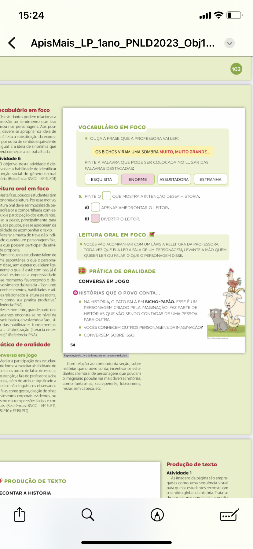 15:24 103 cabulário em foco estudantes podem relacionar a pressão sentimento que issu nos Aos pou- VOCABULÁRIO EM FOCO devem se apropriar da ideia de é feita a substituição da expres- OUCA A FRASE QUE A PROFESSORA VAI LER: por outra de sentido equivalente igual. a ideia de sinonímia que erá começar a ser trabalhada os BICHOS VIRAM UMA SOMBRA MUITO, MUITO ividade 6 objetivo desta atividade é de- PINTE A PALAVRA QUE PODE SER COLOCADA NO LUGAR DAS volver a habilidade de identificar PALAVRAS unção social do textual (Referência BNCC EF15LP01) ESQUISITA ENORME ASSUSTADORA ESTRANHA oral em foco Nesta poucos estudantes têm 6. PINTE QUE MOSTRA A INTENÇÃO DESSA onomia de leitura Por esse motivo, itura oral deve ser modalizada pe- A) APENAS AMEDRONTAR professor e compartilhada com es- ulo à participação dos a passo, principalmente para B) DIVERTIR aos poucos, eles se apropriem da bilidade de acompanhar texto. a marca do travessão indi- LEITURA ORAL EM FOCO do quando um personagem fala, que possam participar da ativi- VOCÊS VÃO ACOMPANHAR COM UM LÁPIS A RELEITURA DA PROFESSORA de proposta TODA VEZ QUE ELA LER A FALA DE UM PERSONAGEM, LEVANTE A MÃO QUEM Permitir que os estudantes falem de QUISER LER FALAR QUE PERSONAGEM DISSE. ma espontânea que persona- in sem esperar que lejam lite- que lá está com já é PRÁTICA DE ORALIDADE ssivel estimular a expressividade se momento, favorecendo de- CONVERSA EM JOGO volvimento da literacia "conjunto habilidades e ati- les relacionados à leitura à escrita, HISTÓRIAS QUE POVO CONTA... como sua prática produtiva." NA PATO FALA EM ESSE É UM ferência PNA) PERSONAGEM CRIADO PELA FAZ PARTE DE Neste momento grande parte dos udantes encontra-se no nível da HISTÓRIAS QUE VÃO SENDO CONTADAS DE UMA PESSOA racia envolvendo a "aquisi- PARA OUTRA. das habilidades fundamentais VOCÊS CONHECEM OUTROS PERSONAGENS DA IMAGINAÇÃO? a a alfabetização (literacia emer- PNA) CONVERSEM SOBRE ática de oralidade 54 nversa em jogo Reprodução Livro Estudante em tamanho reduzido Median a participação dos estudan- de forma a exercitar a habilidade de Com relação ao conteúdo da sobre beitar turnos de fala e de escutar, histórias que povo conta, incentivar os estu- dantes a lembrar de personagens que povoam n atenção, fala do professor dos imaginário popular nas mais diversas egas, além de atribuir significado a como fantasmas, sacis-pererês, ectos não observados mulas sem etc. falas como gestos, direção do olhar, vimentos corporais evidentes, ou microexpressões faciais e cor- ais (Referências: BNCC EF15LP12) Produção de texto Atividade 1 PRODUÇÃO DE TEXTO As imagens da página são empre- gadas como uma sequência visual para que os estudantes reconstruam ECONTAR A HISTÓRIA sentido global da Trata-se de