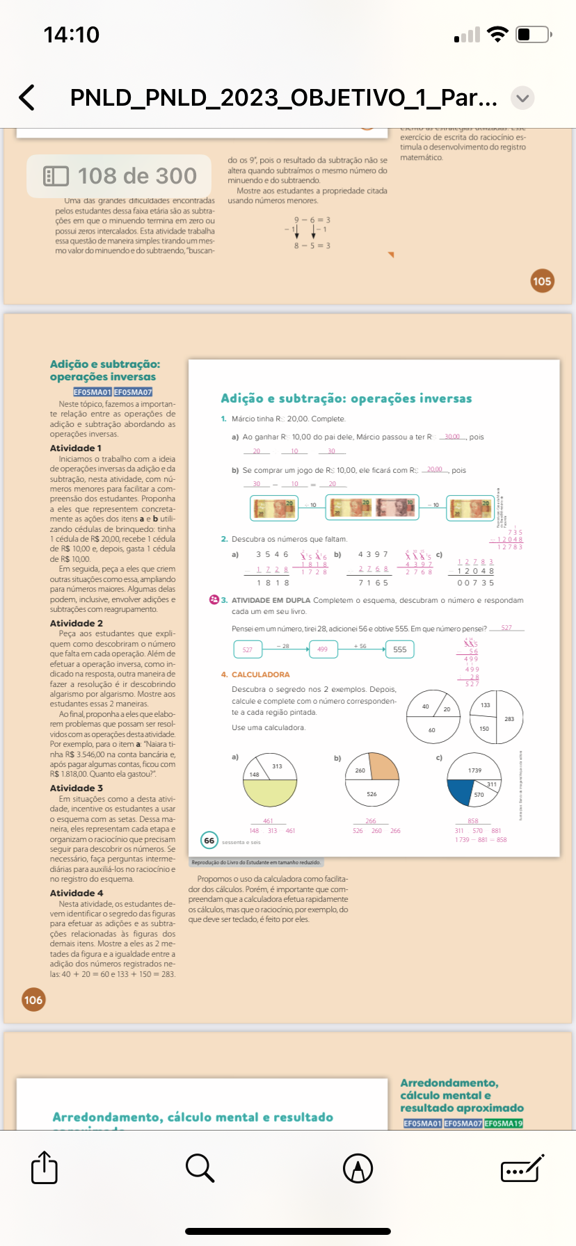 14:10 exercício de escrita do es- timula o desenvolvimento do registro do pois resultado da subtração não se matemático B 108 de 300 altera quando mesmo número do minuendo e do subtraendo Mostre aos estudantes a propriedade citada Uma das grandes encontradas usando números menores pelos estudantes dessa faixa etária são as subtra- em que minuendo termina em zero ou 3 possui zeros Esta atividade trabalha 1 essa questão de maneira simples tirando um mes- 8 3 mo valor do minuendoe do subtraendo "buscan- 105 Adição e subtração: operações inversas EF05MA01 Neste fazemos a importan- Adição e subtração: operações inversas te relação entre as operações de 1. tinha 20.00 Complete adição e subtração abordando as operações a) Ao R 10,00 do passou a ter R 30.00 pois Atividade 1 20 10 30 Iniciamos trabalho com a ideia de operações inversas da adição da b) Se comprar um jogo de 10.00 ele ficará com 20.00 pois subtração, nesta com nú- 30 10 - 20 meros menores para facilitar a com- preensão dos Proponha 10 10 a eles que representem concreta- mente as ações dos itens a b utili- zando cédulas de brinquedo tinha 735 1 cédula de R$ 20.00 recebe cédula 2. Descubra os que faltam 12048 de R$ 10.00 depois, gasta 1 cédula 12783 de R$ 10.00 a) b) c) 1818 12783 Em seguida, peça a eles que criem 1728 2768 2768 12048 outras situações como ampliando 1 7165 00735 para números Algumas delas envolver adições e 3. ATIVIDADE EM DUPLA Completem descubram numero respondam subtrações com reagrupamento. cada um em seu livro Atividade 2 Pensei em um tirei 28 56 e obtive 555 Em que pensei? 527 Peça aos estudantes que expli- quem como descobriram número 28 499 555 que falta em cada operação Além de 499 efetuar a operação inversa, como in- 499 dicado na resposta, outra maneira de 4. CALCULADORA fazer a resolução é descobrindo 527 Descubra o segredo nos 2 exemplos algarismo por Mostre aos estudantes essas 2 calcule e complete com numero corresponden- 40 133 final, proponha a eles que elabo- te cada região pintada 20 283 rem problemas que possam ser resol- Use uma calculadora 60 150 vidos com as operações destaatividade Por exemplo, para item a ti- nha R$ 3,546.00 na conta bancária e a) b) c) após pagar algumas contas ficou com 313 R$ Quanto ela gastou?" 260 1739 148 Atividade 3 311 526 570 Em situações como a desta ativi- dade, incentive estudantes a usar esquema com as setas Dessa ma- 461 266 858 neira eles representam cada etapa e 148 313 461 526 260 266 311 570 organizam que precisam 66 sessenta 881 858 seguir para descobrir números Se necessário, faça perguntas interme- Reprodução do do Estudante reduzido diárias para auxiliá-los no e no registro do esquema Propomos uso da calculadora como Atividade 4 dor dos Porém é importante que com- Nesta atividade, os estudantes preendam que calculadora efetua rapidamente vem identificar segredo das figuras cálculos mas que por exemplo do para efetuar as adições e as subtra- que deve ser teclado é feito por ções relacionadas às figuras dos demais itens Mostre a eles as 2 me- tades da figura e a igualdade entre a adição dos números registrados ne- las 40 + 20 = 60 e 133 + 150 = 106 Arredondamento, cálculo mental e resultado aproximado Arredondamento, cálculo mental e resultado EF05MA07 EF05MA19