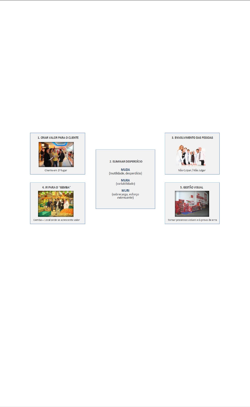 Kaizen na Direção dos Serviços Administrativos da SONAE 15 | P á g i n a CAPÍTULO II - FUNDAMENTOS DO KAIZEN 2.1 – Os cinco princípios do Kaizen De acordo com Imai (1986) os valores abaixo apresentados são verdadeiros princípios de funcionamento que garantem os bons resultados de qualquer atividade de melhoria contínua, tais como: a) Criar valor para o cliente b) Envolvimento das pessoas c) Eliminar desperdício d) Ir para o gemba e) Gestão visual Figura 2 – Os cinco princípios do Kaizen Fonte: www.sonae.pt (Sonae 2015) a) Criar valor para o Cliente Atualmente, devido ao mercado globalizado e altamente competitivo, aumenta cada vez mais a pressão para que as empresas encontrem maneiras novas de criar e entregar valor aos clientes com o objetivo de assegurar os lucros nos negócios e manter vantagem competitiva. O cliente deverá ser a prioridade de todos os colaboradores. Para que tal aconteça, não deverá existir um ambiente rígido e funcional que conduza ao isolamento das várias áreas em torno de si próprias. Criar um produto de valor acrescentado para a satisfação do cliente surge numa perspetiva de unidade e de trabalho em torno de um objetivo comum: O cliente em 1º lugar. A orientação para o mercado é focalizado no cliente, assim é necessário: - Compreender as necessidades e expectativas dos clientes; - Antecipar as vontades e tendências antes da concorrência. Kaizen na Direção dos Serviços Administrativos da SONAE 16 | P á g i n a A figura 3 indica as consequências que terão de ser impostas para se atingir os objetivos iniciais, sem por em causa a máxima qualidade do produto e/ou serviço final e assim satisfazer as necessidades e expectativas dos clientes: Figura 3 – Satisfação das expetativas dos clientes com qualidade Fonte: www.sonae.pt (Sonae 2015) De acordo com Júnior e Cardoso (2012), as empresas devem trabalhar para atender as necessidades do cliente, neste sentido necessitam ter agilidade e flexibilidade para poder responder de forma relativamente rápida as variações dos pedidos dos clientes, mudanças no volume de produção e mudanças nas datas de entrega, sem ter elevado volume de stocks. Segundo Guedes (2008) uma organização deve rejeitar qualquer ação que não aumente valor para o cliente, procurando sempre a perfeição e que elimine todo o desperdício que possa ocorrer nos processos de produção; b) Eliminar Desperdício (“Muda”) A ideia base é a de elaborar os processos de negócio de forma a diminuir ao máximo o desperdício, obtendo, desta forma, um fluxo contínuo composto apenas de processos que acrescentam valor ao objeto de negócio Imai (1987) A criação de um fluxo contínuo nos processos de negócio irá forçar a uma diminuição no stock de matéria-prima ou de informação. Essa diminuição expõe ineficiências que exigirão soluções imediatas, caso contrário, todo o fluxo irá parar por mais tempo e o prejuízo será ainda maior. Quando os processos estão ligados uns aos outros, há mais trabalho em equipa, feedback mais rápido sobre os problemas, maior controlo sobre o processo e pressão constante sobre as pessoas para resolver problemas, pensar e crescer. Kaizen na Direção dos Serviços Administrativos da SONAE 17 | P á g i n a Identificação dos Três Mus (Muri, Mura e Muda) Os três Mus permitem que haja equilíbrio entre a capacidade e a carga, que normalmente dá origem a grandes perdas para a empresa. Os três vocábulos japoneses são: Muda – Refere-se ao desperdício, a tudo o que não acrescenta valor e, como tal, deve ser reduzido ou eliminado. Posto de uma outra perspetiva, desperdício refere-se a todas as componentes do produto e/ou serviço que o cliente não estará disposto a pagar (Pinto, 2009); Mura – Refere-se às inconsistências ou às irregularidades que devem ser eliminadas através da adoção do sistema Just-In-Time (JIT) procurando fazer apenas o necessário e quando pedido. Este é aplicado através do sistema pull deixando o cliente puxar os produtos ou serviços; Muri – Manifesta-se a partir da insuficiência ou do excesso que deverá ser eliminado pela uniformização do trabalho (garantindo que todos seguem o mesmo procedimento, tornando os processos mais previsíveis, estáveis e controláveis). c) Envolvimento das pessoas O desenvolvimento das pessoas através do envolvimento é uma crença muito forte para a melhoria contínua. Para cada tipo de melhoria existe um hábito a mudar. Para cada hábito existe um grupo de pessoas que vai ter de adotar novos hábitos, abandonando os anteriores. Desde os diretores aos operadores, todos necessitam de ser envolvidos, de forma a estarem aptos a adotar novos hábitos. O caminho para uma organização se tornar e manter bem-sucedida passa, obrigatoriamente, pelas pessoas que fazem parte dessa organização. O espírito do Sistema Toyota de Produção é aqui enfatizado, é que para criar equipas que excedam os parâmetros de desempenho, é preciso, além de indivíduos com excelente formação técnica, líderes que sirvam de exemplo técnica e filosoficamente para as suas equipas. Primeiramente, espera-se que um líder incuta aos seus colaboradores a cultura da empresa, ele precisa de ser um modelo para os trabalhadores, para isso tem de saber como o trabalho é realizado, mesmo as tarefas mais básicas, em cada parte do Gemba que está sob a sua responsabilidade. O capital Humano é o recurso mais valioso de uma organização. São as pessoas quem conhecem os processos, que são confrontadas com problemas e que são o grande motor da melhoria. É por isso fundamental, que em qualquer projeto Kaizen haja um comprometimento total das pessoas envolvidas, totalmente desprovido de julgamento ou culpa. Kaizen na Direção dos Serviços Administrativos da SONAE 18 | P á g i n a O mote “Não culpar / Não julgar” (anteriormente adotado pela SONAE) tenta passar exatamente a mensagem de que um ambiente re