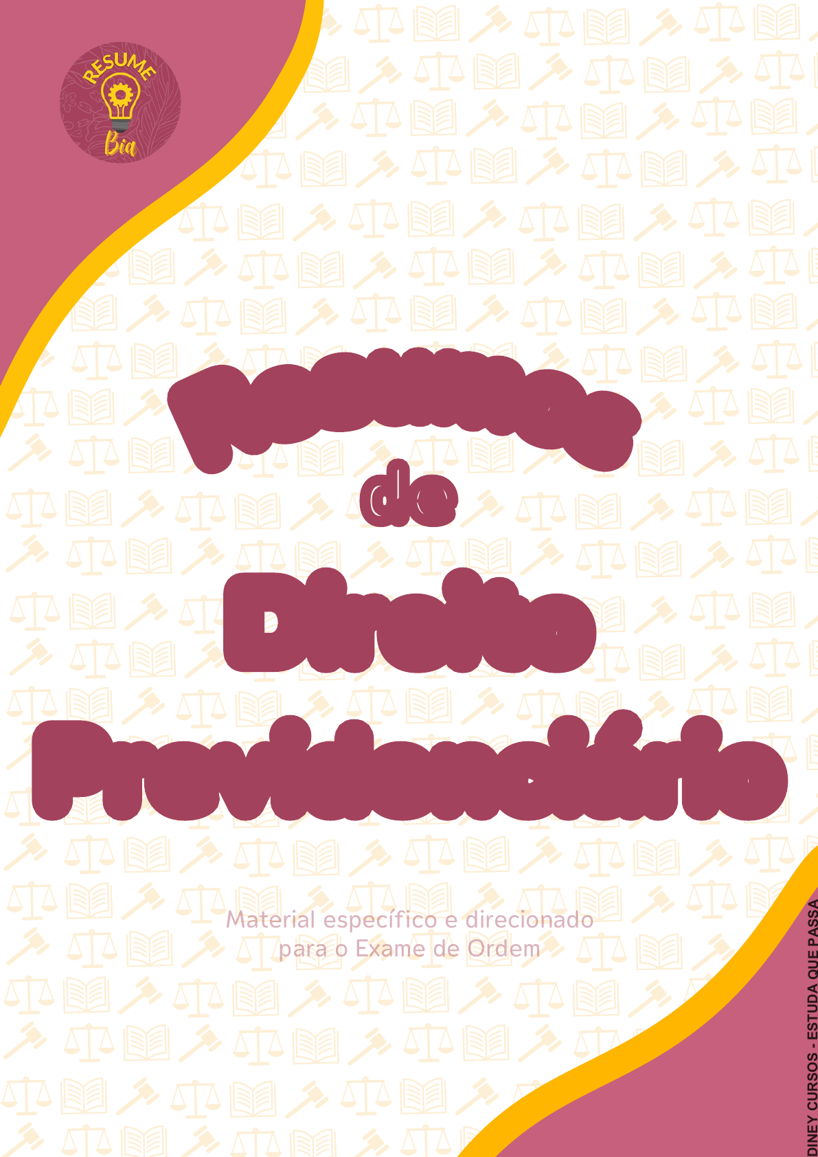 ResumosResumosdede DireitoDireito Material específico e direcionadoMaterial específico e direcionado para o Exame de Ordempara o Exame de Ordem PrevidenciárioPrevidenciário D IN EY C U R SO S - E ST U D A Q U E PA SS A @resumebiaoab Sumário Beneficiários do Regime Geral de Previdência Social -------- 01 Benefícios Previdenciários -------------------------------- 06 Serviços Previdenciários ----------------------------------- 12 Checklist Legislação --------------------------------------- 14 O acesso ao material é pessoal e intransferível, sendo proibido o compartilhamento com terceiros. Ademais, a propagação da obra pode configurar o delito previsto no artigo 184 do Código Penal. D IN EY C U R SO S - E ST U D A Q U E PA SS A Beneficiários do RGPS Segurados Dependentes São apenas beneficiários, não precisam contribuir. Obrigatórios Facultativos Excluídos do RGPS: Servidor civil ocupante de cargo efetivo ou o militar da União, Estado, Distrito Federal ou Município, bem como o das respectivas autarquias e fundações, desde que amparados por regime próprio de previdência social. Aquele que presta serviço: Natureza urbana ou rural à empresa. Caráter não eventual. Sob sua subordinação. Mediante remuneração. Inclusive como diretor empregado. @resumebiaoab Beneficiários do Regime Geral de Previdência Social Beneficiários do Regime Geral de Previdência Social Segurados ObrigatóriosSegurados Obrigatórios Pessoas físicas São beneficiários e contribuintes. 1ª Classe 2ª Classe 3ª Classe Empregado Empregado doméstico Contribuinte individual Trabalhador avulso Segurado especial Cônjuge Companheiro Filho Pais Irmãos Empregado Contratado por empresa de trabalho temporário: Presta serviço para atender: Necessidade transitória de substituição de pessoal regular e permanente; ou Acréscimo extraordinário de serviços de outras empresas. Não poderá exceder o prazo de 180 dias, consecutivos ou não, prorrogável por mais 90 dias. Brasileiro ou o estrangeiro: Domiciliado e contratado no Brasil. Para trabalhar como empregado em sucursal ou agência de empresa nacional no exterior. Aquele que presta serviço no Brasil a: Missão diplomática; ou Repartição consular de carreira estrangeira e a órgãos a elas subordinados; ou Membros dessas missões e repartições. Excluídos: Não-brasileiro sem residência permanente no Brasil; Brasileiro amparado pela legislação previdenciária do país da respectiva missão diplomática ou repartição consular. 01 D IN EY C U R SO S - E ST U D A Q U E PA SS A Presta serviço de forma contínua, subordinada, onerosa e pessoal. À pessoa ou família, no âmbito residencial. Em atividade sem fins lucrativos por + de 2 dias por semana. Empregado doméstico Trabalhador intermitente Prestação de serviços com subordinação. De forma não contínua. Com alternância de período de prestação de serviços e de inatividade. Em conformidade com a CLT. Pessoa física, proprietária ou não, que explora atividade AGROPECUÁRIA, a qualquer título. Em caráter permanente ou temporário. Em área: Maior a 4 módulos fiscais; Igual ou inferior a 4 módulos fiscais, ou atividade pesqueira, com auxílio de empregados ou por intermédio de prepostos. Contribuinte individual @resumebiaoab Brasileiro civil que trabalha para a União: No exterior. Em organismos oficiais brasileiros ou internacionais dos quais o Brasil seja membro efetivo. Ainda que lá domiciliado e contratado. Exceto se segurado na forma da legislação vigente do país do domicílio. Brasileiro ou estrangeiro: Domiciliado e contratado no Brasil. Para trabalhar como empregado em empresa domiciliada no exterior. Cuja maioria do capital votante pertença à empresa brasileira de capital nacional. Servidor público: Ocupante de cargo em comissão. Sem vínculo efetivo com a União, Autarquias, inclusive em regime especial, e Fundações Públicas Federais. Exercente de mandato eletivo: Federal, estadual ou municipal. Exceto se vinculado a regime próprio de previdência social. Empregado de organismo oficial internacional ou estrangeiro: Em funcionamento no Brasil. Exceto quando coberto por regime próprio de previdência social. Estagiário que presta serviço em desacordo com a Lei nº 11.788/08 (Lei de Estágio). Servidor contratado por tempo determinado para atender à necessidade temporária de excepcional interesse público. Escreventes e auxiliares contratados por titular de serviços notariais e de registro. Trabalhador rural contratado por produtor rural pessoa física por prazo de até 2 meses dentro do período de 1 ano, para o exercício de atividades de natureza temporária. 02 D IN E Y C U R S O S - E S T U D A Q U E P A S S A Quem presta serviço: Natureza urbana ou rural. Caráter eventual. A 1 ou + empresas. Sem relação de emprego. @resumebiaoab Pessoa física, proprietária ou não, que explora atividade de EXTRAÇÃO MINERAL (garimpo): Em caráter permanente ou temporário. Diretamente ou por intermédio de prepostos. Com ou sem o auxílio de empregados, utilizados a qualquer título, ainda que de forma não contínua. Ministro de confissão religiosa e o membro de instituto de vida consagrada, de congregação ou de ordem religiosa. Exemplo: Pastores e padres. Brasileiro civil que trabalha no exterior: Para organismo oficial internacional do qual o Brasil é membro efetivo. Ainda que lá domiciliado e contratado. Exceto quando coberto por regime próprio de previdência social. Observação! Se o trabalho for prestado para a União caracteriza condição de contribuinte empregado. Desde que recebam remuneração de trabalho decorrente da empresa: Empresário individual e titular de empresa individual de responsabilidade limitada, urbana ou rural; Diretor não empregado e o membro de conselho de administração de sociedade anônima. Sócio de sociedade em nome coletivo. Sócio solidário, sócio gerente, sócio cotista e administrador, quant