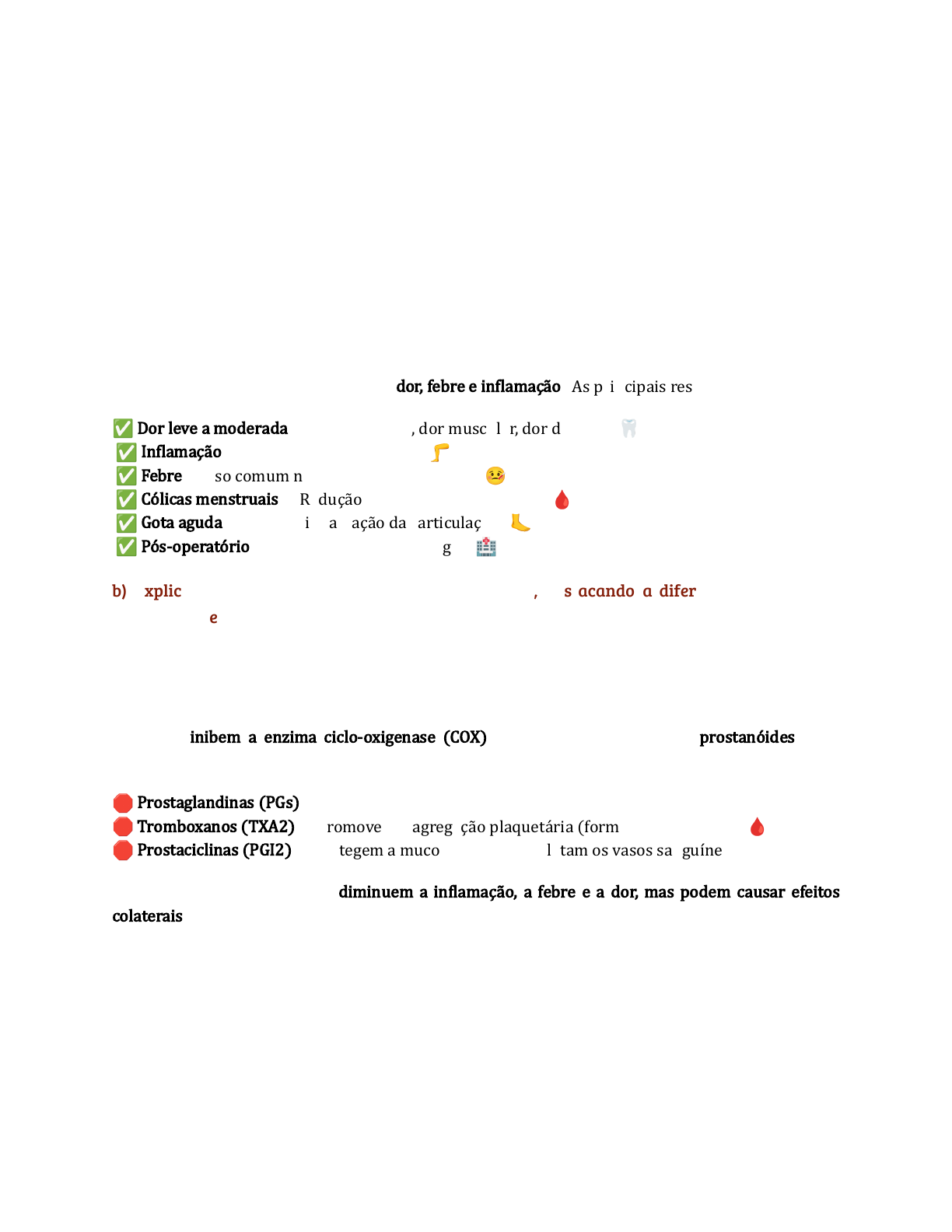 Práticas Funcionais SP 01- Anti-inflamatórios não esteroidais (AINEs): 1) Em relação aos AINEs: a) Descrever as indicações. Os AINEs são muito usados para tratar dor, febre e inflamação . As principais restrições incluem: ✅ Dor leve a moderada → Dor de cabeça, dor muscular, dor de dente 🦷. ✅ Inflamação → Artrite, tendinite, bursite 🦵. ✅ Febre → Uso comum na gripe e infecções virais 🤒. ✅ Cólicas menstruais → Redução da dor e do sangramento 🩸. ✅ Gota aguda → Reduz a inflamação das articulações 🦶. ✅ Pós-operatório → Alívio da dor após cirurgias 🏥. b) Explicar detalhadamente seu mecanismo de ação, destacando a diferença entre os não seletivos, seletivos e altamente seletivos (coxibes). Lembre-se de dar exemplos de fármacos de cada grupo. Além disso, saiba descrever a ação dos AINEs na cascata de síntese de prostanóides: prostaglandinas, prostaciclinas e tromboxanos. Os AINEs inibem a enzima ciclo-oxigenase (COX), facilitando a produção de prostanóides , que incluem: 🛑 Prostaglandinas (PGs) → Responsáveis por dor, inflamação e febre. 🛑 Tromboxanos (TXA2) → Promovem a agregação plaquetária (formação de coágulos 🩸). 🛑 Prostaciclinas (PGI2) → Protegem a mucosa gástrica e dilatam os vasos sanguíneos. ➡ Como resultado, os AINEs diminuem a inflamação, a febre e a dor, mas podem causar efeitos colaterais . Tipos de AINEs 💊 e exemplos 🟥 Não seletivos (COX-1 e COX-2) → Inibem ambas as isoformas da COX, aumentando o risco de efeitos colaterais gástricos e cardiovasculares. 📌Exemplos : Ibuprofeno, naproxeno, diclofenaco, ácido acetilsalicílico (AAS). 🟦 Seletivos para COX-2 → Menos efeitos gastrointestinais, mas ainda podem ter risco cardiovascular. 📌Exemplo : Meloxicam, nimesulida. 🟩 Altamente seletivos (coxibes - COX-2 específicos) → Foram desenvolvidos para reduzir efeitos colaterais gástricos, mas podem aumentar o risco cardiovascular. 📌Exemplos : Celecoxibe, etoricoxibe, rofecoxibe (retirado do mercado por risco cardíaco). ⚠ Diferencial entre COX-1 e COX-2 ✔ COX-1 → Produz prostanóides protetores do estômago e enxaguatórios, além de tromboxanos (coagulação). ✔ COX-2 → Induzida em inflamações e responsável pela dor. c) Citar e explicar o porquê dos principais efeitos colaterais tanto dos AINEs tradicionais como dos coxibes. ➡ AINEs tradicionais (não seletivas) ❌ Gastrite e úlceras → COX-1 protege o estômago, então sua inibição pode causar lesões gástricas. ❌ Sangramentos → Menos tromboxanos = menor coagulação. ❌ Lesão renal → Prostaciclina dilata os vasos renais; sua proteção pode causar insuficiência renal. ❌ Aumento da pressão arterial → Pode variar o equilíbrio de líquidos. ➡ Coxibes (altamente seletivos para COX-2) ❌ Aumento do risco cardiovascular → Bloqueiam a produção de prostaciclinas (PGI2), que protegem contra trombose. ❌ Infarto e AVC → Tromboxanos continuam sendo produzidos, favorecendo coágulos. d) Discutir por que os coxibes podem produzir efeitos colaterais até mais graves que os AINEs tradicionais. Além disso, discutir porque, quando foram lançados, os pesquisadores acreditavam que os coxibes produziriam menos efeitos colaterais que os AINEs tradicionais. Quando lançados, os coxibes foram promovidos como uma alternativa mais segura , pois: ✔ Não inibem a COX-1 , preservando a proteção gástrica. ✔ Teriam menos risco de gastrite e úlceras . 🚨 Mas surgiram problemas: ➡ A COX-2 também produz prostaciclinas (PGI2) , que protegem contra trombose . ➡ A inibição da COX-2 sem afetar a COX-1 pode favorecer coágulos e aumentar o risco cardiovascular . ➡ Isso levou à retirada do rofecoxibe do mercado após associação com infartos. 📌 Conclusão : Os coxibes realmente reduziram os problemas gástricos, mas aumentaram o risco de infarto e AVC , tornando-os inseguros para muitos pacientes. e) Esclarecer o motivo pelo qual os AINEs podem interagir com alguns anti-hipertensivos, reduzindo ou inibindo seus efeitos. 📌 Por que os AINEs reduzem o efeito de alguns anti-hipertensivos? ➡ Muitos anti-hipertensivos atuam relaxando os vasos sanguíneos. ➡ A prostaciclina (PGI2), que os AINEs inibem, ajuda a dilatar os vasos . ➡ Sem prostaciclinas, há vasoconstrição , rápida a eficácia de anti-hipertensivos como: ✔ IECA (ex: enalapril, captopril) . ✔Diuréticos (ex: furosemida, hidroclorotiazida) . ⚠AINEs podem piorar a hipertensão arterial em pacientes com risco cardiovascular! f) Embora não seja correto, discutir por que alguns autores não classificam paracetamol e dipirona como pertencentes ao grupo dos AINES. 📌 Alguns autores NÃO os classificam como AINEs porque: ✔ Não têm ação anti-inflamatória significativa . ✔ Seu mecanismo de ação não envolve efeito direto da COX em tecidos periféricos. ✔ Afetam a dor e a febre, mas com menos impacto na inflamação. 📌 Classificação: ✔ Dipirona → Pirazolona (ação analgésica e antipirética). ✔ Paracetamol → Anilina (ação analgésica e antipirética). g) Esclarecer, com base em seu mecanismo de ação e efeito colaterais, por que a dipirona e o paracetamol podem ser usados em casos de dengue enquanto que outros AINEs não. ❌ AINEs tradicionais aumentam o risco de sangramento , pois inibem a agregação plaquetária. ❌ Isso pode agravar as formas hemorrágicas da dengue ! ✔ Dipirona e paracetamol são seguros porque: ➡ Não afeta a coagulação como os AINEs. ➡ Reduza a febre e o dor sem interferir na função plaquetária. 📌Por isso, na dengue, use paracetamol ou dipirona e NÃO AINEs como ibuprofeno ou ácido acetilsalicílico! h) Explicar por que o ácido acetilsalicílico pode ser usado como antiagregante plaquetário e por que, caso o paciente vá passar por uma cirurgia, seu uso deve ser interrompido ao menos 7 dias antes do procedimento. 📌Por que 