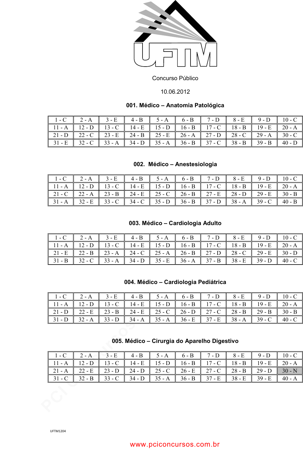 pcimarkpci MDAwMDowMDAwOjAwMDA6MDAwMDowMDAwOmZmZmY6YjExZTo4Nzgz:VHVlLCAxMSBNYXIgMjAyNSAxNzo0MjowNSAtMDMwMA== www.pciconcursos.com.br UFTM1204 Concurso Público 10.06.2012 001. Médico – Anatomia Patológica 1 - C 2 - A 3 - E 4 - B 5 - A 6 - B 7 - D 8 - E 9 - D 10 - C 11 - A 12 - D 13 - C 14 - E 15 - D 16 - B 17 - C 18 - B 19 - E 20 - A 21 - D 22 - C 23 - E 24 - B 25 - E 26 - A 27 - D 28 - C 29 - A 30 - C 31 - E 32 - C 33 - A 34 - D 35 - A 36 - B 37 - C 38 - B 39 - B 40 - D 002. Médico – Anestesiologia 1 - C 2 - A 3 - E 4 - B 5 - A 6 - B 7 - D 8 - E 9 - D 10 - C 11 - A 12 - D 13 - C 14 - E 15 - D 16 - B 17 - C 18 - B 19 - E 20 - A 21 - C 22 - A 23 - B 24 - E 25 - C 26 - B 27 - E 28 - D 29 - E 30 - B 31 - A 32 - E 33 - C 34 - C 35 - D 36 - B 37 - D 38 - A 39 - C 40 - B 003. Médico – Cardiologia Adulto 1 - C 2 - A 3 - E 4 - B 5 - A 6 - B 7 - D 8 - E 9 - D 10 - C 11 - A 12 - D 13 - C 14 - E 15 - D 16 - B 17 - C 18 - B 19 - E 20 - A 21 - E 22 - B 23 - A 24 - C 25 - A 26 - B 27 - D 28 - C 29 - E 30 - D 31 - B 32 - C 33 - A 34 - D 35 - E 36 - A 37 - B 38 - E 39 - D 40 - C 004. Médico – Cardiologia Pediátrica 1 - C 2 - A 3 - E 4 - B 5 - A 6 - B 7 - D 8 - E 9 - D 10 - C 11 - A 12 - D 13 - C 14 - E 15 - D 16 - B 17 - C 18 - B 19 - E 20 - A 21 - D 22 - E 23 - B 24 - E 25 - C 26 - D 27 - C 28 - B 29 - B 30 - B 31 - D 32 - A 33 - D 34 - A 35 - A 36 - E 37 - E 38 - A 39 - C 40 - C 005. Médico – Cirurgia do Aparelho Digestivo 1 - C 2 - A 3 - E 4 - B 5 - A 6 - B 7 - D 8 - E 9 - D 10 - C 11 - A 12 - D 13 - C 14 - E 15 - D 16 - B 17 - C 18 - B 19 - E 20 - A 21 - A 22 - E 23 - D 24 - D 25 - C 26 - E 27 - C 28 - B 29 - D 30 - N 31 - C 32 - B 33 - C 34 - D 35 - A 36 - B 37 - E 38 - E 39 - E 40 - A www.pciconcursos.com.br pcimarkpci MDAwMDowMDAwOjAwMDA6MDAwMDowMDAwOmZmZmY6YjExZTo4Nzgz:VHVlLCAxMSBNYXIgMjAyNSAxNzo0MjowNSAtMDMwMA== www.pciconcursos.com.br UFTM1204 006. Médico – Cirurgia Geral 1 - C 2 - A 3 - E 4 - B 5 - A 6 - B 7 - D 8 - E 9 - D 10 - C 11 - A 12 - D 13 - C 14 - E 15 - D 16 - B 17 - C 18 - B 19 - E 20 - A 21 - E 22 - C 23 - D 24 - D 25 - D 26 - A 27 - E 28 - C 29 - A 30 - B 31 - D 32 - A 33 - B 34 - C 35 - B 36 - E 37 - D 38 - C 39 - E 40 - D 007. Médico – Cirurgia Pediátrica 1 - C 2 - A 3 - E 4 - B 5 - A 6 - B 7 - D 8 - E 9 - D 10 - C 11 - A 12 - D 13 - C 14 - E 15 - D 16 - B 17 - C 18 - B 19 - E 20 - A 21 - B 22 - A 23 - B 24 - D 25 - E 26 - D 27 - B 28 - E 29 - D 30 - B 31 - D 32 - C 33 - C 34 - D 35 - B 36 - A 37 - C 38 - B 39 - C 40 - A 008. Médico – Clínico Geral 1 - C 2 - A 3 - E 4 - B 5 - A 6 - B 7 - D 8 - E 9 - D 10 - C 11 - A 12 - D 13 - C 14 - E 15 - D 16 - B 17 - C 18 - B 19 - E 20 - A 21 - A 22 - E 23 - B 24 - D 25 - C 26 - A 27 - B 28 - C 29 - D 30 - E 31 - D 32 - C 33 - A 34 - B 35 - N 36 - D 37 - E 38 - A 39 - B 40 - C 010. Médico – Ginecologia e Obstetrícia 1 - C 2 - A 3 - E 4 - B 5 - A 6 - B 7 - D 8 - E 9 - D 10 - C 11 - A 12 - D 13 - C 14 - E 15 - D 16 - B 17 - C 18 - B 19 - E 20 - A 21 - E 22 - A 23 - B 24 - A 25 - E 26 - D 27 - A 28 - D 29 - C 30 - B 31 - A 32 - B 33 - B 34 - D 35 - D 36 - E 37 - C 38 - B 39 - D 40 - D 011. Médico – Mastologia 1 - C 2 - A 3 - E 4 - B 5 - A 6 - B 7 - D 8 - E 9 - D 10 - C 11 - A 12 - D 13 - C 14 - E 15 - D 16 - B 17 - C 18 - B 19 - E 20 - A 21 - A 22 - A 23 - B 24 - B 25 - A 26 - D 27 - E 28 - E 29 - C 30 - D 31 - C 32 - D 33 - C 34 - A 35 - E 36 - B 37 - E 38 - C 39 - D 40 - B 012. Médico – Nefrologia 1 - C 2 - A 3 - E 4 - B 5 - A 6 - B 7 - D 8 - E 9 - D 10 - C 11 - A 12 - D 13 - C 14 - E 15 - D 16 - B 17 - C 18 - B 19 - E 20 - A 21 - D 22 - B 23 - A 24 - C 25 - C 26 - E 27 - B 28 - D 29 - A 30 - E 31 - D 32 - E 33 - C 34 - E 35 - A 36 - E 37 - B 38 - D 39 - C 40 - A 013. Médico – Radiologia (Ressonância Magnética) 1 - C 2 - A 3 - E 4 - B 5 - A 6 - B 7 - D 8 - E 9 - D 10 - C 11 - A 12 - D 13 - C 14 - E 15 - D 16 - B 17 - C 18 - B 19 - E 20 - A 21 - A 22 - D 23 - B 24 - A 25 - B 26 - E 27 - D 28 - B 29 - C 30 - C 31 - E 32 - E 33 - A 34 - A 35 - D 36 - E 37 - C 38 - D 39 - N 40 - B www.pciconcursos.com.br pcimarkpci MDAwMDowMDAwOjAwMDA6MDAwMDowMDAwOmZmZmY6YjExZTo4Nzgz:VHVlLCAxMSBNYXIgMjAyNSAxNzo0MjowNSAtMDMwMA== www.pciconcursos.com.br UFTM1204 014. Médico – Radioterapia 1 - C 2 - A 3 - E 4 - B 5 - A 6 - B 7 - D 8 - E 9 - D 10 - C 11 - A 12 - D 13 - C 14 - E 15 - D 16 - B 17 - C 18 - B 19 - E 20 - A 21 - C 22 - A 23 - B 24 - C 25 - A 26 - D 27 - D 28 - A 29 - C 30 - B 31 - C 32 - E 33 - B 34 - C 35 - A 36 - E 37 - A 38 - C 39 - A 40 - B 015. Médico – Reumatologia 1 - C 2 - A 3 - E 4 - B 5 - A 6 - B 7 - D 8 - E 9 - D 10 - C 11 - A 12 - D 13 - C 14 - E 15 - D 16 - B 17 - C 18 - B 19 - E 20 - A 21 - D 22 - E 23 - D 24 - D 25 - C 26 - E 27 - A 28 - B 29 - C 30 - D 31 - E 32 - E 33 - B 34 - B 35 - C 36 - A 37 - B 38 - A 39 - C 40 - A 016. Médico – Urologia Pediátrica 1 - C 2 - A 3 - E 4 - B 5 - A 6 - B 7 - D 8 - E 9 - D 10 - C 11 - A 12 - D 13 - C 14 - E 15 - D 16 - B 17 - C 18 - B 19 - E 20 - A 21 - A 22 - A 23 - D 24 - B 25 - C 26 - E 27 - B 28 - E 29 - C 30 - D 31 - A 32 - B 33 - E 34 - A 35 - C 36 - D 37 - D 38 - A 39 - C 40 - A www.pciconcursos.com.br pcimarkpci MDAwMDowMDAwOjAwMDA6MDAwMDowMDAwOmZmZmY6YjExZTo4Nzgz:VHVlLCAxMSBNYXIgMjAyNSAxNzo0MjowNSAtMDMwMA== www.pciconcursos.com.br UFTM 1204 Concurso Público 24.06.2012 009. Médico - Área: CTI Adulto 1 - B 2 - D 3 - C 4 - E 5 - A 6 - A 7 - C 8 - B 9 - E 10 - D 11 - B 12 - D 13 - A 14 - C 15 - E 16 - D 17 - A 18 - C 19 - B 20 - E 21 - B 22 - C 23 - D 24 - E 25 - C 26 - B 27 - A 28 - A 29 - C 30 - E 31 - D 32 - B 33 - B 34 - A 35 - E 36 - C 37 - E 38 - D 39 - D 40 - A www.pciconcursos.com.br