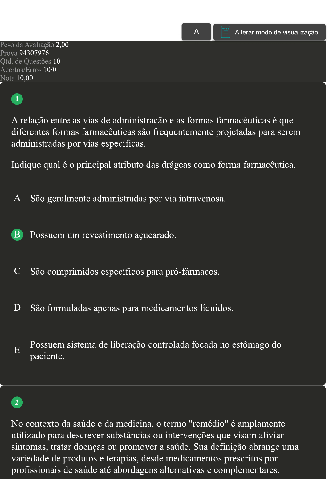 A Alterar modo de visualização Peso da Avaliação 2,00 Prova 94307976 Qtd. de Questões 10 Acertos/Erros 10/0 Nota 10,00 1 A relação entre as vias de administração e as formas farmacêuticas é que diferentes formas farmacêuticas são frequentemente projetadas para serem administradas por vias específicas. Indique qual é principal atributo das drágeas como forma farmacêutica. A São geralmente administradas por via intravenosa. B Possuem um revestimento açucarado. C São comprimidos específicos para pró-fármacos. D São formuladas apenas para medicamentos líquidos. Possuem sistema de liberação controlada focada no estômago do E paciente. 2 No contexto da saúde e da medicina, termo "remédio" é amplamente utilizado para descrever substâncias ou intervenções que visam aliviar sintomas, tratar doenças ou promover a saúde. Sua definição abrange uma variedade de produtos e terapias, desde medicamentos prescritos por profissionais de saúde até abordagens alternativas e complementares.Compreender conceito de remédio é essencial para indivíduos que buscam melhorar sua saúde e bem-estar, bem como para profissionais da área da saúde que prescrevem tratamentos adequados aos pacientes. Indique qual é a definição de remédio. A Apenas tratamentos realizados em hospitais. B Qualquer dispositivo que promove a cura de doenças. Qualquer substância que produz efeitos benéficos ou tratamento para paciente, incluindo chás, dietas, fisioterapia, entre outros. D Tratamentos focados em plantas medicinais e terapias alternativas. E Apenas medicamentos prescritos por médicos. 3 A excreção de fármacos é processo pelo qual os medicamentos e seus metabólitos são removidos do organismo, principalmente pelos rins e, em menor medida, pelo fígado, intestinos, pulmões e outras vias excretoras. Acerca da excreção de fármacos do organismo, analise as afirmativas a seguir: A pós passarem pelo processo de metabolização, os fármacos são eliminados do organismo por meio da secreção, que ocorre principalmente nos rins através da urina, mas também pode ocorrer em outros órgãos como pulmão, intestino e bile, resultando na excreção pelas fezes e outras secreções corporais, como suor, lágrima e saliva. II- A farmacocinética oferece insights cruciais sobre como os fármacos são absorvidos, distribuídos, metabolizados e excretados pelo organismo,fornecendo informações valiosas para planejamento de estudos pré-clínicos e clínicos, bem como para desenvolvimento de estratégias terapêuticas mais eficazes e seguras. III- A compreensão dos processos de excreção dos fármacos é importante não apenas para a avaliação da eficácia e segurança dos medicamentos, mas também para a otimização de sua dosagem e administração, garantindo assim sua eficácia terapêutica e minimizando potenciais efeitos adversos. IV- Apesar de apresentarem diversas vias, quando falamos de medicamentos especificamente, a única via disponível para excreção é a renal. Assinale a alternativa que apresenta a sequência CORRETA: A II e III, apenas. B I e IV, apenas. C III e IV, apenas. D I, II e III, apenas. E I, III e IV, apenas. 4 As vias de administração menos utilizadas são aquelas que não são tão comuns quanto as formas oral, intravenosa, intramuscular, subcutânea e intradérmica. Embora menos frequentemente utilizadas, essas vias podem ser importantes em determinadas situações clínicas. A respeito de vias de administração diversas, analise as afirmativas a seguir:I- A injeção intra-articular é utilizada para administrar fármacos diretamente nos espaços articulares, especialmente em casos de artrite, proporcionando um efeito localizado. II- A inalação é uma via de administração característica por ter efeito extremamente vagaroso, sendo fornecida através da superfície da membrana mucosa do trato respiratório e do epitélio pulmonar. III- A administração é necessária quando os fármacos precisam ser entregues diretamente no líquido cérebro-espinhal como no tratamento da meningite criptocócica com a anfotericina B. IV- A via tópica é caracterizada pela aplicação direta do fármaco na pele ou mucosa, resultando em um efeito localizado, sem a necessidade de ser absorvido no sistema circulatório. Assinale a alternativa CORRETA: A III e IV, apenas. B I e IV, apenas. C I, III e IV, apenas. D I, II e III, apenas. E II e III, apenas.5 Escolher a forma adequada é de extrema importância para garantir sucesso da farmacoterapia, ou seja, tratamento medicamentoso de uma determinada condição médica. Acerca das formas farmacêuticas, analise as afirmativas a seguir: I- Os supositórios são formas sólidas destinadas à inserção em orifícios corporais para exercer efeito local ou sistêmico, podendo fundir, amolecer ou dissolver. Uma vantagem dos supositórios é sua utilidade em crianças que têm dificuldade para engolir formas orais, proporcionando uma opção de administração alternativa. Os óvulos, semelhantes aos supositórios, são usados na aplicação vaginal, apresentando formato ovoide e difundindo-se ou dispersando-se para exercer sua ação. IV- Supositórios podem ser usados em qualquer condição de saúde sem contraindicações, e são livres de efeitos adversos e colaterais. Assinale a alternativa que apresenta a sequência CORRETA: A I e IV, apenas. B II e III, apenas. C I, II e III, apenas.D III e IV, apenas. E I, III e IV, apenas. 6 A incidência e a prevalência das reações adversas medicamentosas (RAM) variam amplamente dependendo de diversos fatores, como tipo de medicamento, a população em estudo, a duração do tratamento, entre outros. Alguns medicamentos apresentam uma taxa mais alta de RAM do que outros devido à sua natureza e ao modo como interagem com organismo. Indique qual é a definição de reação adversa medicamentosa. Qualquer resposta do medicamento que seja benéfica e intencional, A ocorrend