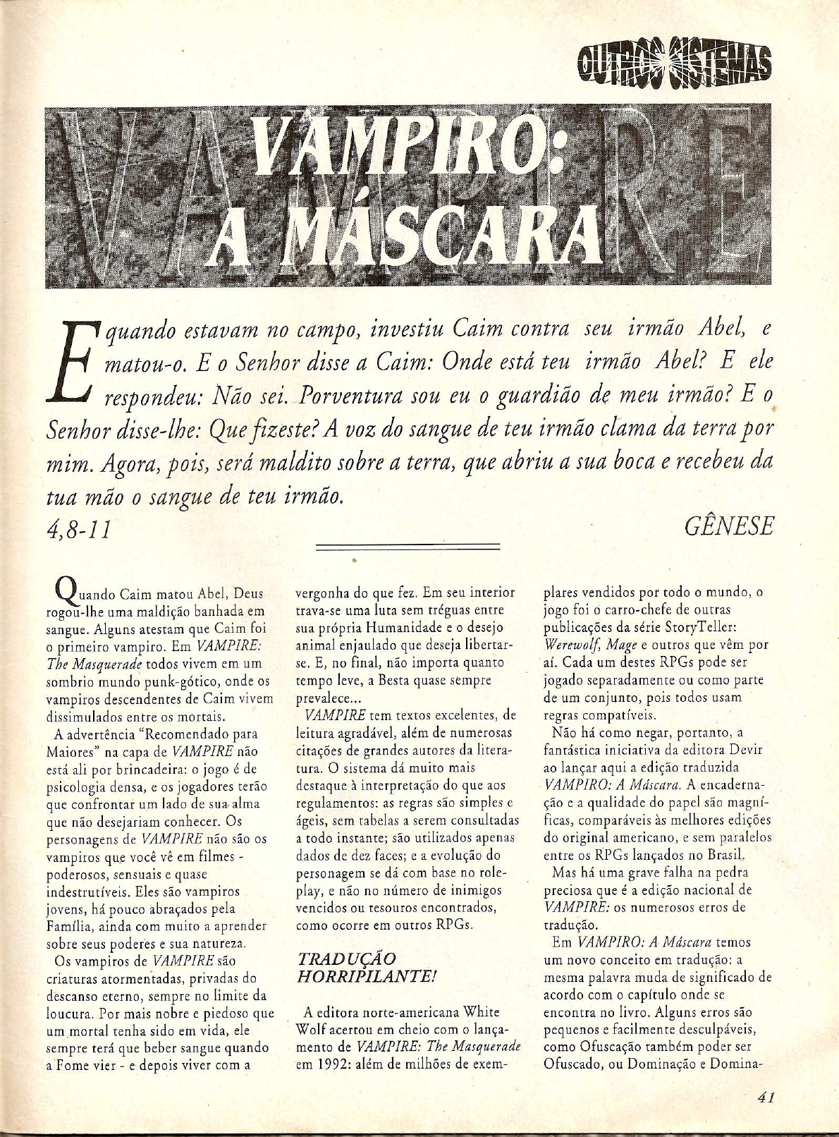 VAMPIRO: MASCARA quando estavam no campo, investiu Caim contra seu irmão Abel, e E matou-0. E 0 disse a Caim: Onde está teu irmão Abel? E ele respondeu: Não sei. Porventura sou eu 0 guardião de meu irmão? E Senhor disse-lhe: Que fizeste? A voz do sangue de teu irmão clama da terra por mim. Agora, pois, será maldito sobre a terra, que abriu a sua boca e recebeu da tua mão 0 sangue de teu irmão. 4,8-11 GÊNESE Q uando Caim matou Abel, Deus vergonha do que fez. Em seu interior plares vendidos por todo o mundo, o rogou-lhe uma maldição banhada em trava-se uma luta sem tréguas entre jogo foi o carro-chefe de outras sangue. Alguns atestam que Caim foi sua própria Humanidade e o desejo publicações da série StoryTeller: o primeiro vampiro. Em VAMPIRE: animal enjaulado que deseja libertar- Werewolf, Mage e outros que vêm por The Masquerade todos vivem em um se. E, no final, não importa quanto aí. Cada um destes RPGs pode ser sombrio mundo punk-gótico, onde os tempo leve, a Besta quase sempre jogado separadamente ou como parte vampiros descendentes de Caim vivem prevalece.. de um conjunto, pois todos usam dissimulados entre os mortais. VAMPIRE tem textos excelentes, de regras compatíveis. A advertência "Recomendado para leitura agradável, além de numerosas Não há como negar, portanto, a Maiores" na capa de VAMPIRE não citações de grandes autores da litera- fantástica iniciativa da editora Devir está ali por brincadeira: o jogo é de tura. sistema dá muito mais ao lançar aqui a edição traduzida psicologia densa, e os jogadores terão destaque à interpretação do que aos VAMPIRO: A Máscara. A encaderna- que confrontar um lado de regulamentos: as regras são simples e ção e a qualidade do papel são magní- que não desejariam conhecer. Os ágeis, sem tabelas a serem consultadas ficas, comparáveis às melhores edições personagens de VAMPIRE não são os a todo instante; são utilizados apenas do original americano, e sem paralelos vampiros que você vê em filmes dados de dez faces; e a evolução do entre os RPGs lançados no poderosos, sensuais e quase personagem se dá com base no role- Mas há uma grave falha na pedra indestrutíveis. Eles são vampiros play, e não no número de inimigos preciosa que é a edição nacional de jovens, há pouco abraçados pela vencidos ou tesouros encontrados, VAMPIRE: os numerosos erros de Família, ainda com muito a aprender como ocorre em outros RPGs. tradução. sobre seus poderes e sua natureza. Em VAMPIRO: A Máscara temos Os vampiros de VAMPIRE são TRADUÇÃO um novo conceito em tradução: a criaturas atormentadas, privadas do HORRIPILANTE! mesma palavra muda de significado de descanso eterno, sempre no limite da acordo com o capítulo onde se loucura. Por mais nobre e piedoso que A editora norte-americana White encontra no livro. Alguns erros são um mortal tenha sido em vida, ele Wolf acertou em cheio com o lança- pequenos e facilmente desculpáveis, sempre terá que beber sangue quando mento de VAMPIRE: The Masquerade como Ofuscação também poder ser a Fome vier e depois viver com a em 1992: além de milhões de exem- Ofuscado, ou Dominação e Domina- 41do. Mas os Toreador e Brujah terem uma disciplina a menos é coisa imperdoável! A disciplina Celeridade não existe na descrição das discipli- nas; e a disciplina Rapidez não pode ser utilizada por nenhum vampiro a não ser os Caitiff. BRASILEIRO MARGINAL? Será que todos os brasileiros são marginais? Em uma aventura ambien- tada no Brasil, devemos todos colocar o conceito Marginal em nossa planilha? De acordo com a edição traduzida de VAMPIRE, a resposta é sim! No quadro que descreve os conceitos (pág. 86), é definido como Marginal todo aborígene, homossexu- al e CIDADÃO DO TERCEIRO MUNDO! Estranho que todos os nomes de tenham sido deixados intocados (claro, nome não se traduz!) e o cla Malkavian tenha inexplicavelmente se tornado "Os Difícil também entender a tradução de Wits para Raciocínio: o Aurélio define "Raciocinar" como "Usar da razão para reconhecer, para julgar da relação das coisas" o que nada tem a ver com rapidez de pensamento, o real significado da palavra wits. Depois de publicar no Brasil obras de peso como o GURPS e vários de seus suplementos (veja GURPS Viagem no Tempo, nesta edição), é inacreditável que a Devir tenha cometido erros tão tolos na tradução de Seriam tais defeitos decorrentes da pressa em lançar o jogo no II Encontro Internacional de RPG, realizado em São Paulo no último mês de maio? Bem, o jeito é esperar por uma segunda edição revisada ou, pelo menos, uma errata. É o mínimo que a Devir pode fazer para apagar esta mancha (de sangue vampírico!) em sua reputação. Um último e curioso detalhe: a edição nacional de VAMPIRE traz, de brinde, uma dentadura de vampiro. ILUSTR. DO LIVRO VAMPIRE LUIGI 42 DRAGON