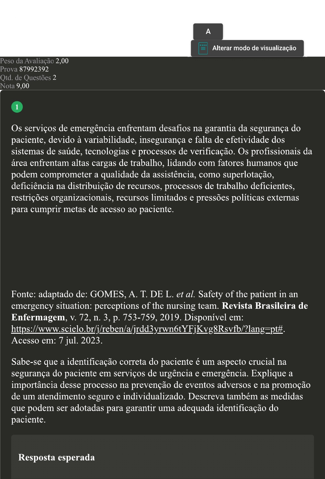 A Alterar modo de visualização Peso da Avaliação 2,00 Prova 87992392 Qtd. de Questões 2 Nota 9,00 1 Os serviços de emergência enfrentam desafios na garantia da segurança do paciente, devido à variabilidade, insegurança e falta de efetividade dos sistemas de saúde, tecnologias e processos de verificação. Os profissionais da área enfrentam altas cargas de trabalho, lidando com fatores humanos que podem comprometer a qualidade da assistência, como superlotação, deficiência na distribuição de recursos, processos de trabalho deficientes, restrições organizacionais, recursos limitados e pressões políticas externas para cumprir metas de acesso ao paciente. Fonte: adaptado de: GOMES, A. T. DE L. et al. Safety of the patient in an emergency situation: perceptions of the nursing team. Revista Brasileira de Enfermagem, V. 72, n. 3, p. 753-759, 2019. Disponível em: Acesso em: 7 jul. 2023. Sabe-se que a identificação correta do paciente é um aspecto crucial na segurança do paciente em serviços de urgência e emergência. Explique a importância desse processo na prevenção de eventos adversos e na promoção de um atendimento seguro e individualizado. Descreva também as medidas que podem ser adotadas para garantir uma adequada identificação do paciente. Resposta esperadaA correta identificação do paciente é de grande relevância nos serviços de urgência e emergência, visando prevenir eventos adversos e garantir um atendimento seguro e personalizado. Essas práticas contribuem para evitar trocas de medicamentos, erros de diagnóstico e garantir a realização de intervenções adequadas, promovendo uma assistência de qualidade e minimizando riscos aos pacientes. Algumas medidas que podem ser adotadas nos serviços de urgência e emergência incluem: a utilização de pelo menos dois identificadores (nome completo do paciente, nome completo da mãe do paciente, data de nascimento do paciente); a adoção de pulseiras de identificação; a conferência prévia da identificação do paciente antes de qualquer procedimento, tais como administração de medicamentos, de sangue e hemoderivados, coleta de material para exame, entrega de dieta e procedimentos invasivos; e educar paciente e acompanhantes quanto ao processo de identificação correta. Referência bibliográfica: PISSAIA, L. F.; OLIVEIRA, M. J.; JUNQUEIRA, S. L. S. S. Assistência de Enfermagem na Urgência e Emergência. Indaial-SC: Arqué, 2023. 190 p. Minha resposta é de estrema necessidade a identificação do paciente para evitar acidentes e eventos adversos , é importante mesmo sempre estar identificado com uma pulseira com nome data de nascimento e de preferencia nome da mãe assim evitamos dar medicações erradas , fazer procedimentos errados , administrar hemocomponentes errados , com uso da pulseira de identificação evitamos dano ao paciente e a seguramos a segurança do mesmo, então sempre devemos identificar paciente com pulseira e antes de qualquer procedimentos conferir com prontuário e com a pulseira para ter certeza que aquela coisa é pra ser feita realmente no paciente que estamos atendendo. Retorno da correção Parabéns acadêmico, sua resposta se aproximou dos objetivos da questão, poderia apenas ter apresentado mais argumentos acerca dos conteúdosdisponibilizados nos materiais didáticos e estudos. 2 Atualmente, a intoxicação emerge como um dos principais meios utilizados por indivíduos para tentar suicídio. O ato suicida representa um sério desafio para os profissionais da saúde e configura-se como uma preocupação relevante na esfera da saúde pública. Portanto, uma abordagem inicial adequada diante de um paciente intoxicado pode influenciar significativamente desfecho clínico. Assim como em qualquer situação de emergência, a intervenção terapêutica demanda uma avaliação ágil da apresentação clínica do paciente intoxicado, bem como a implementação de medidas direcionadas à estabilização e preservação das funções vitais. Fonte: adaptado de: COSTA, A. V. et al. Abordagem ao Paciente Intoxicado no Contexto da Tentativa de Suicídio: um Relato de Experiência. Revista Interdisciplinar em Saúde, Cajazeiras, V. 7, n. 1, p. 2302-2315, 2020. Disponível em: http://www.interdisciplinaremsaude.com.br/Volume 28/Trabalho 168 pdf Acesso em: 7 jul. 2023. As intoxicações exógenas podem ser de origem acidental, ocupacional ou ainda intencional. Nesse contexto, discorra sobre os principais aspectos que devem ser avaliados pelo enfermeiro que realiza atendimento de emergência ao paciente que tentou suicídio com a ingestão de medicamentos. Resposta esperada Os principais aspectos que devem ser avaliados pelo enfermeiro nesse contexto incluem: a avaliação inicial do paciente: enfermeiro deve realizar uma avaliação rápida e precisa das condições gerais do paciente, incluindo verificação dos sinais vitais, nível de consciência, presença de dificuldades respiratórias, entre outros. Identificação da substância ingerida e tempo decorrido desde a ingestão: é fundamental obterinformações sobre tipo de medicamento ingerido, a quantidade, a forma de administração, além do intervalo de tempo transcorrido desde a ingestão, pois isso pode influenciar nas medidas de intervenção a serem adotadas. Monitorização e suporte: é essencial realizar a monitorização contínua dos sinais vitais, como frequência cardíaca, pressão arterial, frequência respiratória e saturação de oxigênio. Caso necessário, devem ser tomadas medidas de suporte, como administração de oxigênio, administração de drogas endovenosas ou suporte ventilatório. Avaliação do estado psicológico: enfermeiro deve estar atento aos aspectos emocionais do paciente, realizando uma avaliação do estado psicológico e considerando a necessidade de suporte emocional, encaminhamento para serviços especializados e notificação às autoridades competentes. Medidas de des