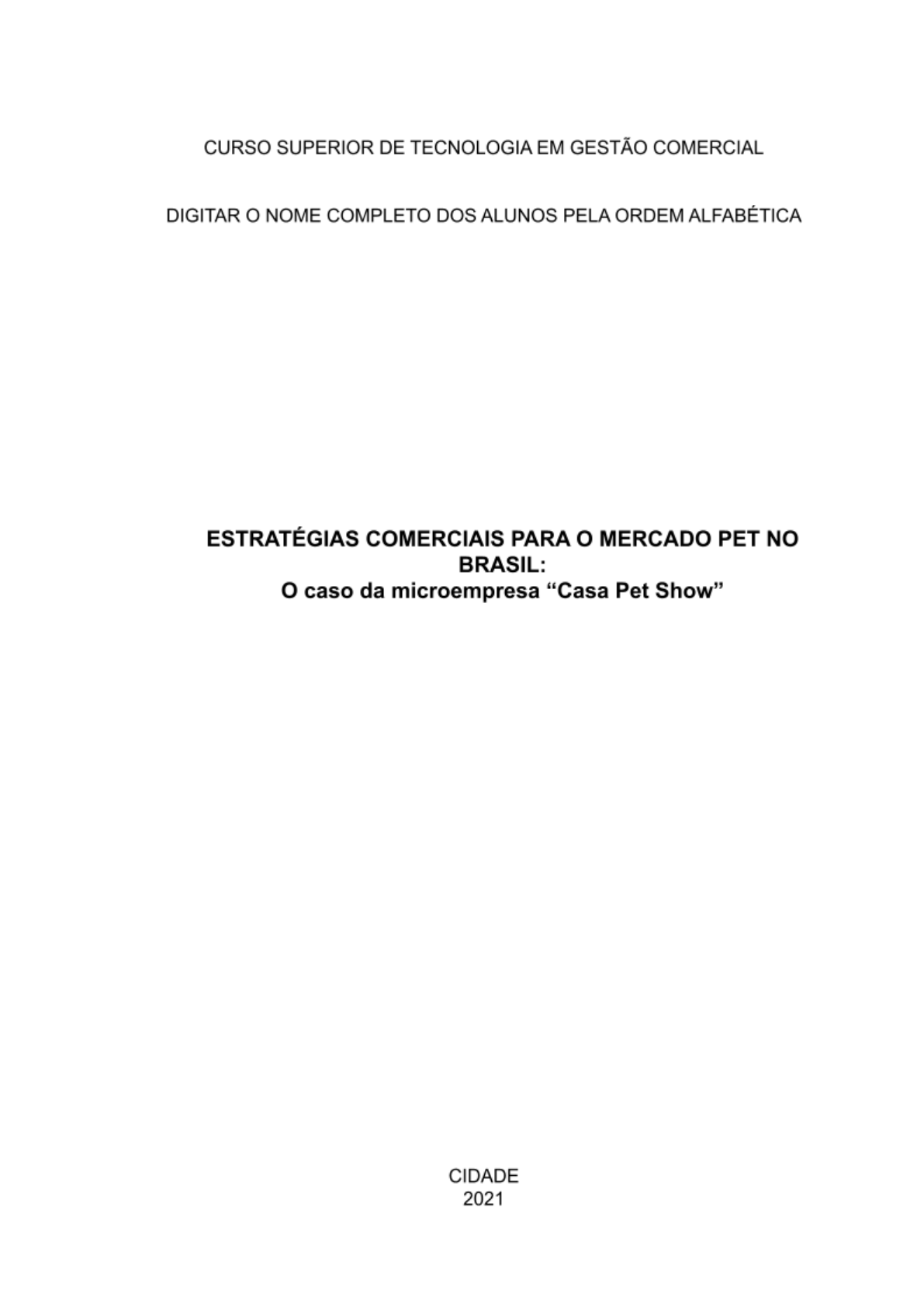 DIGITAR O NOME COMPLETO DOS ALUNOS PELA ORDEM ALFABÉTICA SUMÁRIO 1 INTRODUÇÃO 2 DESENVOLVIMENTO 2.1 Composto Mercadológico 2.2 Comunicação Integrada de Marketing....................................................................4 2.3 Estratégia Econômica e Empresarial 2.4 Gestão de Serviços e Varejo 2.5 Negociação e Gestão de Conflitos 2.6 Sistemas de Informações Gerenciais 3 CONCLUSÃO REFERÊNCIAS Atenção! Atualizar o Sumário: nele deve conter todos os títulos do trabalho e a numeração correta da página onde se encontra cada título. Após finalizar o trabalho, também deverá remover todas as frases em cor vermelha e com realce em cor amarela, pois são apenas orientações para elaboração da pesquisa e NÃO devem estar no trabalho final. Ok? 3 1 INTRODUÇÃO No primeiro parágrafo da Introdução, deverá apresentar o tema do trabalho, descrevendo brevemente o seu contexto, relatar quais os objetivos e a importância dessa pesquisa. No segundo parágrafo da Introdução, deverá relatar que o trabalho se refere aos conteúdos estudados nas disciplinas do semestre e descrever de forma resumida quais são as temáticas abordadas no desenvolvimento do trabalho. Após digitar o texto, remover do trabalho todas as frases em cor vermelha e com realce em cor amarela, pois são apenas orientações para elaboração da pesquisa e NÃO devem estar no trabalho final. Ok? 4 2 DESENVOLVIMENTO 2. 1 Composto Mercadológico As senhoras Marta e Magnólia são proprietárias de um pequeno Pet Shop, chamado “Casa Pet Show”. Essa loja foi inaugurada em 2019 e possui uma estrutura física que oferta produtos e serviços destinados aos cães e gatos domésticos da região. Dessa forma, com o objetivo de aprimorar seus processos de gestão e avaliar o desempenho de seus canais de comunicação, as proprietárias contrataram a assessoria da GCOM Projetos Corporativos. A GCOM Projetos Corporativos sugeriu às proprietárias da empresa “Casa Pet Show” que o portfólio de produtos e serviços fosse revisado. A Matriz BCG é uma ferramenta de grande auxílio para os negócios, uma vez que consegue, baseada no ciclo de vida dos produtos, demonstrar com clareza como melhorar seu portfólio e os cenários futuros de crescimento, com base no seu market share (participação de mercado) e no índice de crescimento esperado desse mercado. Sendo assim, será definido abaixo a Matriz BCG da empresa: Tabela 1 – Matriz BCG da Casa Pet Show Participação Relativa ao Mercado ALTA BAIXA Cresci mento de Mercad o AL TO Estrela Em questionamento B AI X O Vaca Leiteira Abacaxi 5 Para realizar essa etapa, o aluno deverá assistir a teleaula 1 da disciplina Composto Mercadológico, nessa aula a professora explica detalhadamente sobre a Matriz BCG. Outro detalhe importante, é realizar a leitura do livro da disciplina. Portanto, nessa etapa o aluno deverá preencher a tabela da Matriz BCG da Casa Pet Show, posicionando quais são os produtos e serviços ofertados pela Casa Pet Show (Estrela, Vaca Leiteira, Abacaxi, etc). Após completar a tabela da Matriz BCG, abaixo dela o aluno deverá digitar um texto relatando ao menos uma 1 ação estratégica para aumentar as vendas de CADA um dos itens alocados nos quadrantes da matriz. Ao finalizar o texto, remover do trabalho todas as frases em cor vermelha e com realce em cor amarela, pois são apenas orientações para elaboração da pesquisa e NÃO devem estar no trabalho final. Ok? 2.2 Comunicação Integrada de Marketing - CIM A Comunicação Integrada de Marketing, conhecida pela sigla CIM, é essencial para uma empresa se manter competitiva e ser bem vista perante a sua clientela, e também por potenciais consumidores. Para que o mix de comunicação seja bem-sucedido e a empresa alcance melhores resultados e boa reputação, é importante que as oportunidades sejam exploradas e os desafios superados. Identidade e imagem precisam ser repassadas ao consumidor que, por sua vez, devolve à empresa na forma de lealdade, confiança, indicações e parcerias. A partir dessas informações, o aluno deverá digitar um texto apresentando um plano de intervenção para que a Casa Pet Show tenha uma comunicação integrada e assertiva. Lembre-se que as proprietárias Marta e Magnólia contrataram você como o profissional de assessoria comercial, e logo precisam que tragam exemplos do que pode ser feito para que fique mais fácil implementar as ações no empreendimento. Esse texto deverá abordar os seguintes itens: - Fixar o produto na mente do consumidor - Posicionar estrategicamente a marca e os produtos perante o mercado 6 - Oferecer informações e incentivos - Gerar atitudes favoráveis - Assegurar a transmissão de uma mensagem única, coerente e incrível sobre a marca e/ou produto/serviço - Criar uma imagem sustentável para esses elementos. Ao finalizar o texto, remover do trabalho todas as frases em cor vermelha e com realce em cor amarela, pois são apenas orientações para elaboração da pesquisa e NÃO devem estar no trabalho final. Ok? 2.3 Estratégia Econômica e Empresarial A margem de contribuição representa a diferença entre o preço de venda e os custos. Dessa forma, a margem de contribuição é o quanto do preço de venda está disponível para pagar os custos e despesas fixas da empresa. Assim como a margem de contribuição, a estimação do ponto de equilíbrio é fundamental, principalmente em tempos de Pandemia da Covid-19 para que as proprietárias Marta e Magnólia conheçam a real situação econômico e financeira de sua empresa, e assim traçar as metas e objetivos para que sejam alcançadas as vendas necessárias para atingir o ponto de equilíbrio contábil da empresa. Nesse viés, a assessoria apresentará abaixo a tabela contendo as informações referente a margem de contribuição unitária (MC), Margem de Contribuição (%), o ponto de equilíbrio contábil e a receita de equilíbrio para os dois produtos cha