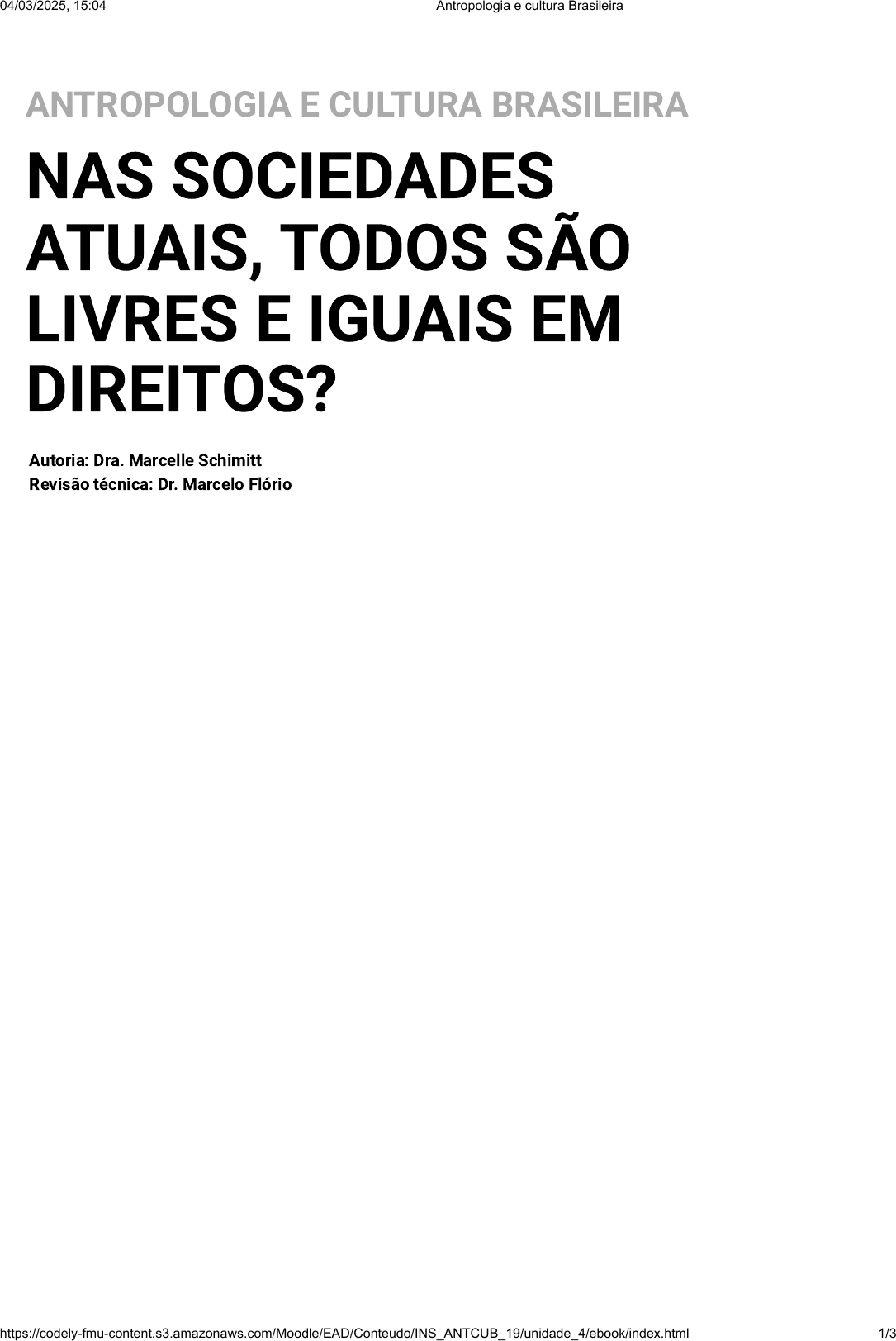 Autoria: Dra. Marcelle Schimitt Revisão técnica: Dr. Marcelo Flório ANTROPOLOGIA E CULTURA BRASILEIRA NAS SOCIEDADES ATUAIS, TODOS SÃO LIVRES E IGUAIS EM DIREITOS? 04/03/2025, 15:04 Antropologia e cultura Brasileira https://codely-fmu-content.s3.amazonaws.com/Moodle/EAD/Conteudo/INS_ANTCUB_19/unidade_4/ebook/index.html 1/38 Introdução Nesta unidade, trataremos de temáticas relacionadas à igualdade, exclusão, direitos, violências e discriminações. Para tanto, iniciaremos nossas reflexões a partir de alguns questionamentos: será que todos os brasileiros possuem as mesmas oportunidades de acesso à saúde, educação e moradia? Por quê? A partir de que premissas históricas e sociais podemos refletir sobre as desigualdades da nossa sociedade? Provavelmente, você já tem algumas sugestões de respostas para essas interrogações, mas será que elas são fundamentadas? Isto é, será que elas, de fato, representam o que ocorre na realidade? Muitas vezes, adotamos formas de explicar a realidade que estão preponderantemente pautadas em conceitos pré-estabelecidos, em julgamentos que não condizem com a vida prática e cotidiana. Por isso, a Antropologia pode nos auxiliar no desenvolvimento de reflexões críticas a respeito de determinados temas e questões, ajudando-nos na construção de um conhecimento situado e embasado empiricamente. Assim, ao longo deste capítulo, iremos nos deparar com questionamentos que podem desestabilizar a forma como concebemos a realidade, e é isso que o conhecimento de forma geral nos propõe. Com isso, repensaremos de que forma nossa sociedade tem lidado com aquilo que é diferente, questionando-nos sobre as maneiras de existir e como elas são integradas ou não ao núcleo social. Afinal, quais são as justificativas que embasam as discriminações sofridas por certos grupos sociais? Será por meio dessas e tantas outras interrogações que refletiremos sobre o preconceito, a discriminação, a exclusão, a cultura e a religião; incluindo o estudo de itens da lei dos direitos humanos e da defesa da dignidade humana. Bons estudos! Tempo estimado de leitura: 60 minutos. 4.1 Preconceito, discriminação e exclusão 04/03/2025, 15:04 Antropologia e cultura Brasileira https://codely-fmu-content.s3.amazonaws.com/Moodle/EAD/Conteudo/INS_ANTCUB_19/unidade_4/ebook/index.html 2/38 Por conta de o Brasil ser um país diverso, ou seja, apresentar uma mistura de raças e etnias, costumes e culturas; o convívio com a diferença é algo presente em nosso cotidiano. Contudo, muitas vezes, essa diferença é tratada com preconceito, discriminação e, até mesmo, exclusão, o que se traduz em uma realidade permeada de desigualdades e injustiças sociais. Com isso, é importante, então, que saibamos lidar com o diferente, o que requer, antes de tudo, uma compreensão crítica e reflexiva da realidade, e, desse modo, despida de concepções pré-estabelecidas acerca de algo ou alguém. A história do nosso país — especialmente o período que compreende a colonização e escravização de negros e indígenas — em muito contribui para a realidade atual de exclusão e desigualdade. A noção de que alguns grupos de pessoas são menos merecedores de respeito e de acesso a determinadas posições sociais tem suas raízes localizadas em todo um histórico de segregação e desumanização da população negra, de mulheres, homossexuais e transexuais. Desse modo, é válido desenvolvermos uma reflexão socialmente situada a respeito da forma como temos nos relacionado com a diferença, para que não sejamos reprodutores da discriminação e da exclusão. O preconceito — uma concepção acerca de algo ou alguém sem critérios objetivos e baseado em um pensamento pouco crítico — surge com as diferenças, ou, mais especificamente, a partir da ignorância em relação a elas. Trata-se, portanto, de um julgamento a priori, demonstrando a ausência ou a carência de conhecimento acerca de determinada realidade. Como podemos imaginar, por se tratar de algo fundamentado no desconhecimento, é, também, de natureza altamente propagável, já que não exige esforço crítico daquele que possui comportamentos ou concepções preconceituosas. Crenças, superstições, verdades tidas como imutáveis e certas tradições reiteram ideias pré-estabelecidas e as conferem força e status de verdade, muitas vezes, reforçando preconceitos e reproduzindo uma lógica de discriminação. 4.1.1 Preconceito: desconhecimento e acriticidade em suas diversas manifestações 04/03/2025, 15:04 Antropologia e cultura Brasileira https://codely-fmu-content.s3.amazonaws.com/Moodle/EAD/Conteudo/INS_ANTCUB_19/unidade_4/ebook/index.html 3/38 Figura 1 - Apesar de grupos socialmente excluídos terem acesso a oportunidades que há anos não possuíam, a realidade brasileira ainda é desigual e excludente Fonte: Gunnar Assmy, Shutterstock, 2021. #PraCegoVer Na figura, temos alguns desenhos de bonecos em um fundo de cor branca, que representa homens e mulheres de várias etnias. Os bonecos estão com diversas cores diferentes, como: amarelo, azul, verde, vermelho, marrom, preto, roxo etc. Possivelmente, a mais conhecida entre todas as manifestações de preconceito é o racial, que, em nosso país, toma proporções extremas, tendo consequências fatais e se caracterizando como uma lógica a partir da qual as relações sociais operam. Em outras palavras, é a partir de um conceito — ou, nesse caso, um pré- conceito — amplamente difundido e de expressões sutis ou profundamente violentas que se constrói tanto uma “identidade nacional” quanto a forma como lidamos com pessoas e situações em nosso cotidiano. As palavras de Heringer (2002, p. 57) apresentam de maneira bastante evidente esses pontos: 04/03/2025, 15:04 Antropologia e cultura Brasileira https://codely-fmu-content.s3.amazonaws.com/Moodle/EAD/Conteudo/INS_ANTCUB_19/unidade_4/ebook/index.html 4/38 Ao hierarquizarmos a beleza,