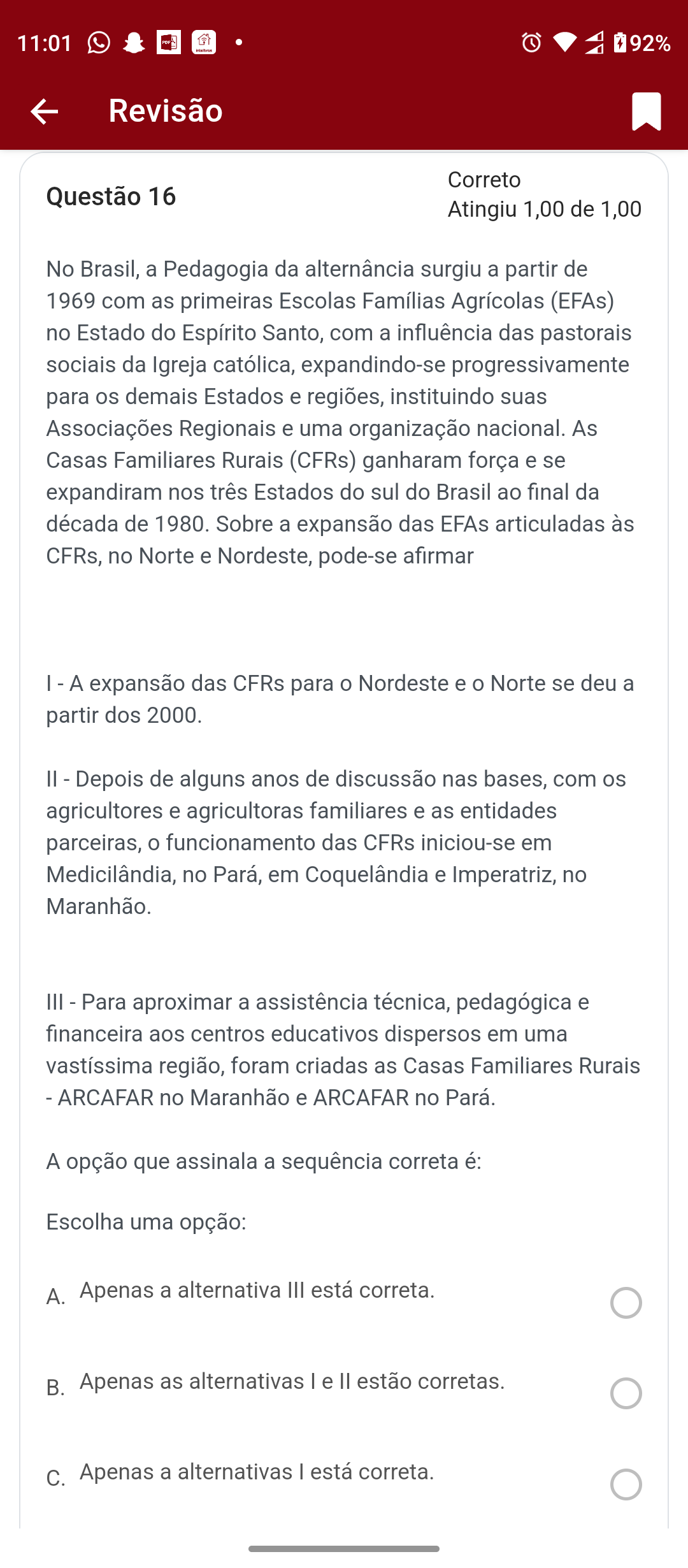 11:01 92% Revisão Correto Questão 16 Atingiu 1,00 de 1,00 No Brasil, a Pedagogia da alternância surgiu a partir de 1969 com as primeiras Escolas Famílias Agrícolas (EFAs) no Estado do Espírito Santo, com a influência das pastorais sociais da Igreja católica, expandindo-se progressivamente para os demais Estados e regiões, instituindo suas Associações Regionais e uma organização nacional. As Casas Familiares Rurais (CFRs) ganharam força e se expandiram nos três Estados do sul do Brasil ao final da década de 1980. Sobre a expansão das EFAs articuladas às CFRs, no Norte e Nordeste, pode-se afirmar - A expansão das CFRs para o Nordeste e o Norte se deu a partir dos 2000. - Depois de alguns anos de discussão nas bases, com os agricultores e agricultoras familiares e as entidades parceiras, o funcionamento das CFRs iniciou-se em Medicilândia, no Pará, em Coquelândia e Imperatriz, no Maranhão. III - Para aproximar a assistência técnica, pedagógica e financeira aos centros educativos dispersos em uma vastíssima região, foram criadas as Casas Familiares Rurais - ARCAFAR no Maranhão e ARCAFAR no Pará. A opção que assinala a sequência correta é: Escolha uma opção: A. Apenas a alternativa III está correta. B. Apenas as alternativas e estão corretas. C. Apenas a alternativas está correta.