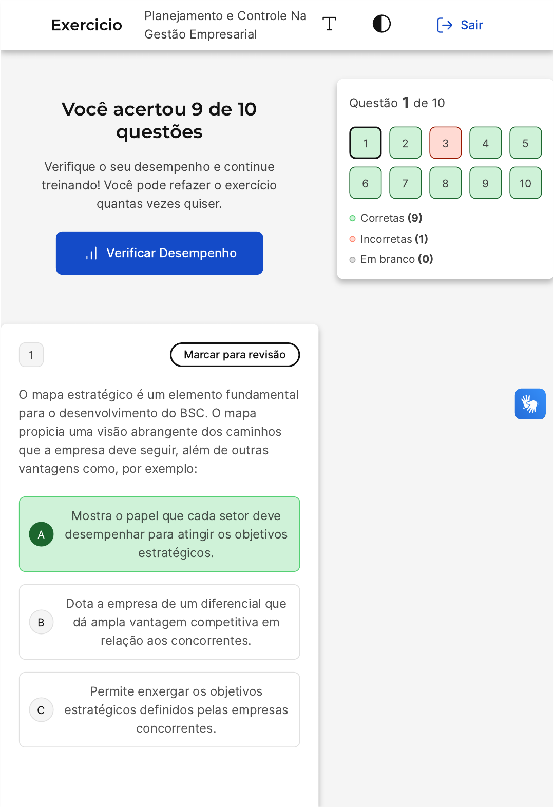 Você acertou 9 de 10 questões Verifique o seu desempenho e continue treinando! Você pode refazer o exercício quantas vezes quiser. Verificar Desempenho A B C 1 Marcar para revisão O mapa estratégico é um elemento fundamental para o desenvolvimento do BSC. O mapa propicia uma visão abrangente dos caminhos que a empresa deve seguir, além de outras vantagens como, por exemplo: Mostra o papel que cada setor deve desempenhar para atingir os objetivos estratégicos. Dota a empresa de um diferencial que dá ampla vantagem competitiva em relação aos concorrentes. Permite enxergar os objetivos estratégicos definidos pelas empresas concorrentes. Questão 1 de 10 Corretas �9� Incorretas �1� Em branco �0� 1 2 3 4 5 6 7 8 9 10 Exercicio Planejamento e Controle Na Gestão Empresarial Sair D E Define as quantidades que devem ser produzidas para atingir cada uma das metas estratégicas, bem como os responsáveis pelas mesmas. Blinda a empresa em relação a eventuais ameaças que venham a surgir. Resposta correta Parabéns, você selecionou a alternativa correta. Confira o gabarito comentado! Gabarito Comentado O mapa estratégico é uma ferramenta de planejamento que oferece uma visão completa e integrada dos objetivos estratégicos de uma empresa. Ele é fundamental para o desenvolvimento do Balanced Scorecard �BSC�, uma metodologia de gestão que visa alinhar as ações da empresa com sua visão e estratégia. A alternativa correta é a letra A, pois o mapa estratégico realmente mostra o papel que cada setor deve desempenhar para atingir os objetivos estratégicos. Ele ajuda a definir as responsabilidades de cada setor e a entender como cada um contribui para o alcance dos objetivos gerais da empresa. Portanto, o mapa estratégico não apenas fornece uma visão abrangente dos caminhos que a empresa deve seguir, mas também facilita o entendimento dos objetivos da empresa, permite visualizar a relação de causa e efeito entre os objetivos estratégicos e A B C D E ajuda a definir os indicadores para cada um dos objetivos estratégicos. 2 Marcar para revisão O Ciclo PDCA deve ser necessariamente executado em quatro etapas consecutivas e distintas, cada uma com uma função específica. Em que etapa deve-se identificar os problemas que precisam ser resolvidos? Planejamento Execução Verificação Ação Compensação Resposta correta Parabéns, você selecionou a alternativa correta. Confira o gabarito comentado! Gabarito Comentado No Ciclo PDCA, a etapa de "Planejamento" é onde se identificam os problemas que precisam ser resolvidos. Nesta fase, os gestores dedicam-se a estabelecer os objetivos, definir as metas, atribuir A B C D E responsabilidades e estipular os prazos que devem ser cumpridos. Portanto, é nesta etapa que são definidos alguns dos principais elementos que caracterizam o processo de planejamento. A alternativa correta é a "A", que corresponde ao "Planejamento". 3 Marcar para revisão Um dos procedimentos iniciais para aplicação do BSC é o estabelecimento das estratégias e dos objetivos. Esses elementos são derivados Do desempenho obtido no exercício anterior. Do desdobramento das metas. Das diferenças entre previsto e realizado. Do que foi estabelecido no plano de ações. Da tradução da visão de futuro. Resposta incorreta Opa! A alternativa correta é a letra E. Confira o gabarito comentado! Gabarito Comentado A B O Balanced Scorecard �BSC� é uma ferramenta de gestão que visa traduzir a visão e a estratégia das empresas em um conjunto abrangente de medidas de desempenho. No processo de aplicação do BSC, o estabelecimento das estratégias e dos objetivos é um dos procedimentos iniciais. Esses elementos são derivados da tradução da visão de futuro da empresa. Isso significa que a visão de futuro da empresa é traduzida em estratégias e objetivos específicos, que servirão como base para a medição e gestão do desempenho. Portanto, a alternativa correta é a E� "Da tradução da visão de futuro". 4 Marcar para revisão Uma cadeia de restaurantes está revisando seu planejamento estratégico para se adaptar à crescente demanda por opções de alimentos saudáveis. Eles estão considerando várias abordagens, incluindo a reformulação do menu e a parceria com fornecedores locais. Qual é a melhor estratégia para a cadeia de restaurantes atender à demanda por alimentos saudáveis? Expandir as operações para novas localidades. Reduzir os preços dos itens existentes no menu. C D E Reformular o menu incluindo opções saudáveis. Intensificar as estratégias de marketing online. Focar exclusivamente em entregas rápidas. Resposta correta Parabéns, você selecionou a alternativa correta. Confira o gabarito comentado! Gabarito Comentado A escolha mais adequada é reformular o menu para incluir opções saudáveis. Esta ação está diretamente alinhada com a necessidade de se adaptar à crescente demanda por alimentos saudáveis, atendendo às expectativas dos consumidores atuais sem desviar do core business da empresa. 5 Marcar para revisão Uma empresa de manufatura está planejando expandir suas operações, incluindo a adoção de automação para aumentar a produção. Este plano busca melhorar a eficiência operacional, mantendo a qualidade dos produtos fabricados. Qual é o foco principal da adoção de automação pela empresa de manufatura? A B C D E Redução significativa da força de trabalho. Aumento da diversidade de produtos oferecidos. Melhoria na eficiência da produção. Expansão para novos mercados geográficos. Redução dos custos de marketing. Resposta correta Parabéns, você selecionou a alternativa correta. Confira o gabarito comentado! Gabarito Comentado O foco principal da implementação da automação na empresa de manufatura é a melhoria na eficiência da produção. Isso permite que a empresa aumente sua capacidade de produção mantendo ou até melhorando a qualidade dos produtos, o qu