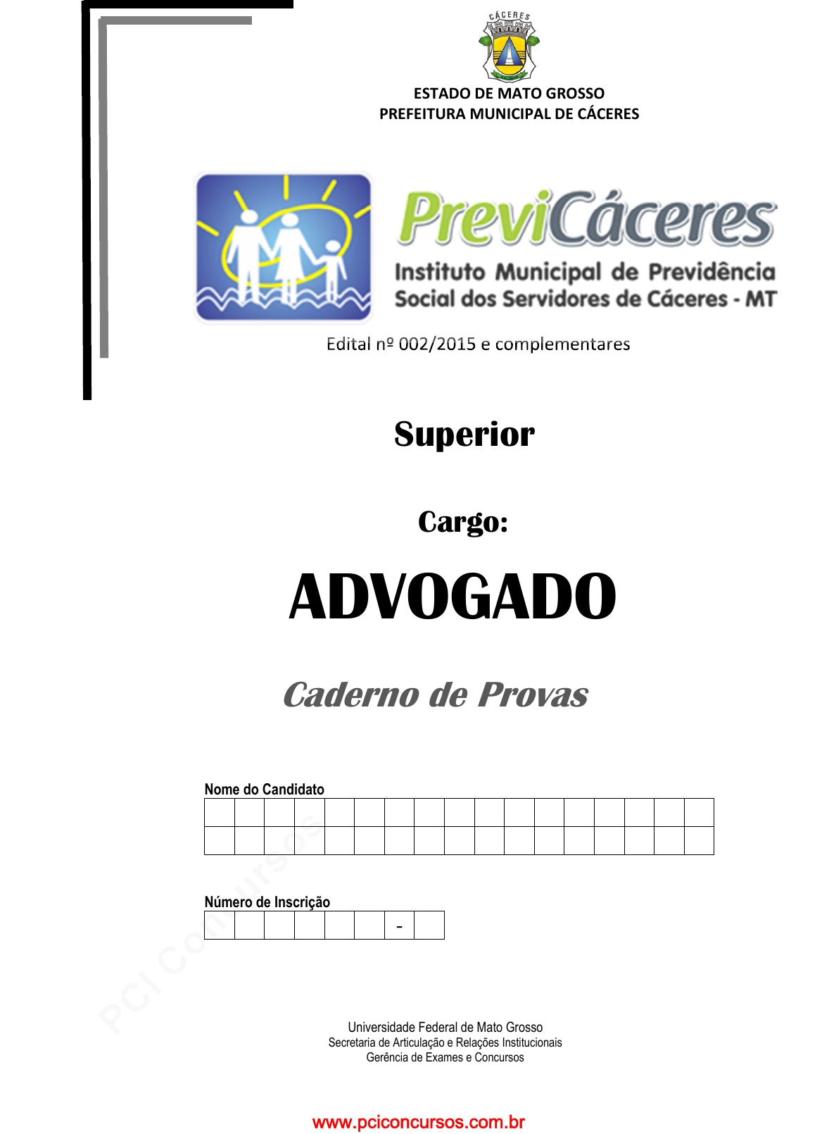 pcimarkpci MDAwMDowMDAwOjAwMDA6MDAwMDowMDAwOmZmZmY6YjViZjozZTlj:VHVlLCAxMSBNYXIgMjAyNSAxNToyNzo1OSAtMDMwMA== www.pciconcursos.com.br ESTADO DE MATO GROSSO PREFEITURA MUNICIPAL DE CÁCERES Superior Caderno de Provas Nome do Candidato Número de Inscrição - Cargo: ADVOGADO Universidade Federal de Mato Grosso Secretaria de Articulação e Relações Institucionais Gerência de Exames e Concursos www.pciconcursos.com.br pcimarkpci MDAwMDowMDAwOjAwMDA6MDAwMDowMDAwOmZmZmY6YjViZjozZTlj:VHVlLCAxMSBNYXIgMjAyNSAxNToyNzo1OSAtMDMwMA== www.pciconcursos.com.br I N S T R U Ç Õ E S LEIA COM ATENÇÃO 1. Este Caderno de Provas, com páginas numeradas de 1 a 15, é constituído de: � uma Prova Objetiva com 40 (quarenta) questões de múltipla escolha, cada uma com quatro alternativas, assim distribuídas: • 01 a 10 – Língua Portuguesa • 11 a 15 – Informática • 16 a 20 – Legislação Básica • 21 a 40 – Conhecimentos Específicos � uma Prova de Redação. 2. Caso o Caderno de Provas esteja incompleto ou tenha qualquer defeito de impressão, solicite ao fiscal que o substitua. 3. Sobre a Marcação do Cartão de Respostas As respostas das questões da Prova Objetiva devem ser, obrigatoriamente, transcritas com caneta esferográfica de tinta azul ou preta não porosa, fabricada em material transparente, para o Cartão de Respostas, que será o único documento válido para correção. 3.1. Para cada questão existe apenas uma alternativa que a responde acertadamente. Para a marcação da alternativa escolhida no CARTÃO DE RESPOSTAS, pinte completamente o círculo correspondente. Exemplo: Suponha que para determinada questão a alternativa C seja a escolhida. N.º da Questão A B C D 3.2. Será invalidada a questão em que houver mais de uma marcação, marcação rasurada ou emendada, ou não houver marcação. 4. Na elaboração da Redação, poderá ser usada para rascunho a página 14 deste Caderno, mas o texto definitivo deverá ser transcrito na Folha de Redação. Use caneta esferográfica de tinta azul ou preta não porosa. 5. Todos os espaços em branco, neste caderno, podem ser utilizados para rascunho. 6. Não haverá substituição do CARTÃO DE RESPOSTAS e da FOLHA DE REDAÇÃO por erro do candidato. 7. A duração das Provas é 4 (quatro) horas, já incluído o tempo destinado ao preenchimento do CARTÃO DE RESPOSTAS da Prova Objetiva e da FOLHA DE REDAÇÃO da Prova de Redação. 8. Somente após decorridas 2 horas e 30 minutos do início das provas, o candidato poderá retirar-se da sala de provas. O candidato que insistir em sair da sala de provas antes de decorrido esse tempo deverá assinar Termo de Ocorrência declarando sua desistência do concurso. 9. Será permitida a saída de candidatos levando o Caderno de Provas somente quando estiver faltando 30 minutos para o término das provas. 10. Na página 15 deste Caderno de Provas, encontra-se a Folha de Anotação do Candidato, a qual poderá ser utilizada para a transcrição das respostas das questões objetivas. Essa folha poderá ser levada pelo candidato para posterior conferência com o gabarito somente após decorridas 2 horas e 30 minutos do início das provas. 11. Terminadas as provas, o candidato deverá, obrigatoriamente, entregar ao fiscal este Caderno de Provas, o CARTÃO DE RESPOSTAS e a FOLHA DE REDAÇÃO. www.pciconcursos.com.br pcimarkpci MDAwMDowMDAwOjAwMDA6MDAwMDowMDAwOmZmZmY6YjViZjozZTlj:VHVlLCAxMSBNYXIgMjAyNSAxNToyNzo1OSAtMDMwMA== www.pciconcursos.com.br 1/15 – Concurso Público PREVI-Cáceres – ADVOGADO – SUPERIOR PROVA OBJETIVA Língua Portuguesa INSTRUÇÃO: Leia o texto e responda às questões de 01 a 03. De 11 de julho de 2013 para cá, o juiz Sérgio Moro tornou-se uma celebridade nacional. Não há semana que não tenha convite para falar em algum evento, e a inclusão de seu nome na lista de palestrantes é garantia de casa cheia. Não há lugar público – restaurante, aeroporto, fila de táxi – em que ele não seja aplaudido por populares. Em 2015, sua figura ganhou ainda mais preeminência em função do contraste entre sua distinção pública e as mentiras e pontapés e manobras e bandalheiras gerais que cobriram Brasília de escárnio. Com a notoriedade, Moro teve de abandonar o hábito de ir para o trabalho de bicicleta. Está um pouco mais gordo e, apesar da timidez pétrea, um pouco mais desinibido. Ganhou traquejo no trato com a imprensa, que sempre o cerca nos eventos públicos com flashes e perguntas, e também se habituou ao assédio do público, que o cumula de pedidos de selfies e autógrafos. (Revista Veja, ed. 2.458.) QUESTÃO 01 Sobre o trecho: Em 2015, sua figura ganhou ainda mais preeminência em função do contraste entre sua distinção pública e as mentiras e pontapés e manobras e bandalheiras gerais que cobriram Brasília de escárnio., marque V para as afirmativas verdadeiras e F para as falsas. ( ) Quando uma circunstância é empregada no início da frase, fora de sua posição canônica, deve-se isolá-la com uma vírgula, a exemplo de Em 2015,. ( ) Os elementos coesivos sua e que retomam o mesmo sentido anteriormente citado no texto: o juiz Sérgio Moro. ( ) Exceto a primeira ocorrência da palavra e, as demais foram usadas intencionalmente repetidas para enfatizar o encadeamento de ações vergonhosas. ( ) A palavra mais precedida de ainda forma uma expressão adverbial que enfatiza sobremaneira o modo de ser preeminente do juiz. Assinale a sequência correta. (A) V, V, F, F (B) F, F, F, V (C) F, V, V, F (D) V, F, V, V QUESTÃO 02 Muitas locuções adjetivas, ao serem substituídas por adjetivos, tomam a forma erudita, a exemplo de pétrea, usado no texto, cuja locução é de pedra. Assinale a alternativa em que a locução adjetiva NÃO apresenta correspondente adjetivo na forma erudita. (A) de chuva → pluvial (B) de cinza → cinéreo (C) de guerra → bélico (D) de hospital → hospitalar QUESTÃO 03 Nos trechos lugar público, distin